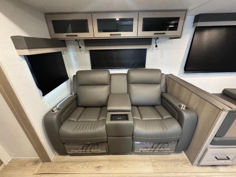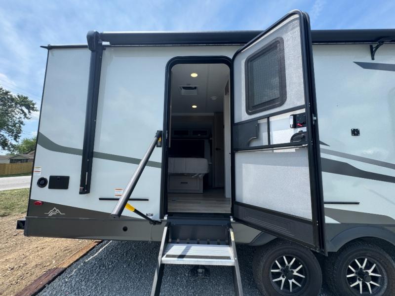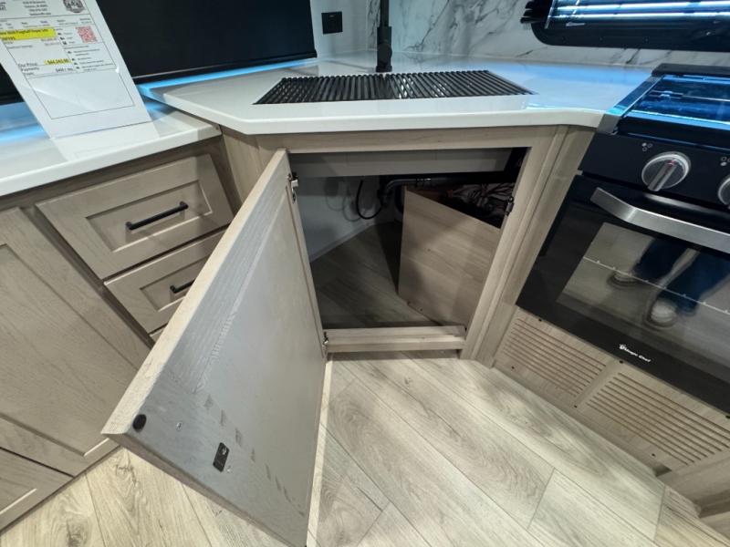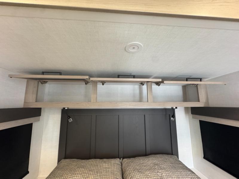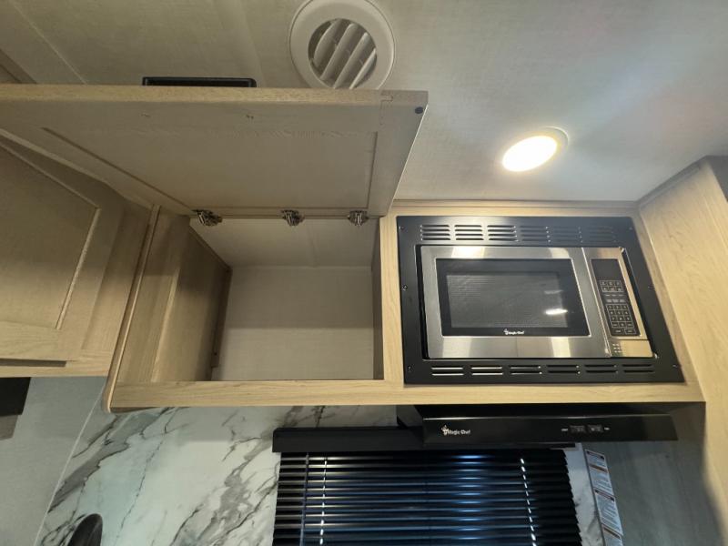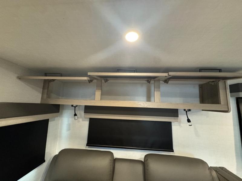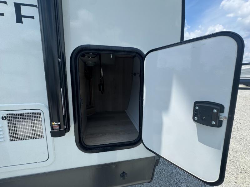 This is the perfect couples trailer with a spacious living and kitchen area and a rear bedroom which includes the second exterior entry/exit door! The bedroom also provides a slide out queen bed, a wardrobe and an optional TV, plus windows for great views and access to the double entry bathroom. The front kitchen gives the cook counter space and cabinetry for dishes and such, plus all the appliances needed to make warm meals and store leftovers. You can dine at the booth dinette, relax on the 67" theater seating and watch the Smart TV while enjoying the fireplace.