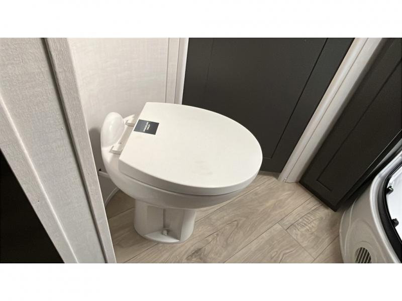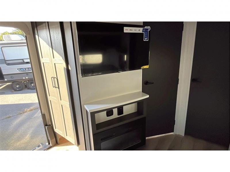 This is the perfect couples trailer with a spacious living and kitchen area and a rear bedroom which includes the second exterior entry/exit door! The bedroom also provides a slide out queen bed, a wardrobe and an optional TV, plus windows for great views and access to the double entry bathroom. The front kitchen gives the cook counter space and cabinetry for dishes and such, plus all the appliances needed to make warm meals and store leftovers. You can dine at the booth dinette, relax on the 67" theater seating and watch the Smart TV while enjoying the fireplace.