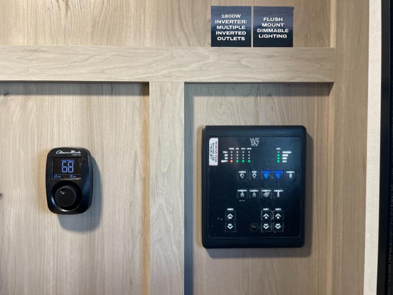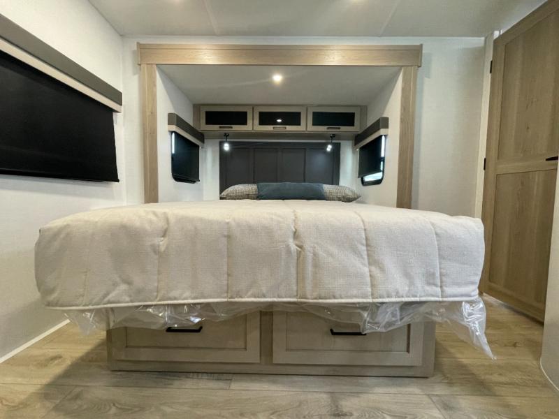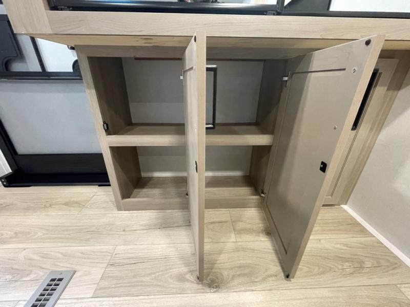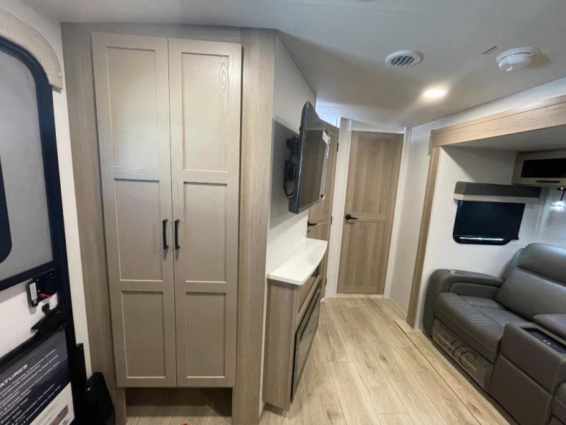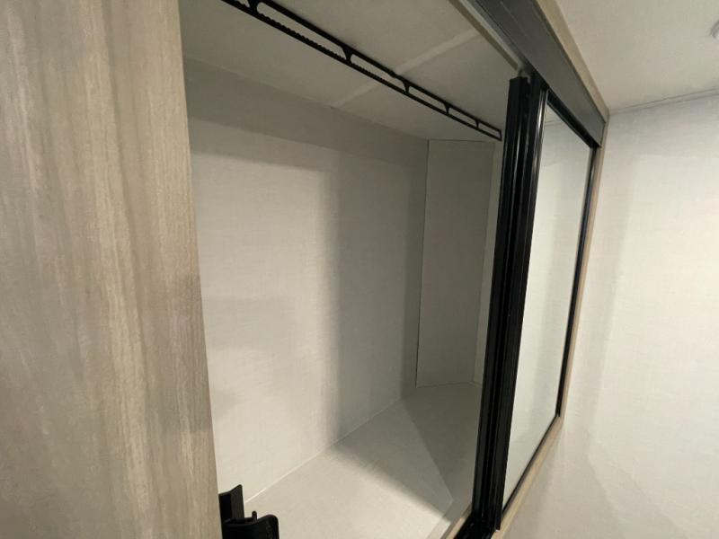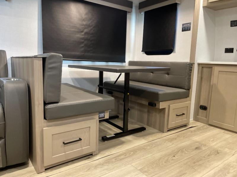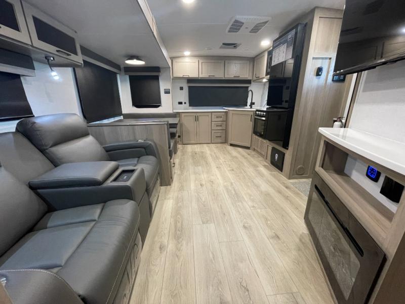 This is the perfect couples trailer with a spacious living and kitchen area and a rear bedroom which includes the second exterior entry/exit door! The bedroom also provides a slide out queen bed, a wardrobe and an optional TV, plus windows for great views and access to the double entry bathroom. The front kitchen gives the cook counter space and cabinetry for dishes and such, plus all the appliances needed to make warm meals and store leftovers. You can dine at the booth dinette, relax on the 67" theater seating and watch the Smart TV while enjoying the fireplace.