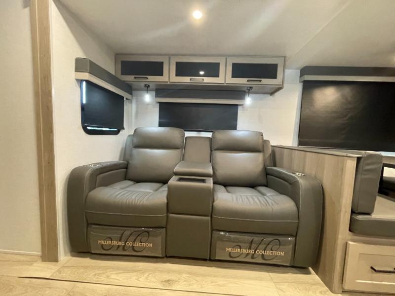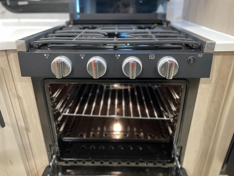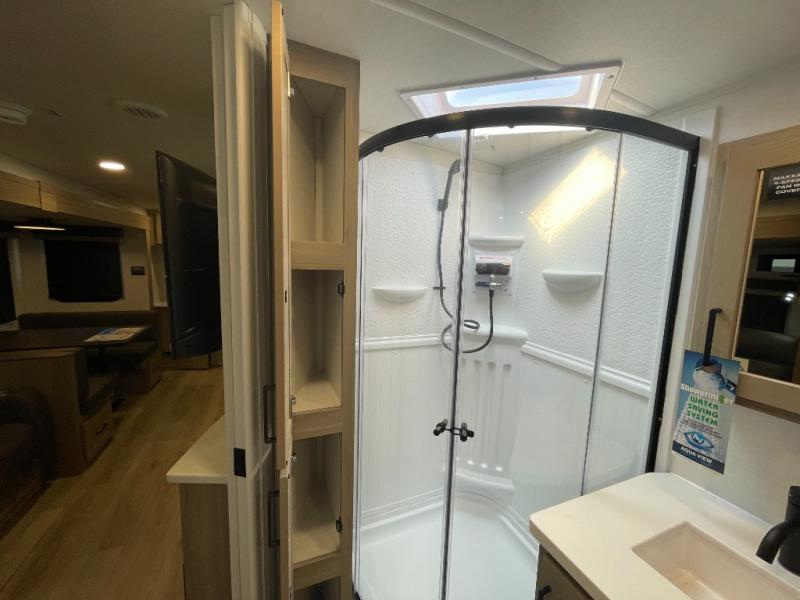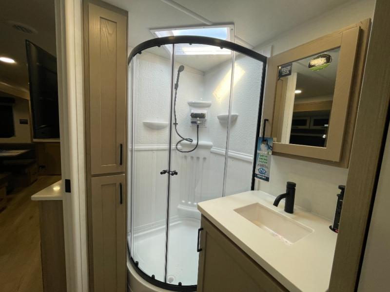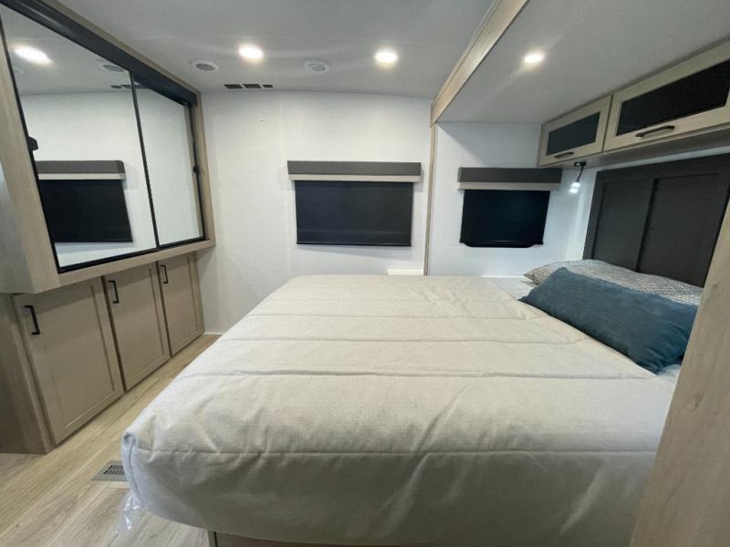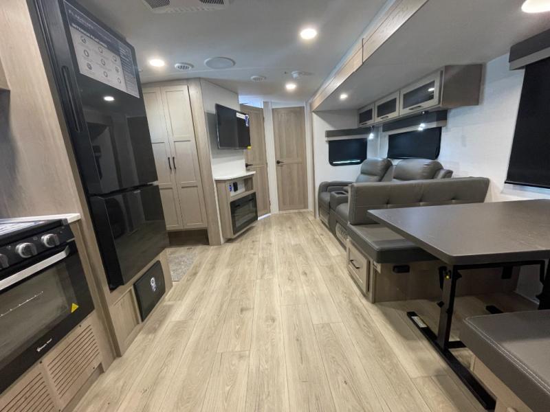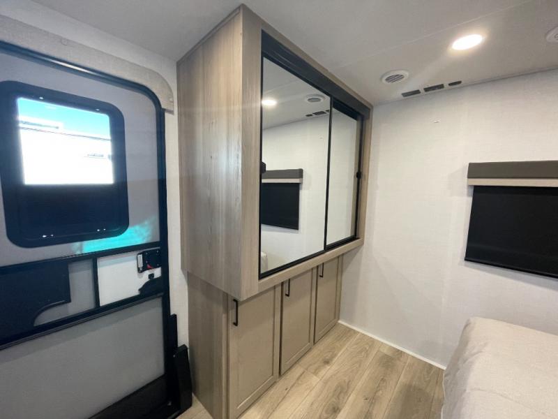 This is the perfect couples trailer with a spacious living and kitchen area and a rear bedroom which includes the second exterior entry/exit door! The bedroom also provides a slide out queen bed, a wardrobe and an optional TV, plus windows for great views and access to the double entry bathroom. The front kitchen gives the cook counter space and cabinetry for dishes and such, plus all the appliances needed to make warm meals and store leftovers. You can dine at the booth dinette, relax on the 67" theater seating and watch the Smart TV while enjoying the fireplace.