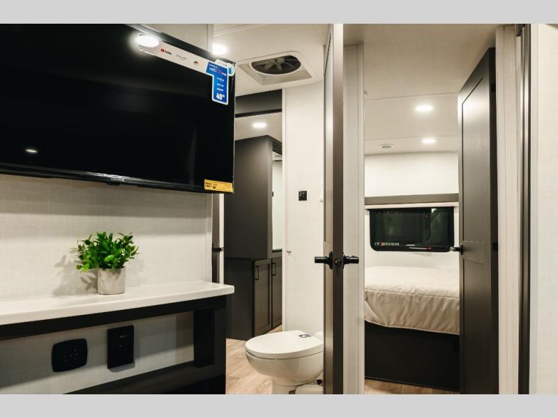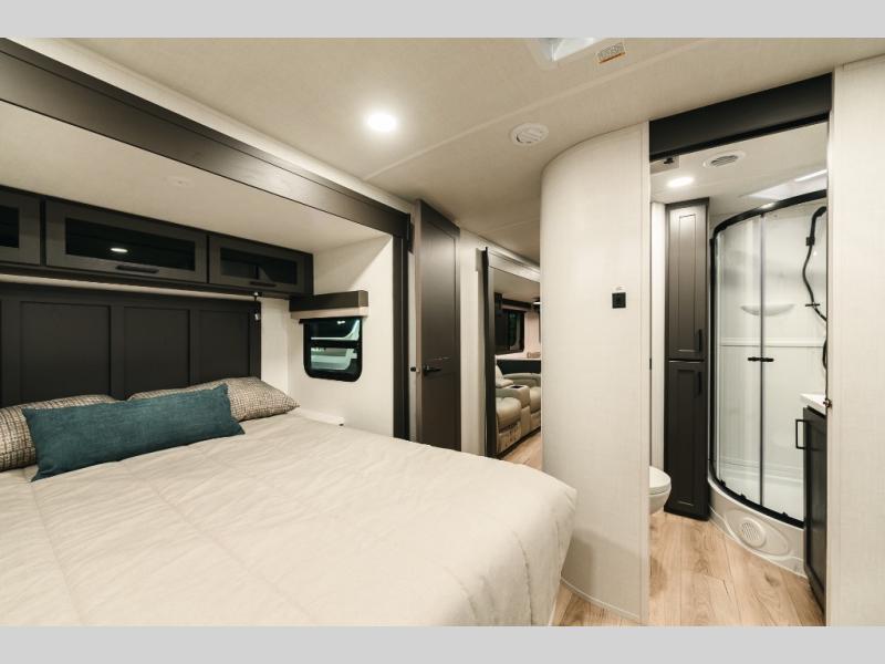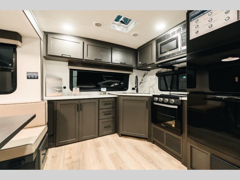 This is the perfect couples trailer with a spacious living and kitchen area and a rear bedroom which includes the second exterior entry/exit door! The bedroom also provides a slide out queen bed, a wardrobe and an optional TV, plus windows for great views and access to the double entry bathroom. The front kitchen gives the cook counter space and cabinetry for dishes and such, plus all the appliances needed to make warm meals and store leftovers. You can dine at the booth dinette, relax on the 67" theater seating and watch the Smart TV while enjoying the fireplace.