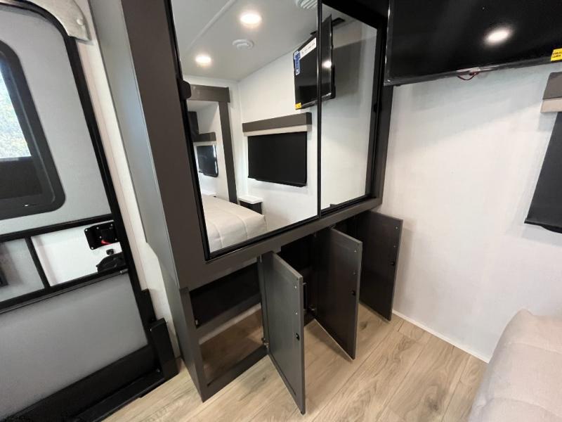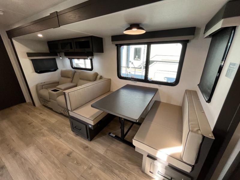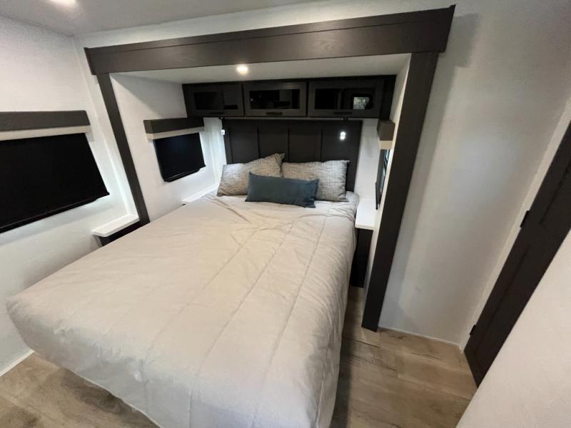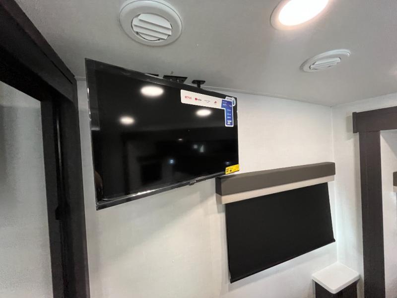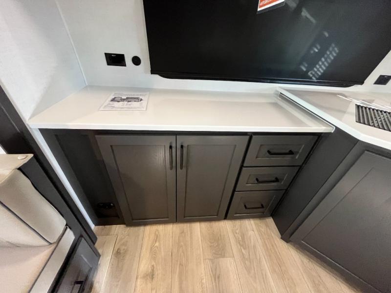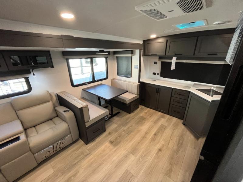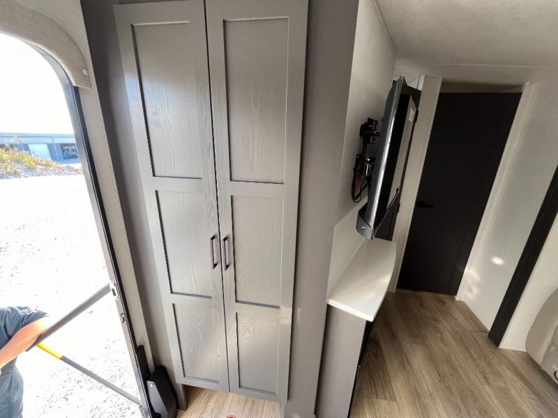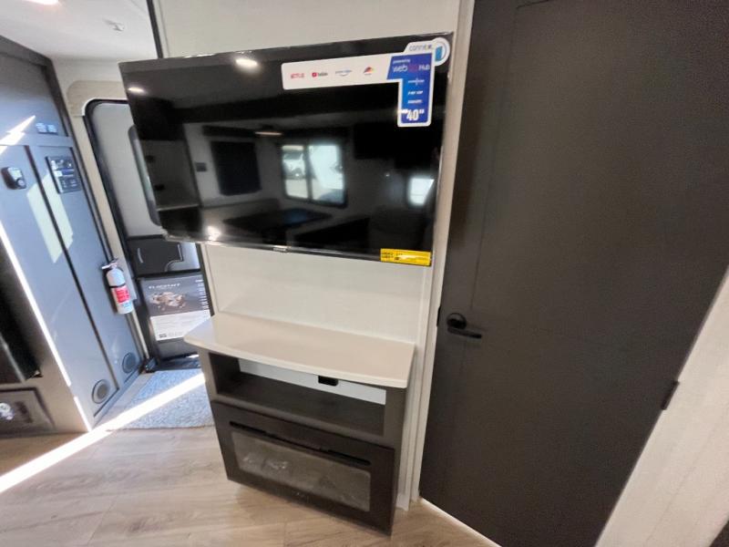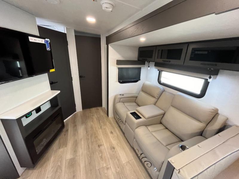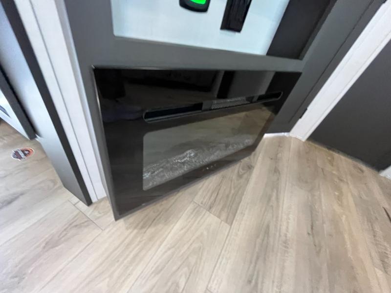 This is the perfect couples trailer with a spacious living and kitchen area and a rear bedroom which includes the second exterior entry/exit door! The bedroom also provides a slide out queen bed, a wardrobe and an optional TV, plus windows for great views and access to the double entry bathroom. The front kitchen gives the cook counter space and cabinetry for dishes and such, plus all the appliances needed to make warm meals and store leftovers. You can dine at the booth dinette, relax on the 67" theater seating and watch the Smart TV while enjoying the fireplace.