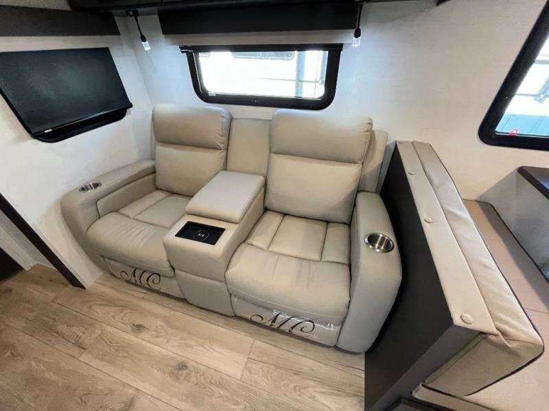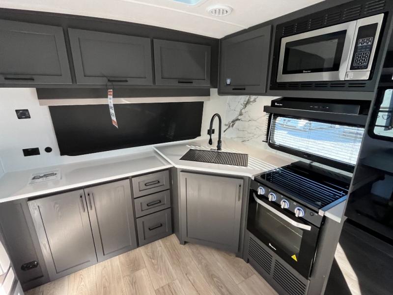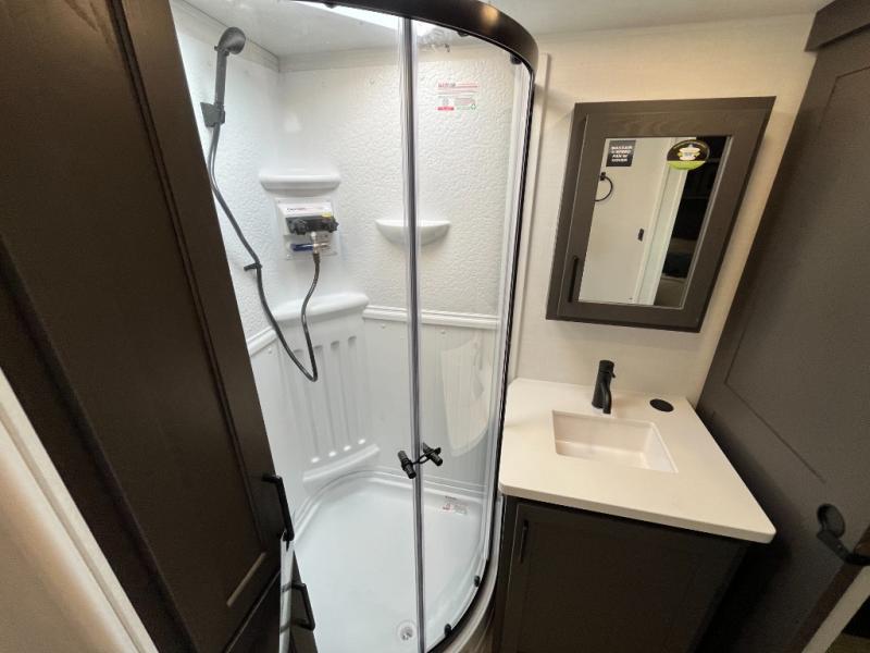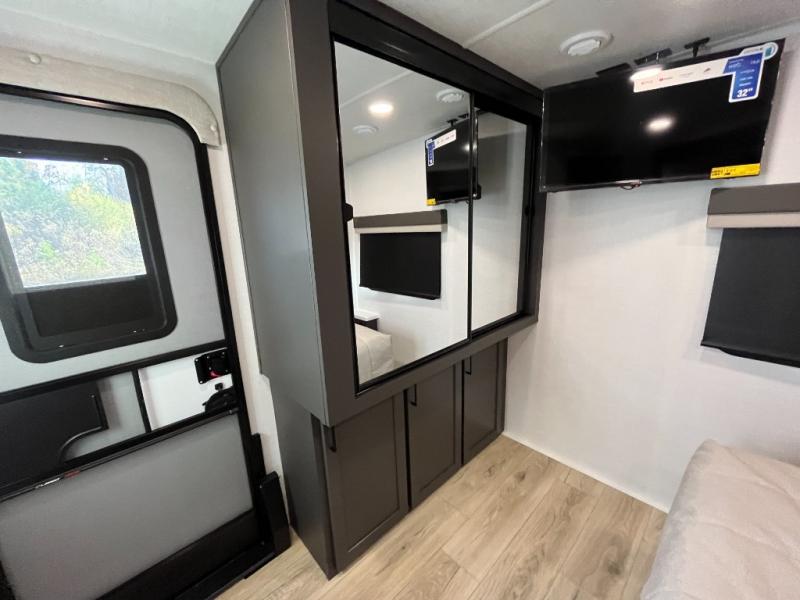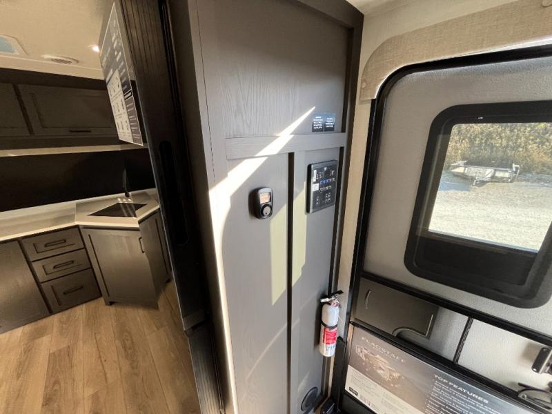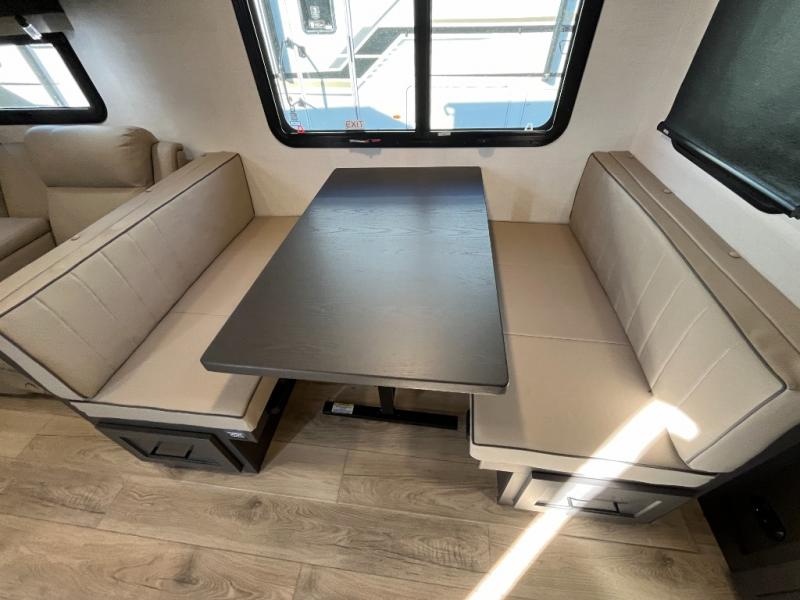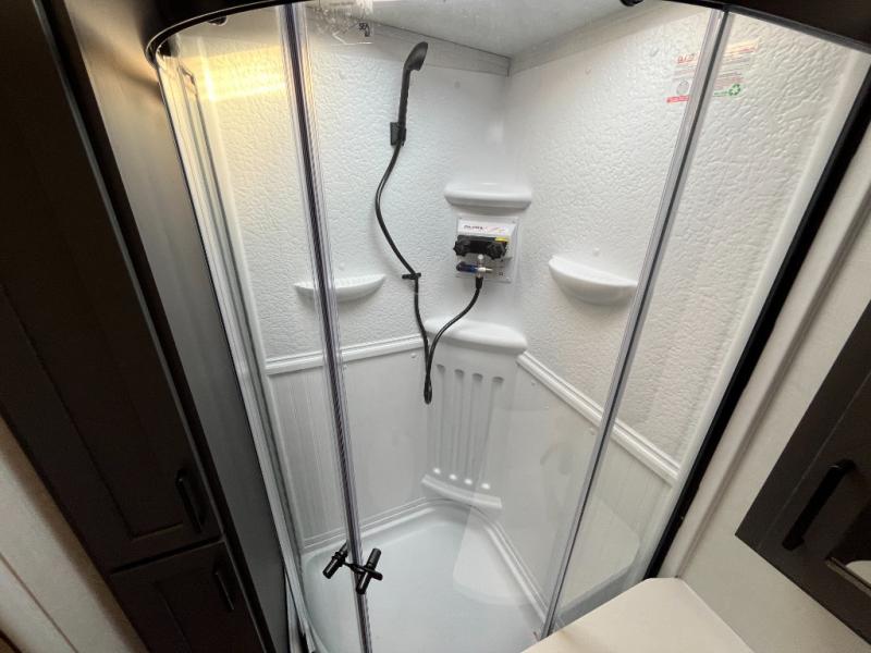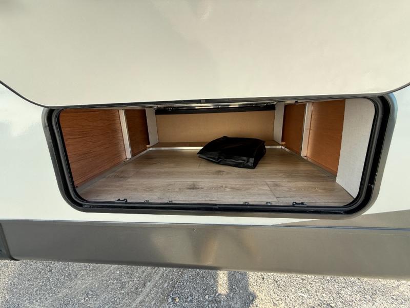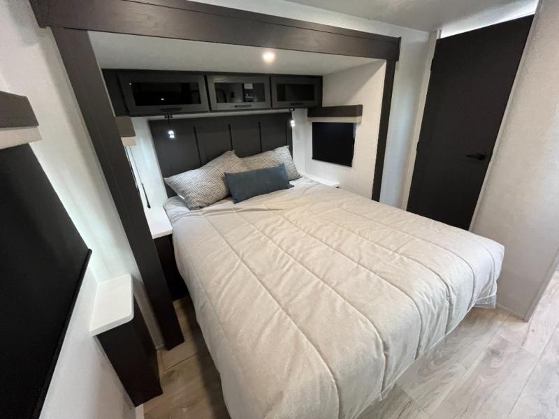 This is the perfect couples trailer with a spacious living and kitchen area and a rear bedroom which includes the second exterior entry/exit door! The bedroom also provides a slide out queen bed, a wardrobe and an optional TV, plus windows for great views and access to the double entry bathroom. The front kitchen gives the cook counter space and cabinetry for dishes and such, plus all the appliances needed to make warm meals and store leftovers. You can dine at the booth dinette, relax on the 67" theater seating and watch the Smart TV while enjoying the fireplace.