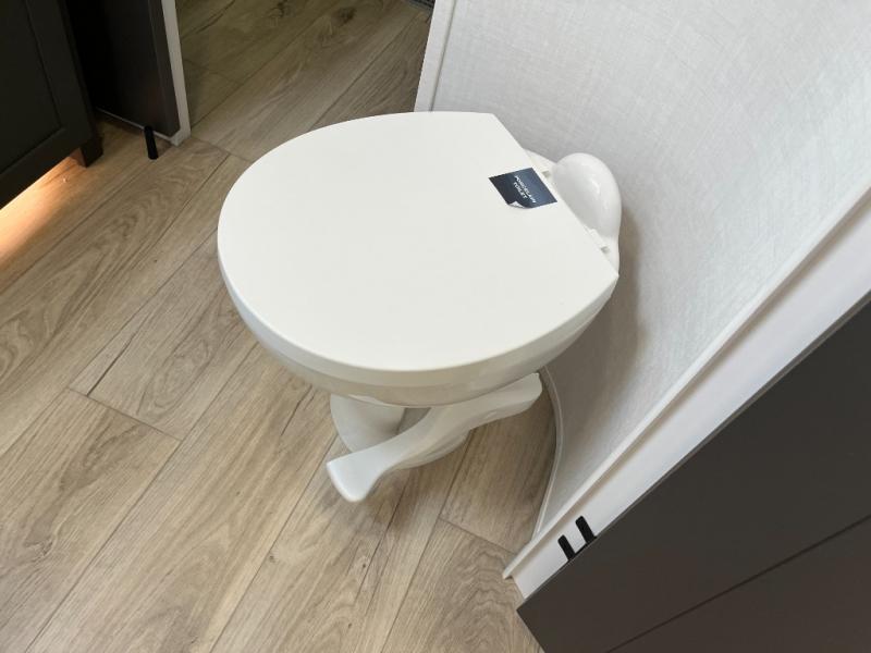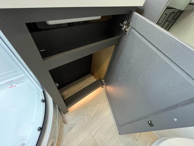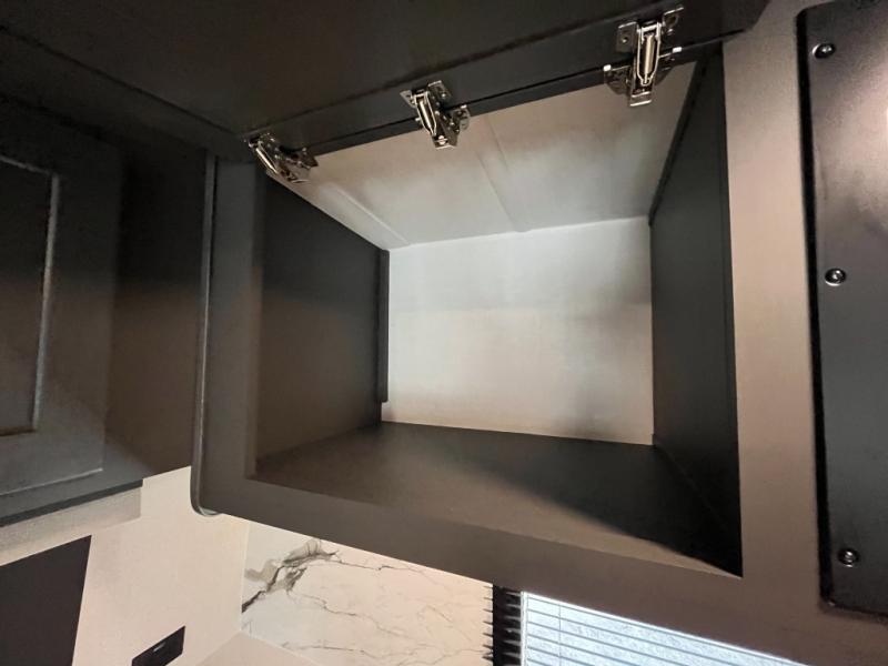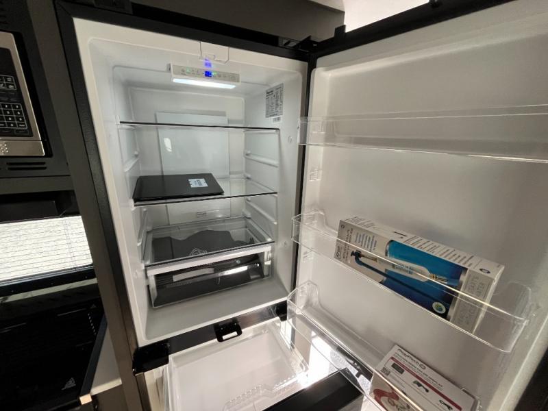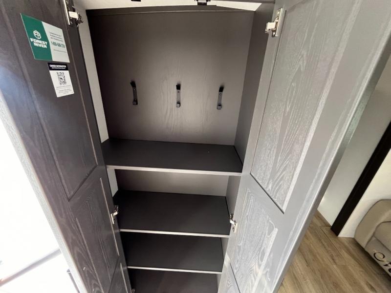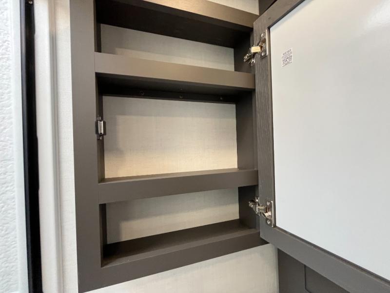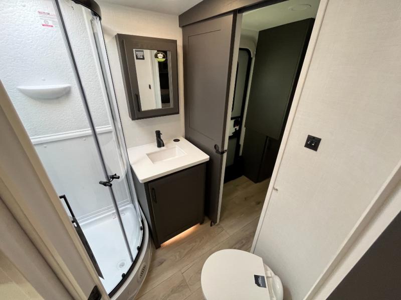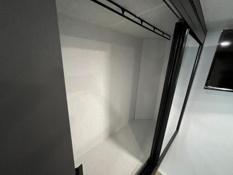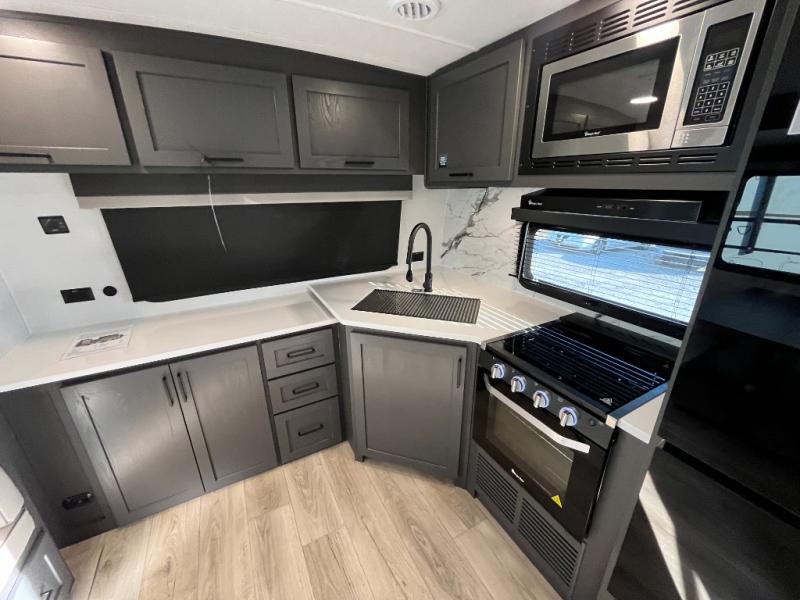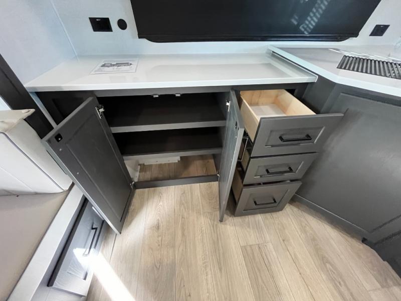 This is the perfect couples trailer with a spacious living and kitchen area and a rear bedroom which includes the second exterior entry/exit door! The bedroom also provides a slide out queen bed, a wardrobe and an optional TV, plus windows for great views and access to the double entry bathroom. The front kitchen gives the cook counter space and cabinetry for dishes and such, plus all the appliances needed to make warm meals and store leftovers. You can dine at the booth dinette, relax on the 67" theater seating and watch the Smart TV while enjoying the fireplace.