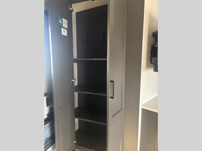 This is the perfect couples trailer with a spacious living and kitchen area and a rear bedroom which includes the second exterior entry/exit door! The bedroom also provides a slide out queen bed, a wardrobe and an optional TV, plus windows for great views and access to the double entry bathroom. The front kitchen gives the cook counter space and cabinetry for dishes and such, plus all the appliances needed to make warm meals and store leftovers. You can dine at the booth dinette, relax on the 67" theater seating and watch the Smart TV while enjoying the fireplace.