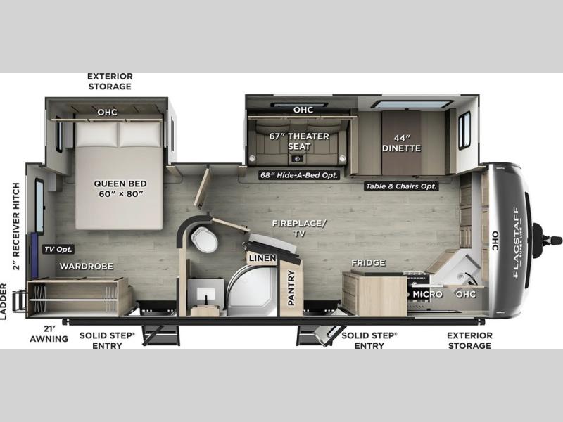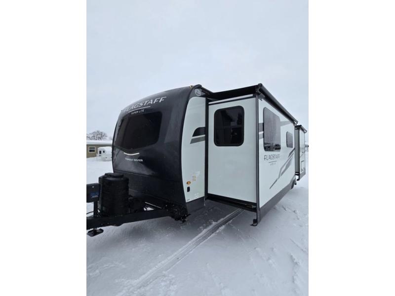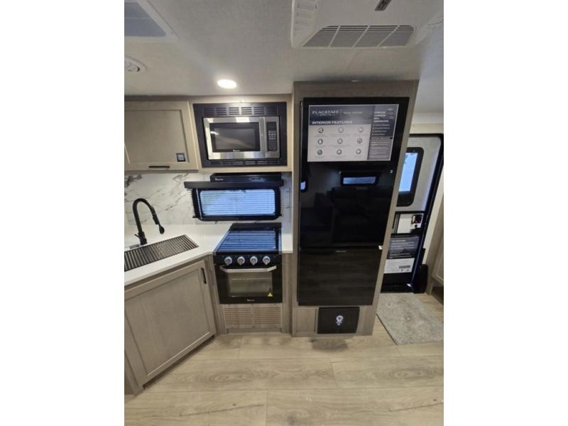 With any Flagstaff Super Lite travel trailer by Forest River, you can enjoy quality features with lightweight towing! The Climate Protection Package includes radiant foil in the front cap, underbelly, and slides, plus there are 12V thermostat-controlled heated tanks for added protection. The complete composite wall construction and 6-sided full-aluminum frame is ultra durable, and the RoadTech tire pressure monitoring adds safety. Each model also includes the Coast to Coast Package that comes with slam latch baggage doors, a high gloss fiberglass cap, Goodyear Endurance tires, plus a 200W solar panel with an optional additional 200W panel for more off grid capabilities. Inside, you'll love the roller shades, solid surface kitchen countertops, a shower miser system, and many more comforts!