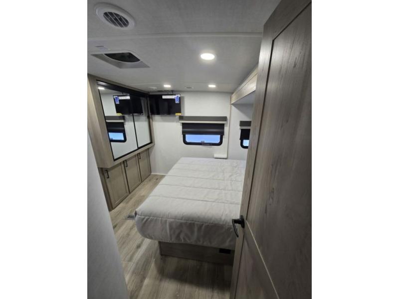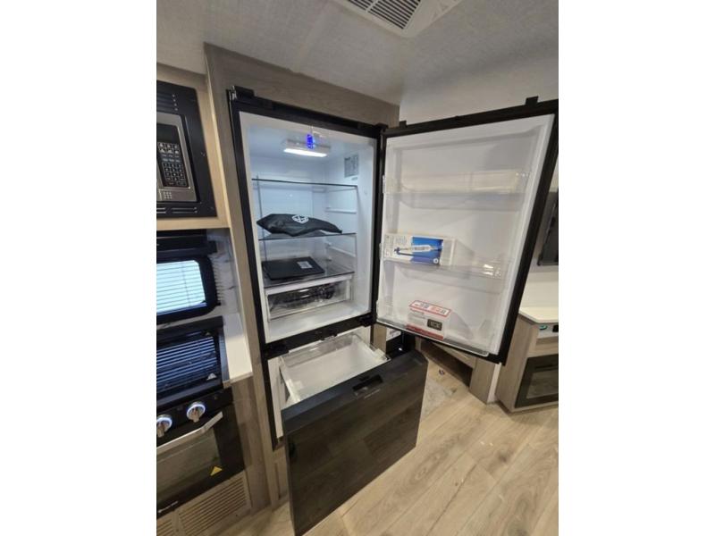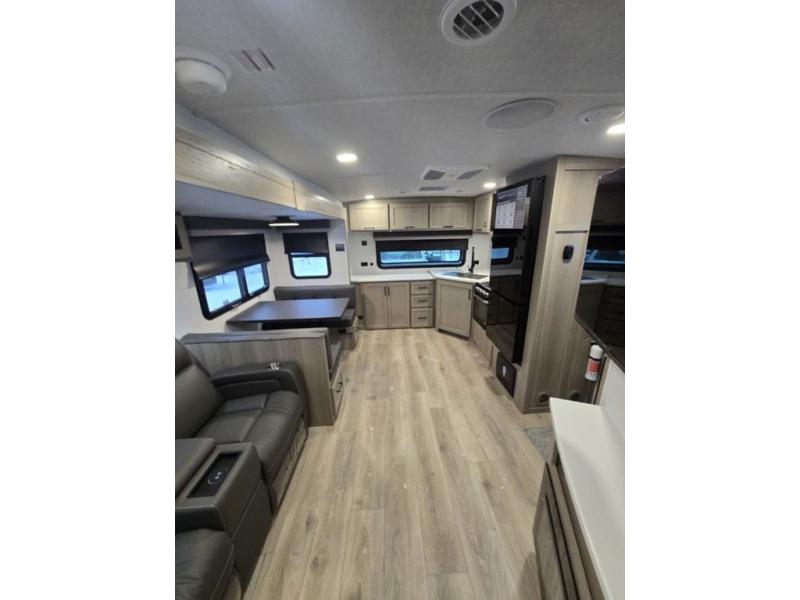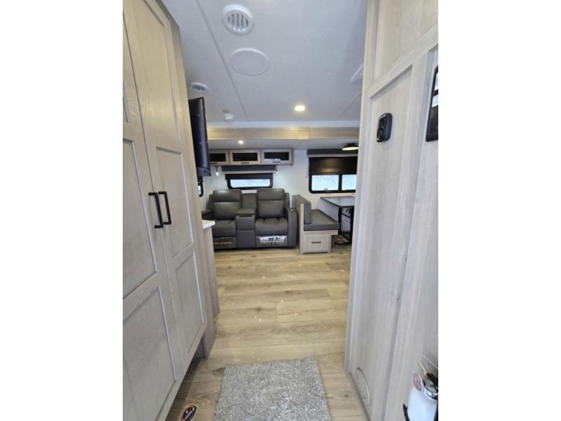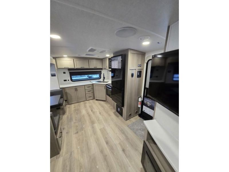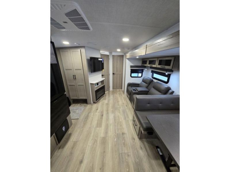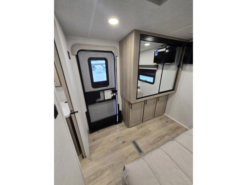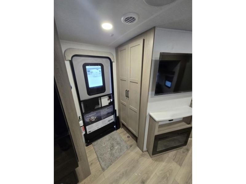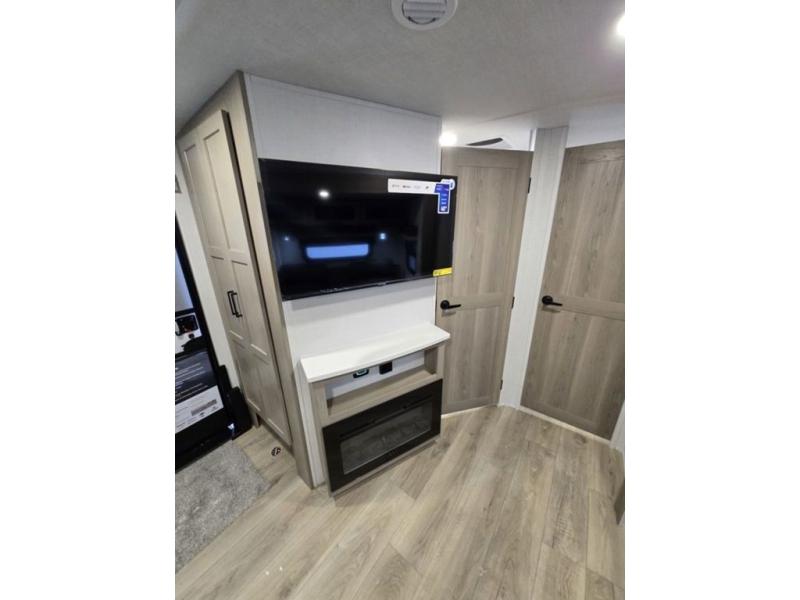This is the perfect couples trailer with a spacious living and kitchen area and a rear bedroom which includes the second exterior entry/exit door! The bedroom also provides a slide out queen bed, a wardrobe and an optional TV, plus windows for great views and access to the double entry bathroom. The front kitchen gives the cook counter space and cabinetry for dishes and such, plus all the appliances needed to make warm meals and store leftovers. You can dine at the booth dinette, relax on the 67" theater seating and watch the Smart TV while enjoying the fireplace.