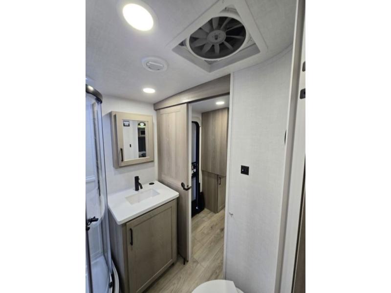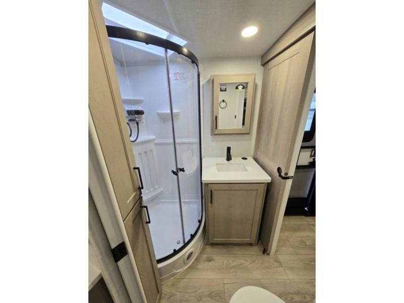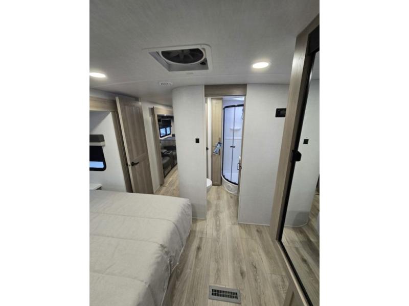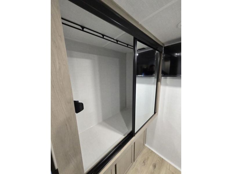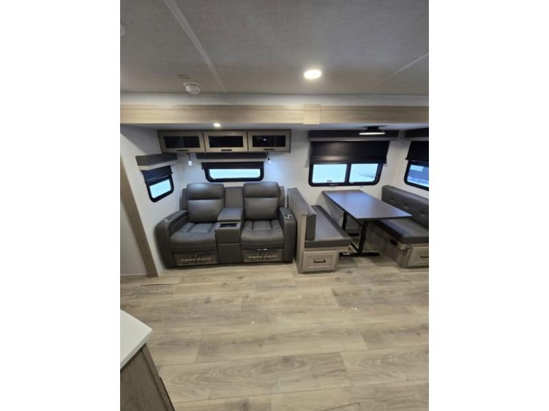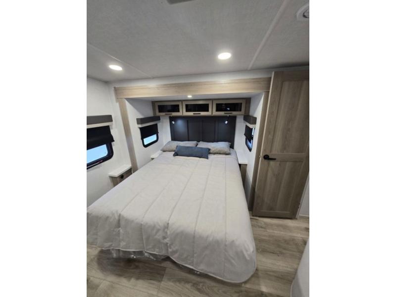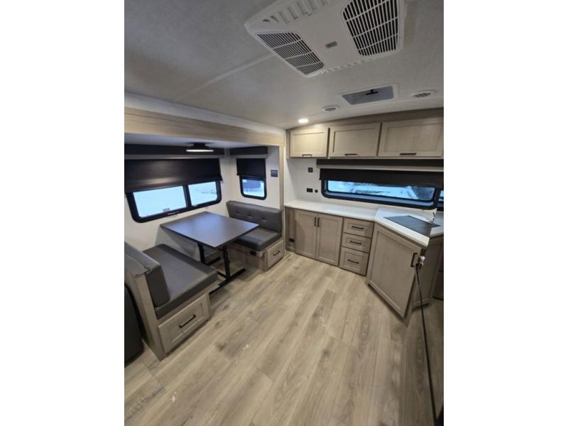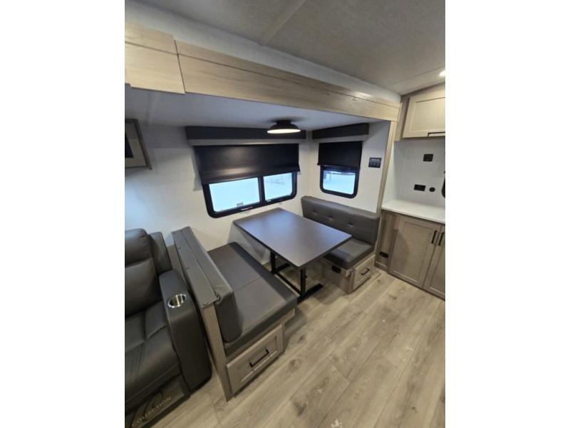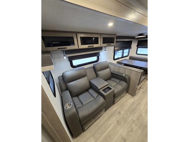 This is the perfect couples trailer with a spacious living and kitchen area and a rear bedroom which includes the second exterior entry/exit door! The bedroom also provides a slide out queen bed, a wardrobe and an optional TV, plus windows for great views and access to the double entry bathroom. The front kitchen gives the cook counter space and cabinetry for dishes and such, plus all the appliances needed to make warm meals and store leftovers. You can dine at the booth dinette, relax on the 67" theater seating and watch the Smart TV while enjoying the fireplace.