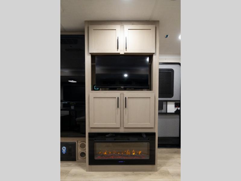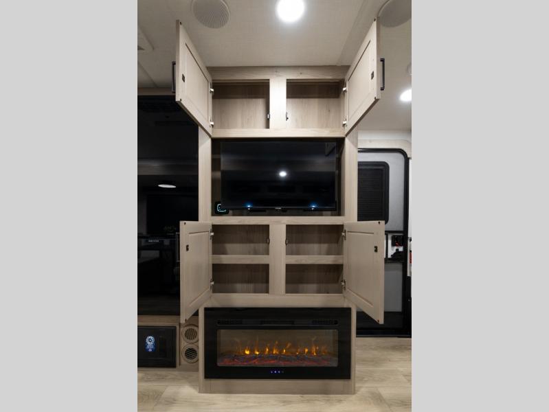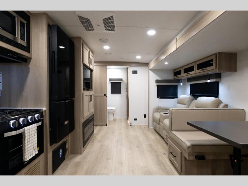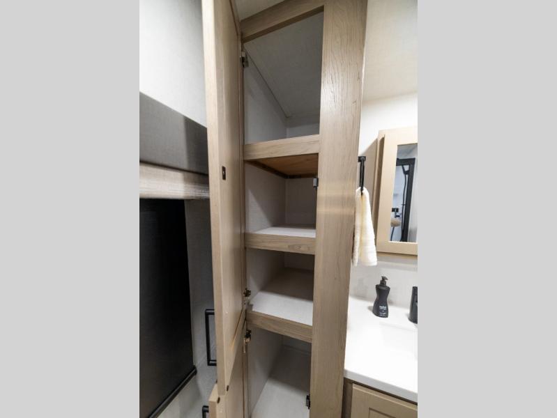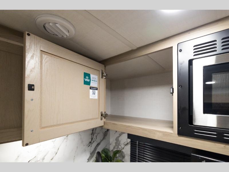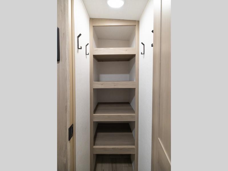 Enjoy inside comforts, and outside conveniences in this trailer. You can relax under the 21' power awning which offers an outdoor living area protected from the elements, and a pass-thru storage with an optional steel sliding tray gives you the option to easily access your gear. You'll find ample storage space inside as well, including a walk-in pantry by the entry door for convenience! The cook will have full amenities to make meals, and when you are ready to sleep, head to the front bedroom with a queen bed and plenty of storage, and a wardrobe slide out giving you more floor and storage space.