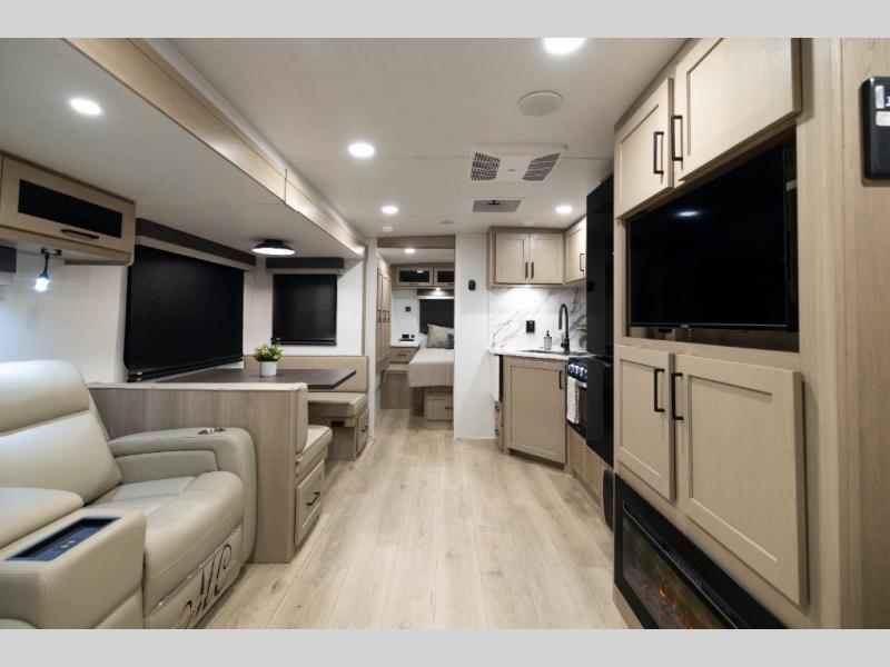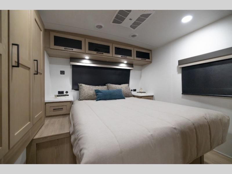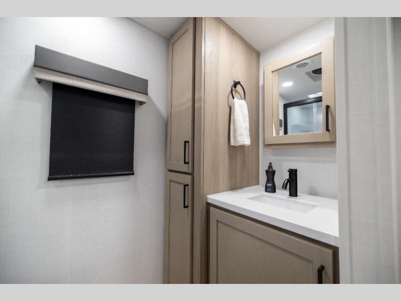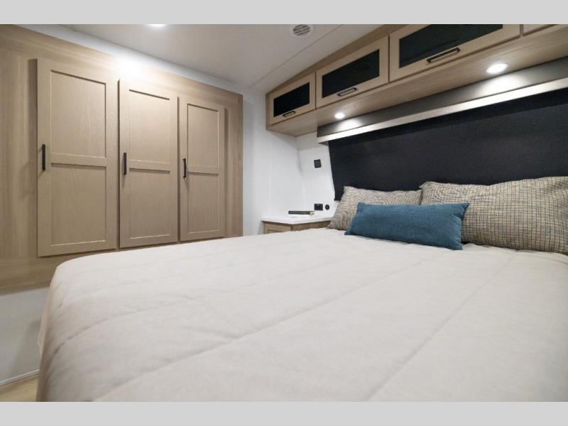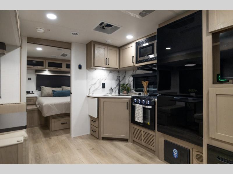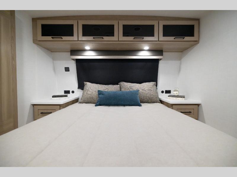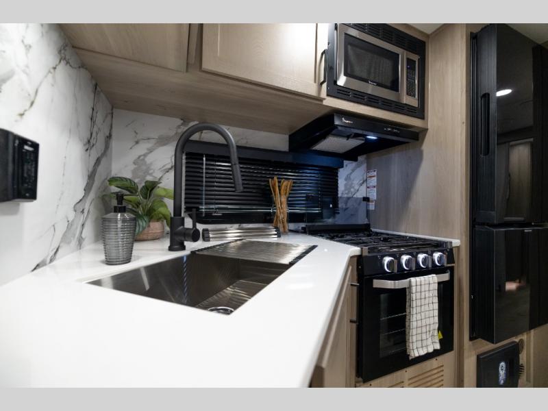 Enjoy inside comforts, and outside conveniences in this trailer. You can relax under the 21' power awning which offers an outdoor living area protected from the elements, and a pass-thru storage with an optional steel sliding tray gives you the option to easily access your gear. You'll find ample storage space inside as well, including a walk-in pantry by the entry door for convenience! The cook will have full amenities to make meals, and when you are ready to sleep, head to the front bedroom with a queen bed and plenty of storage, and a wardrobe slide out giving you more floor and storage space.
