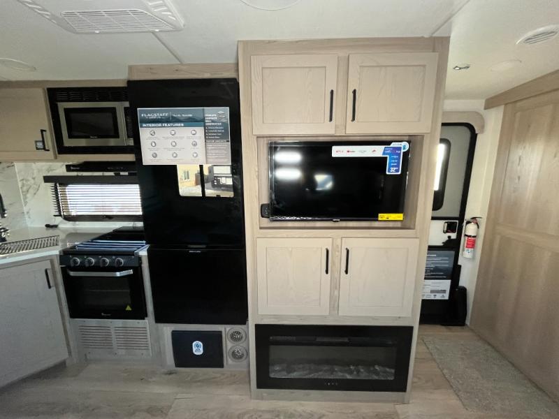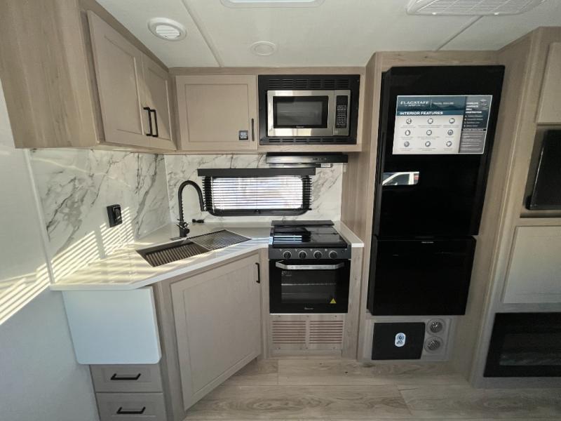 With any Flagstaff Super Lite travel trailer by Forest River, you can enjoy quality features with lightweight towing! The Climate Protection Package includes radiant foil in the front cap, underbelly, and slides, plus there are 12V thermostat-controlled heated tanks for added protection. The complete composite wall construction and 6-sided full-aluminum frame is ultra durable, and the RoadTech tire pressure monitoring adds safety. Each model also includes the Coast to Coast Package that comes with slam latch baggage doors, a high gloss fiberglass cap, Goodyear Endurance tires, plus a 200W solar panel with an optional additional 200W panel for more off grid capabilities. Inside, you'll love the roller shades, solid surface kitchen countertops, a shower miser system, and many more comforts!