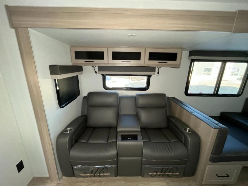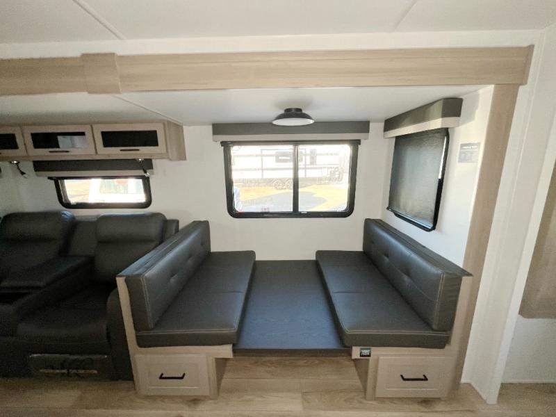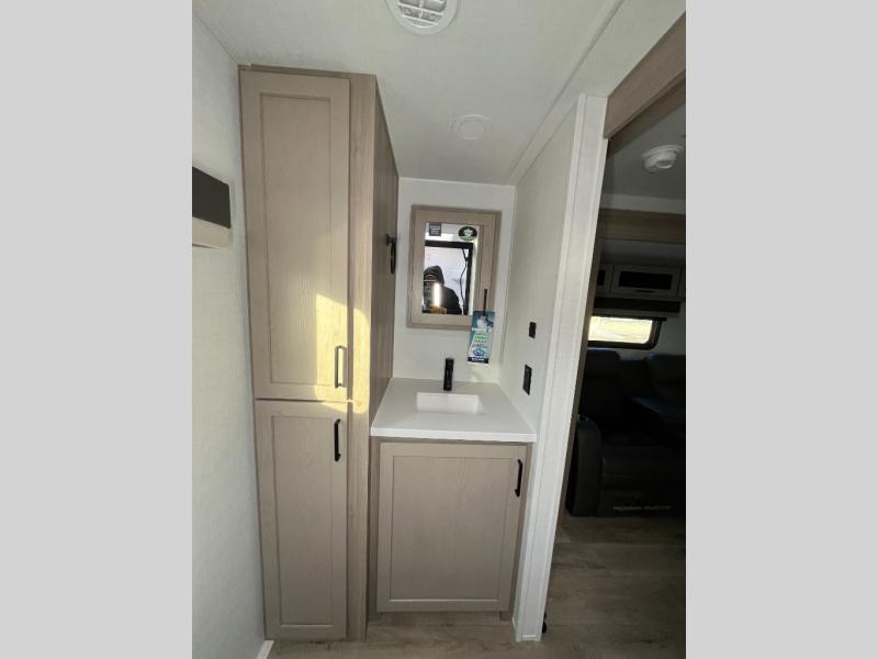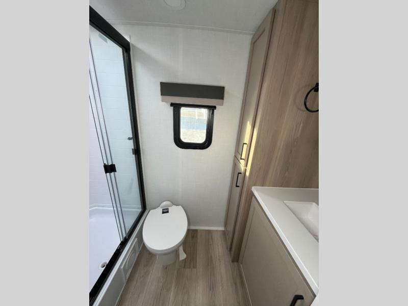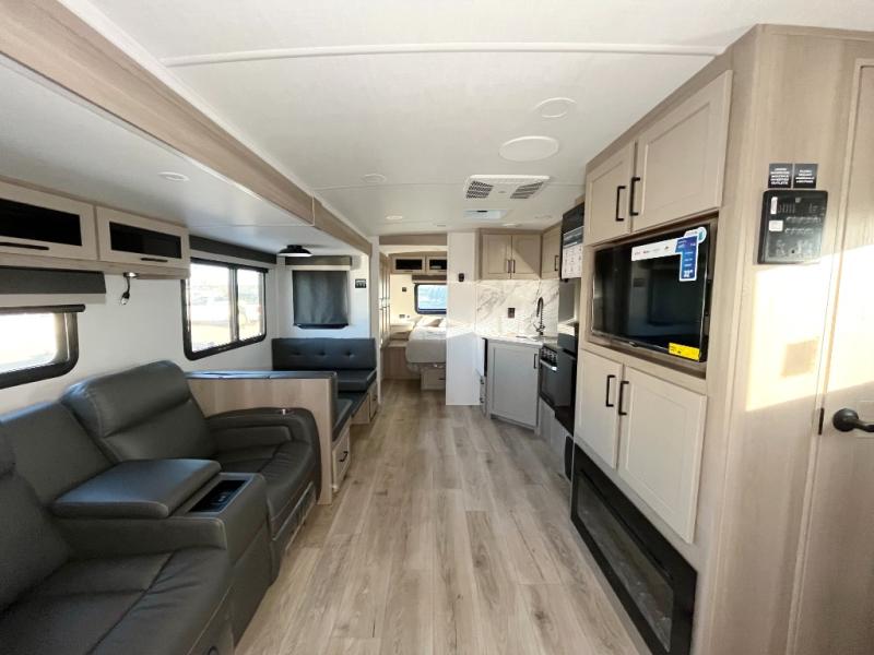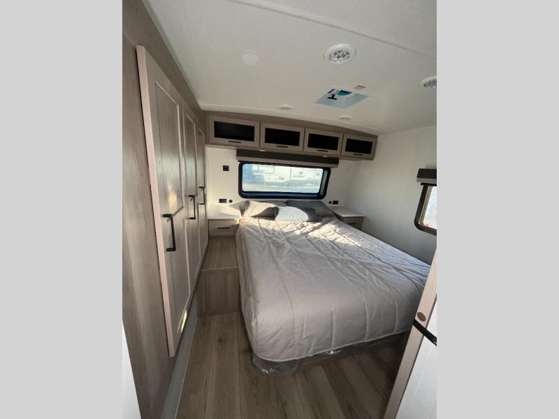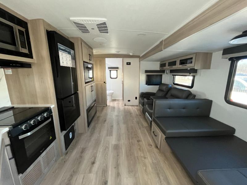Enjoy inside comforts, and outside conveniences in this trailer. You can relax under the 21' power awning which offers an outdoor living area protected from the elements, and a pass-thru storage with an optional steel sliding tray gives you the option to easily access your gear. You'll find ample storage space inside as well, including a walk-in pantry by the entry door for convenience! The cook will have full amenities to make meals, and when you are ready to sleep, head to the front bedroom with a queen bed and plenty of storage, and a wardrobe slide out giving you more floor and storage space.