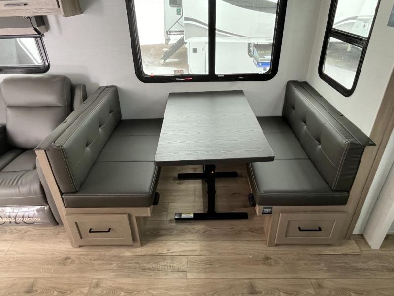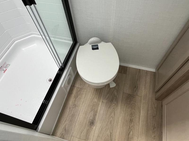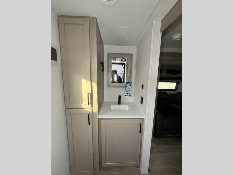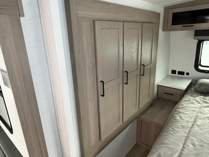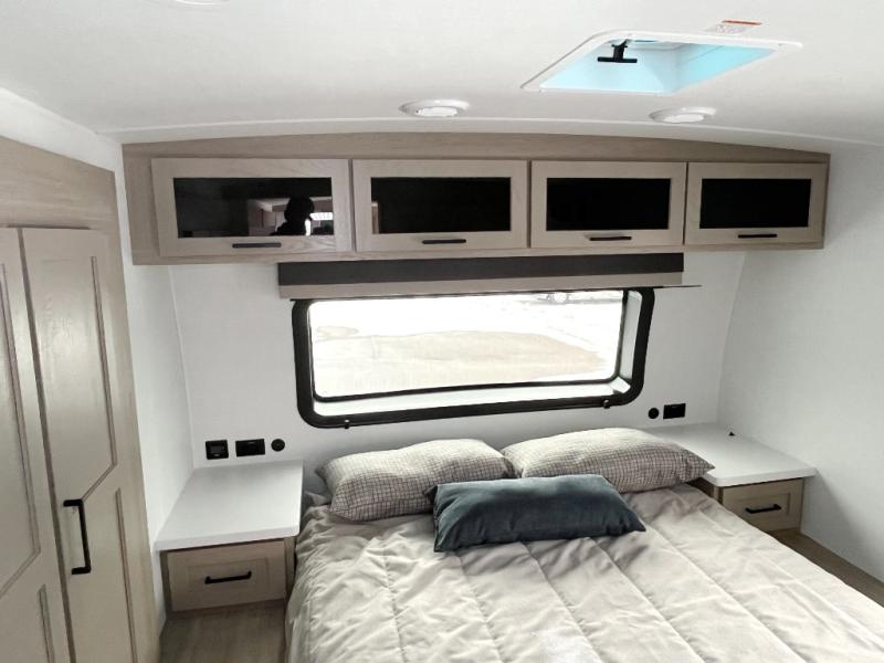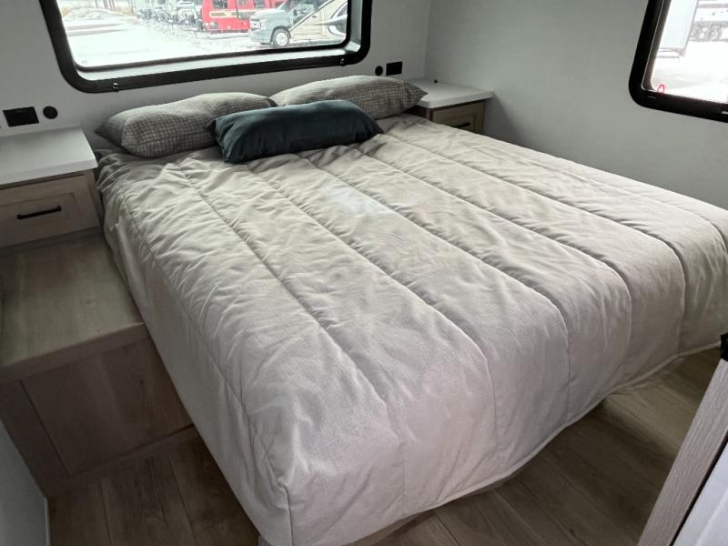 Enjoy inside comforts, and outside conveniences in this trailer. You can relax under the 21' power awning which offers an outdoor living area protected from the elements, and a pass-thru storage with an optional steel sliding tray gives you the option to easily access your gear. You'll find ample storage space inside as well, including a walk-in pantry by the entry door for convenience! The cook will have full amenities to make meals, and when you are ready to sleep, head to the front bedroom with a queen bed and plenty of storage, and a wardrobe slide out giving you more floor and storage space.