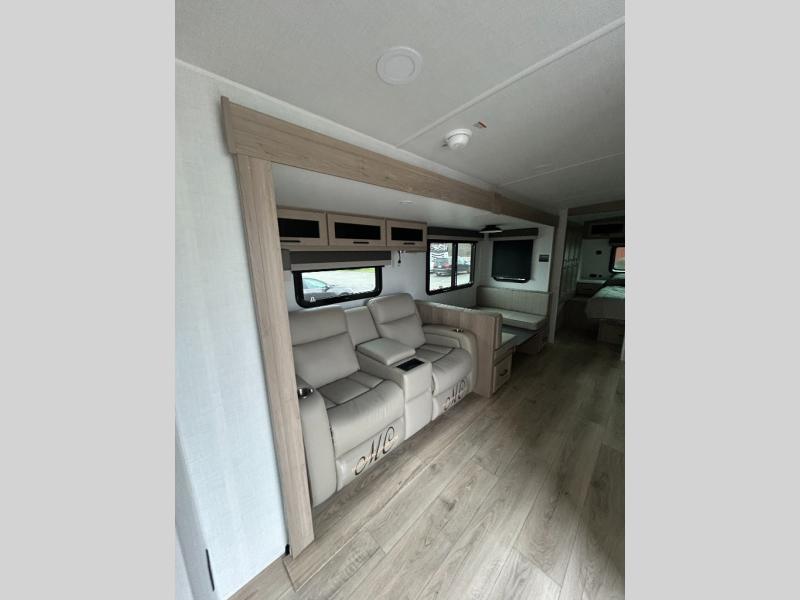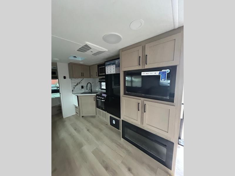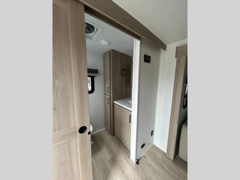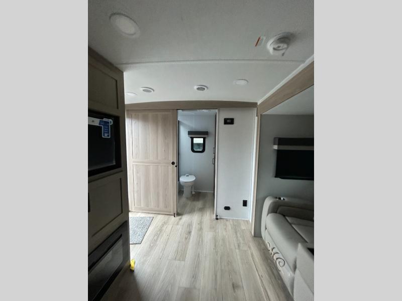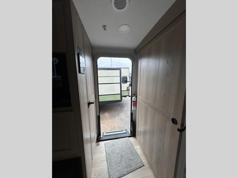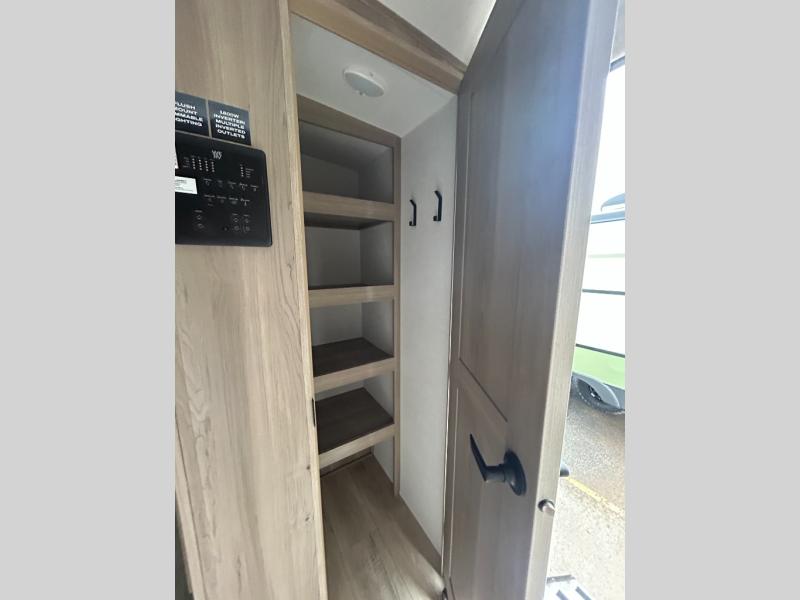 Enjoy inside comforts, and outside conveniences in this trailer. You can relax under the 21' power awning which offers an outdoor living area protected from the elements, and a pass-thru storage with an optional steel sliding tray gives you the option to easily access your gear. You'll find ample storage space inside as well, including a walk-in pantry by the entry door for convenience! The cook will have full amenities to make meals, and when you are ready to sleep, head to the front bedroom with a queen bed and plenty of storage, and a wardrobe slide out giving you more floor and storage space.