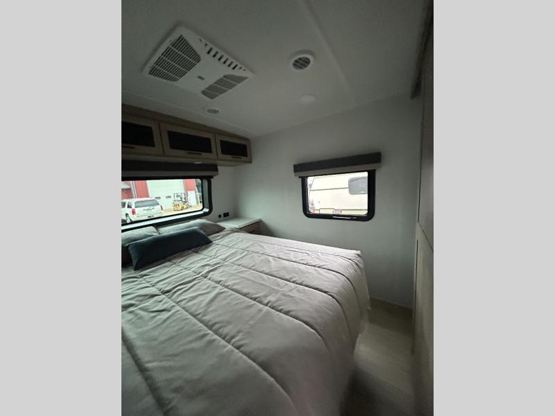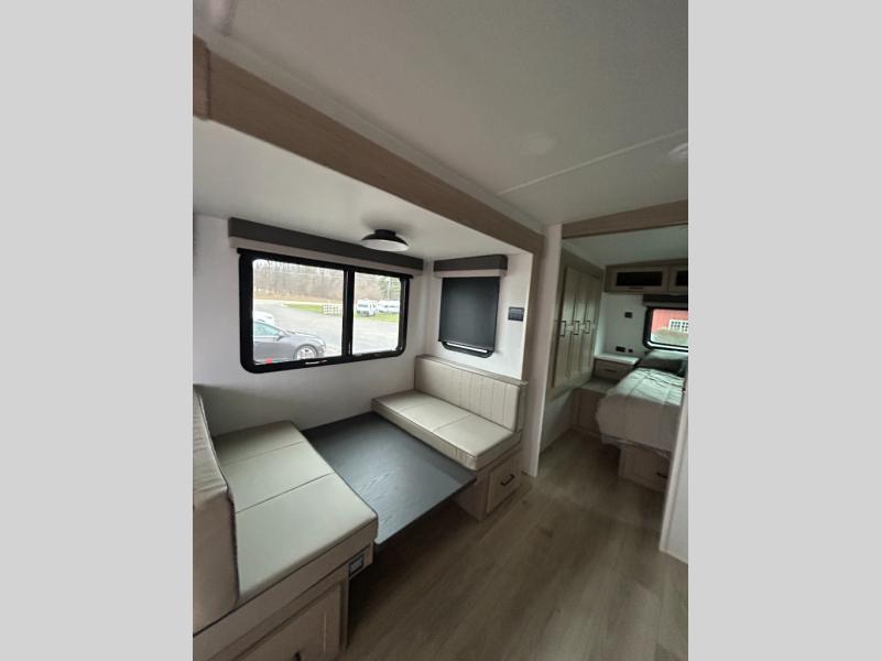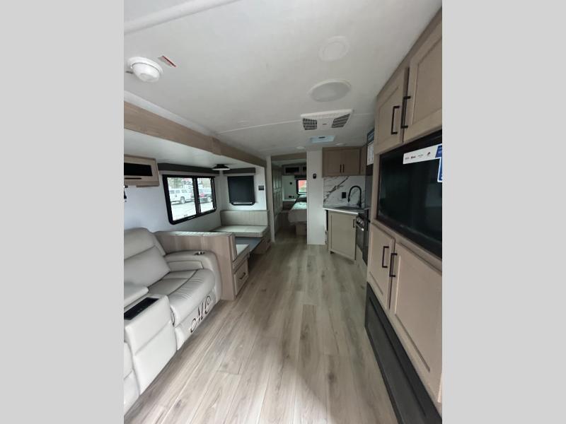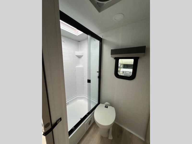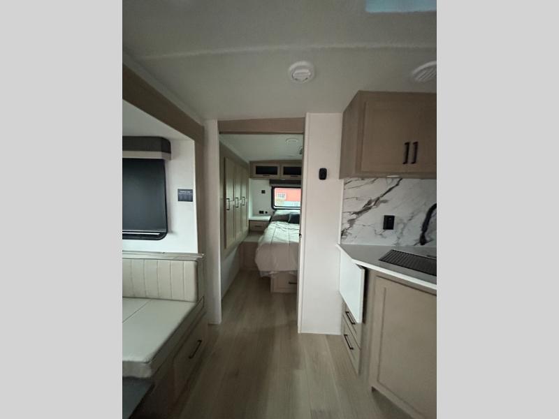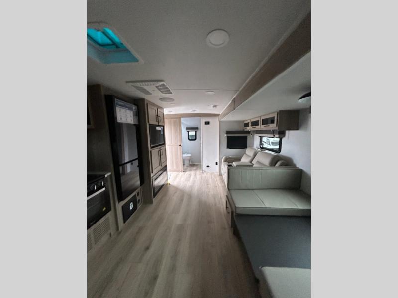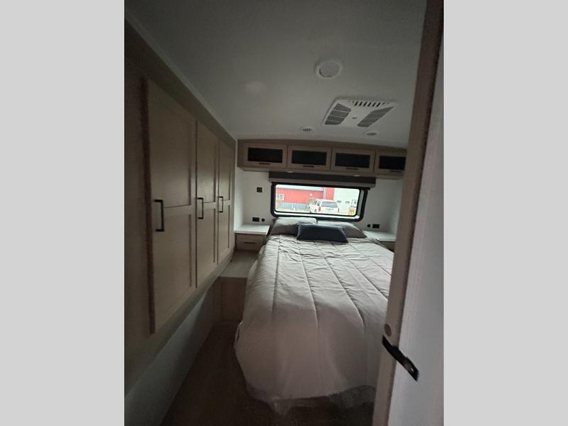 Enjoy inside comforts, and outside conveniences in this trailer. You can relax under the 21' power awning which offers an outdoor living area protected from the elements, and a pass-thru storage with an optional steel sliding tray gives you the option to easily access your gear. You'll find ample storage space inside as well, including a walk-in pantry by the entry door for convenience! The cook will have full amenities to make meals, and when you are ready to sleep, head to the front bedroom with a queen bed and plenty of storage, and a wardrobe slide out giving you more floor and storage space.