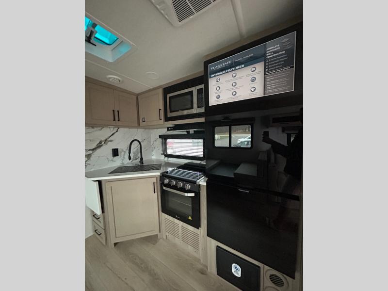 With any Flagstaff Super Lite travel trailer by Forest River, you can enjoy quality features with lightweight towing! The Climate Protection Package includes radiant foil in the front cap, underbelly, and slides, plus there are 12V thermostat-controlled heated tanks for added protection. The complete composite wall construction and 6-sided full-aluminum frame is ultra durable, and the RoadTech tire pressure monitoring adds safety. Each model also includes the Coast to Coast Package that comes with slam latch baggage doors, a high gloss fiberglass cap, Goodyear Endurance tires, plus a 200W solar panel with an optional additional 200W panel for more off grid capabilities. Inside, you'll love the roller shades, solid surface kitchen countertops, a shower miser system, and many more comforts!