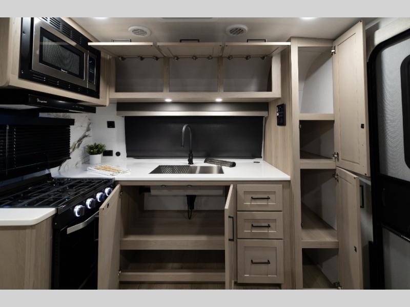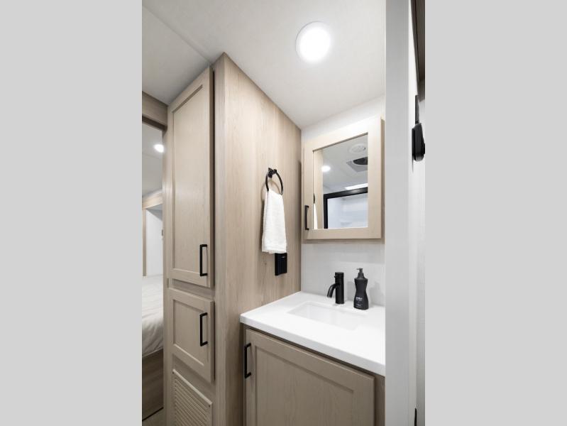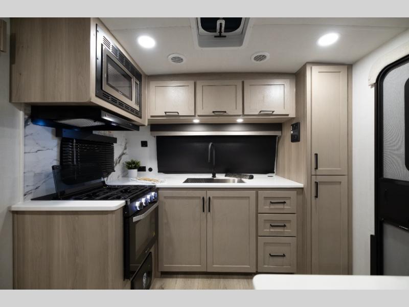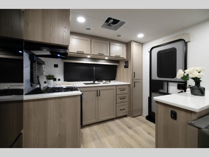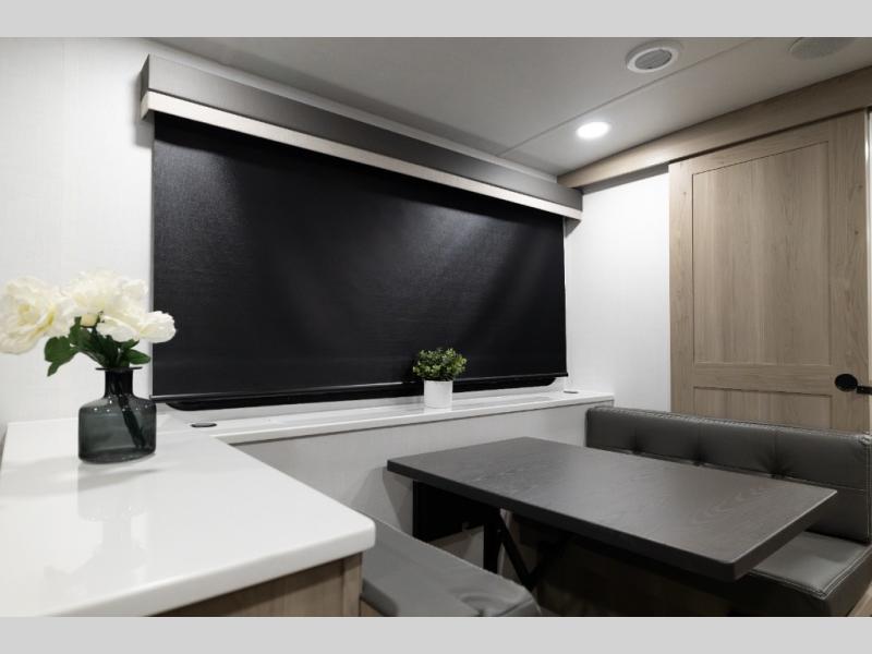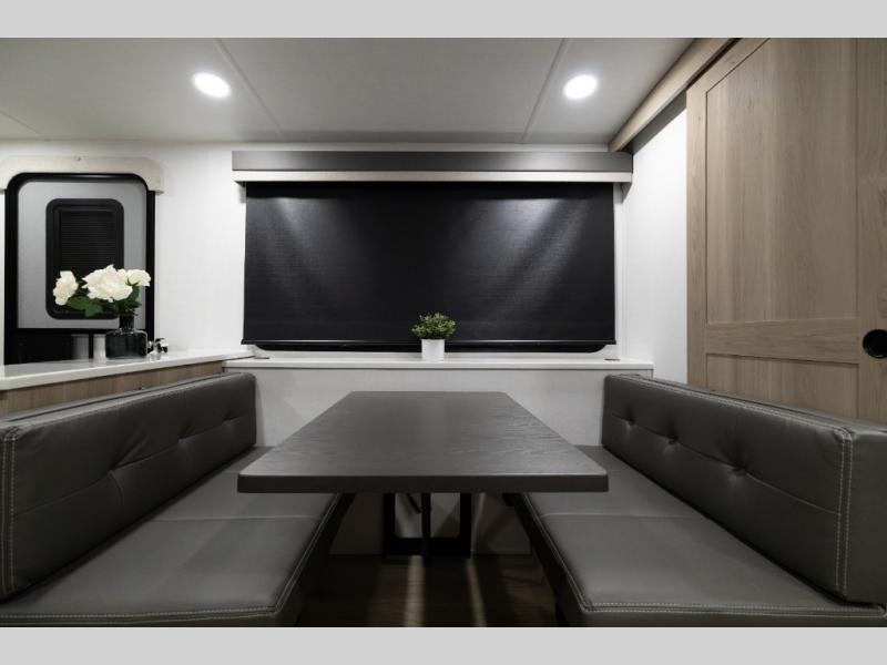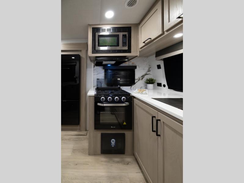 It will be so easy to enjoy time at the campground in this cozy travel trailer. The full kitchen includes a three burner gas oven, a microwave oven, and a 12V refrigerator to cook and store food, and the pantry will let you stock up on snacks. Your crew can get comfortable on the theater seat or play a game at the 39" dream dinette, and there is a smart TV with a lift here to make it a movie night. The walk-thru bath will let you freshen up each day, and the queen bed slide out in the rear bedroom is sure to bring comfort. You will also find one of the dual entry doors here for convenience plus a wardrobe for clothes storage and an optional TV if you want to add a television. The exterior is just as accommodating with its pass-thru storage, 2" receiver hitch, and 21' power awning!