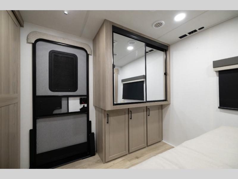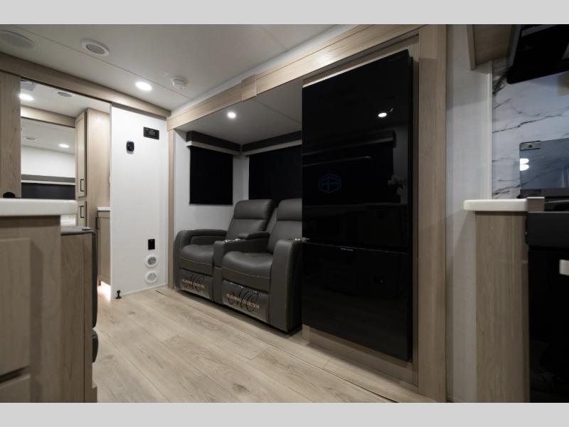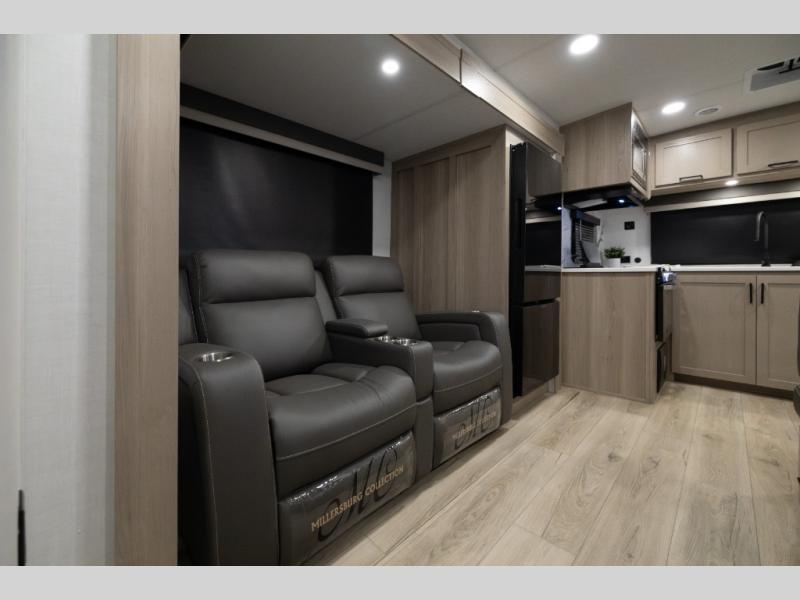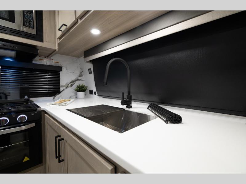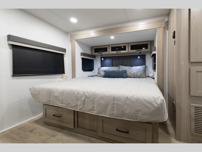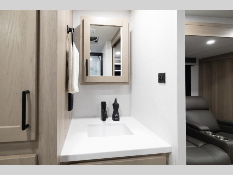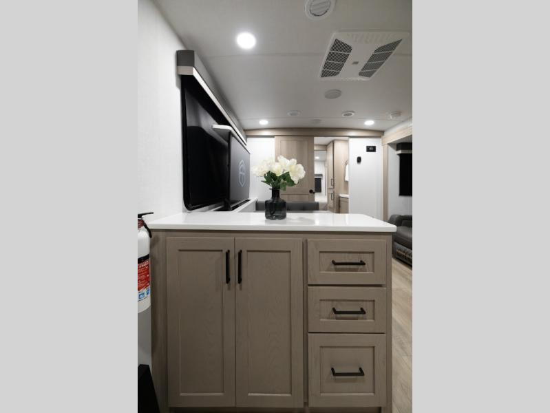 It will be so easy to enjoy time at the campground in this cozy travel trailer. The full kitchen includes a three burner gas oven, a microwave oven, and a 12V refrigerator to cook and store food, and the pantry will let you stock up on snacks. Your crew can get comfortable on the theater seat or play a game at the 39" dream dinette, and there is a smart TV with a lift here to make it a movie night. The walk-thru bath will let you freshen up each day, and the queen bed slide out in the rear bedroom is sure to bring comfort. You will also find one of the dual entry doors here for convenience plus a wardrobe for clothes storage and an optional TV if you want to add a television. The exterior is just as accommodating with its pass-thru storage, 2" receiver hitch, and 21' power awning!