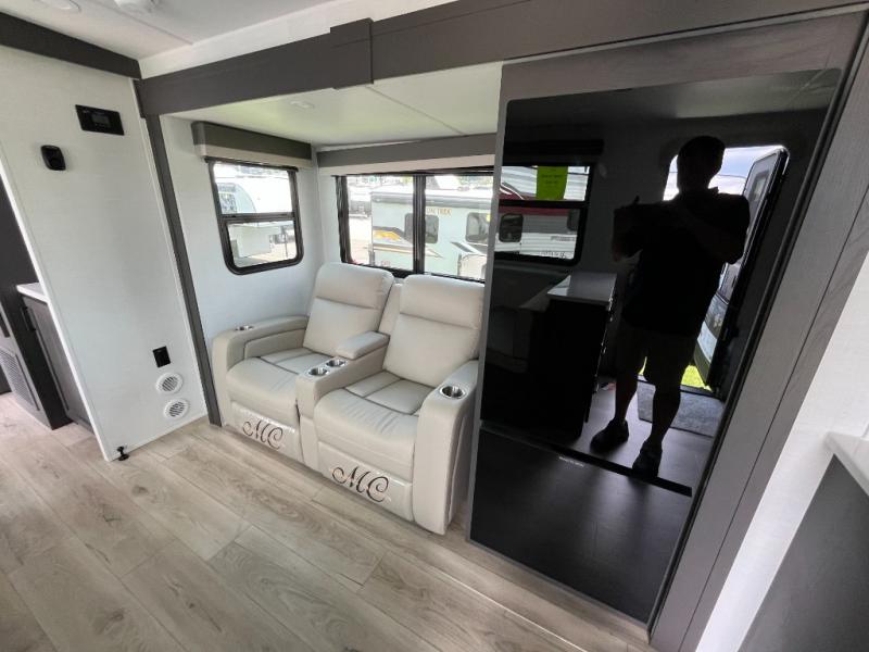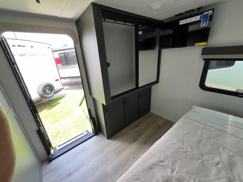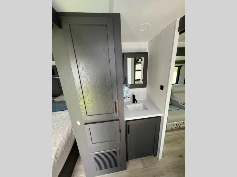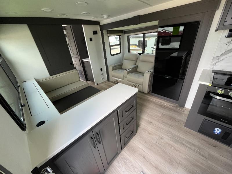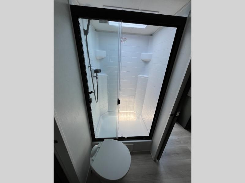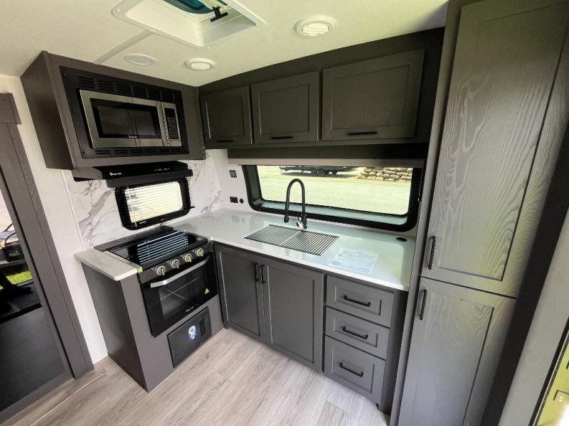 It will be so easy to enjoy time at the campground in this cozy travel trailer. The full kitchen includes a three burner gas oven, a microwave oven, and a 12V refrigerator to cook and store food, and the pantry will let you stock up on snacks. Your crew can get comfortable on the theater seat or play a game at the 39" booth dinette, and there is a 40" TV with a lift here to make it a movie night. The walk-thru bath will let you freshen up each day, and the queen bed in the rear bedroom is sure to bring comfort. You will also find one of the dual entry doors here for convenience plus a wardrobe for clothes storage and an optional TV if you want to add a television. The exterior is just as accommodating with its pass-thru storage, exterior griddle, and 21' awning!