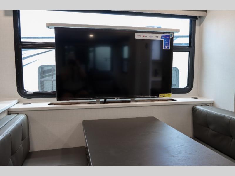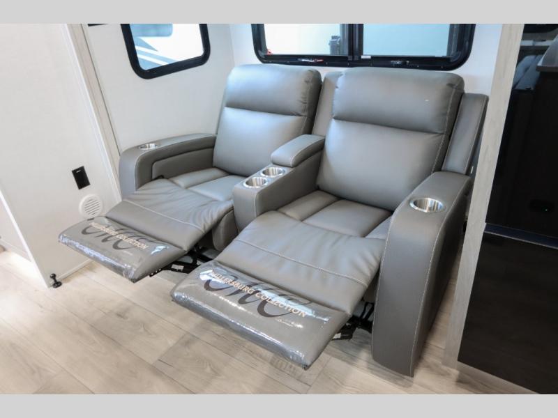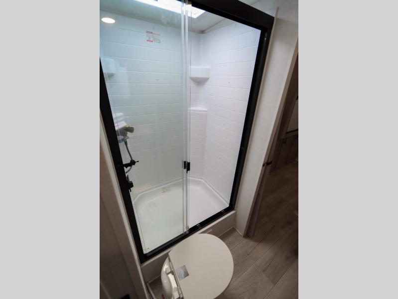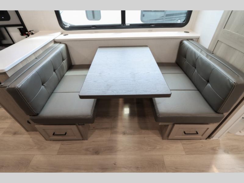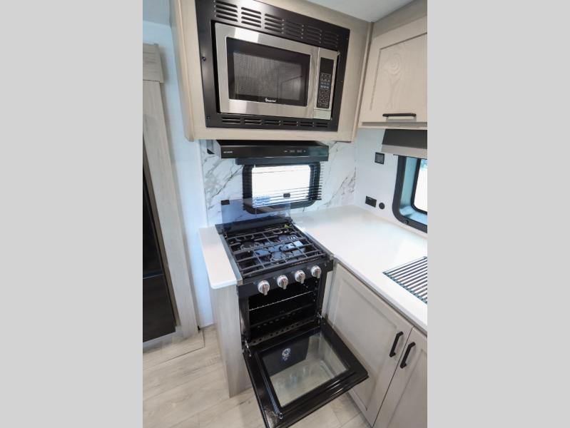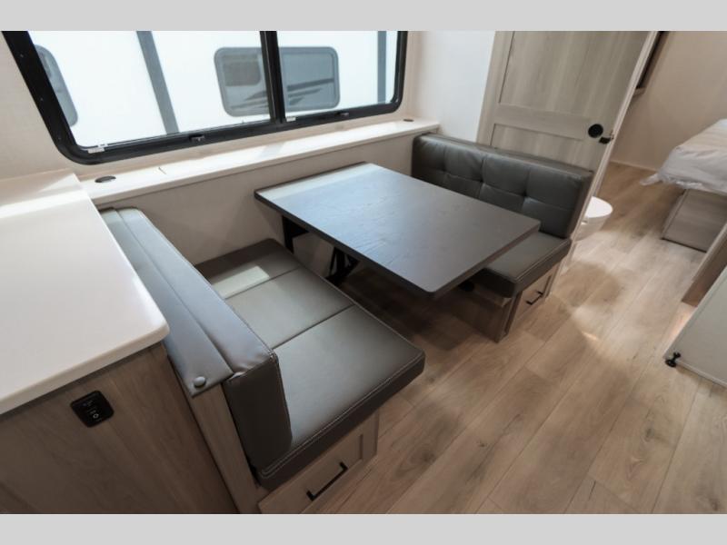 It will be so easy to enjoy time at the campground in this cozy travel trailer. The full kitchen includes a three burner gas oven, a microwave oven, and a 12V refrigerator to cook and store food, and the pantry will let you stock up on snacks. Your crew can get comfortable on the theater seat or play a game at the 39" booth dinette, and there is a 40" TV with a lift here to make it a movie night. The walk-thru bath will let you freshen up each day, and the queen bed in the rear bedroom is sure to bring comfort. You will also find one of the dual entry doors here for convenience plus a wardrobe for clothes storage and an optional TV if you want to add a television. The exterior is just as accommodating with its pass-thru storage, exterior griddle, and 21' awning!