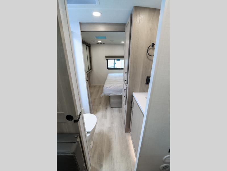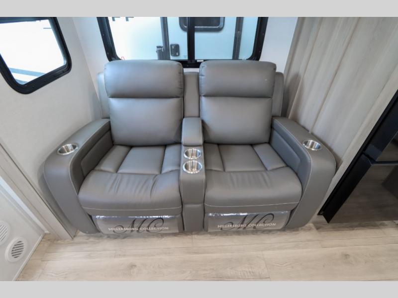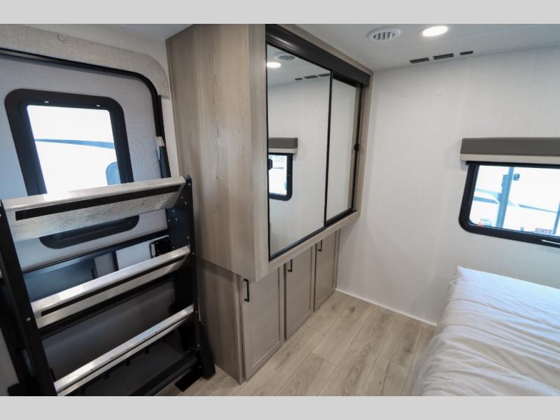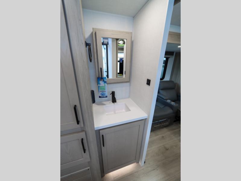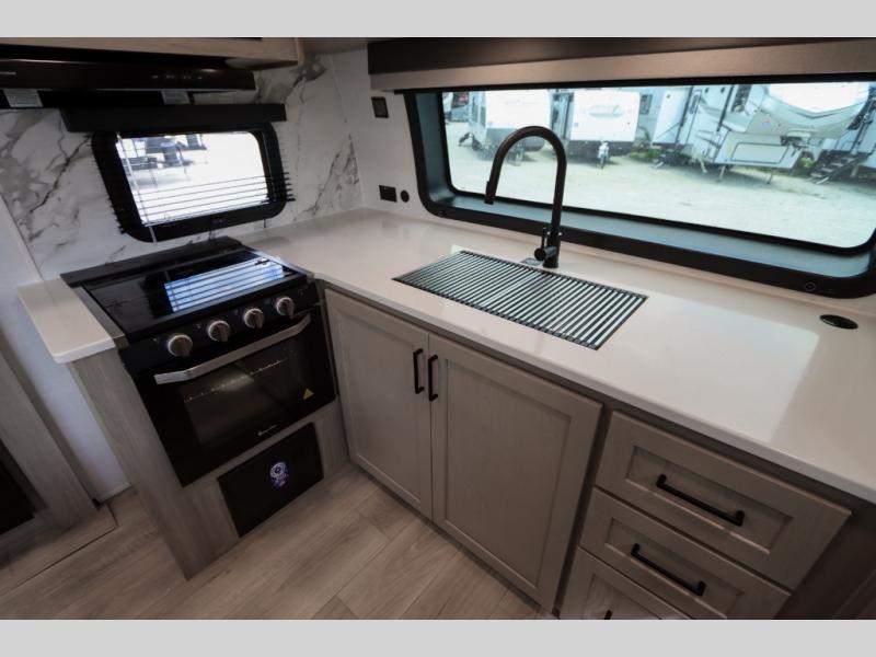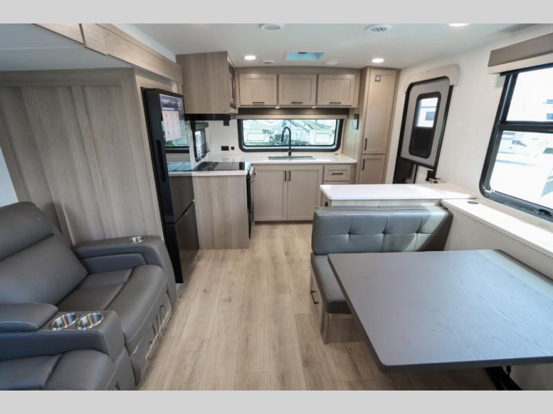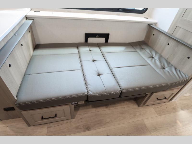 It will be so easy to enjoy time at the campground in this cozy travel trailer. The full kitchen includes a three burner gas oven, a microwave oven, and a 12V refrigerator to cook and store food, and the pantry will let you stock up on snacks. Your crew can get comfortable on the theater seat or play a game at the 39" booth dinette, and there is a 40" TV with a lift here to make it a movie night. The walk-thru bath will let you freshen up each day, and the queen bed in the rear bedroom is sure to bring comfort. You will also find one of the dual entry doors here for convenience plus a wardrobe for clothes storage and an optional TV if you want to add a television. The exterior is just as accommodating with its pass-thru storage, exterior griddle, and 21' awning!