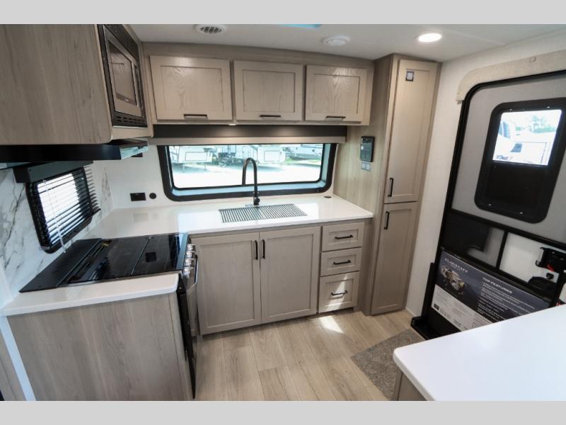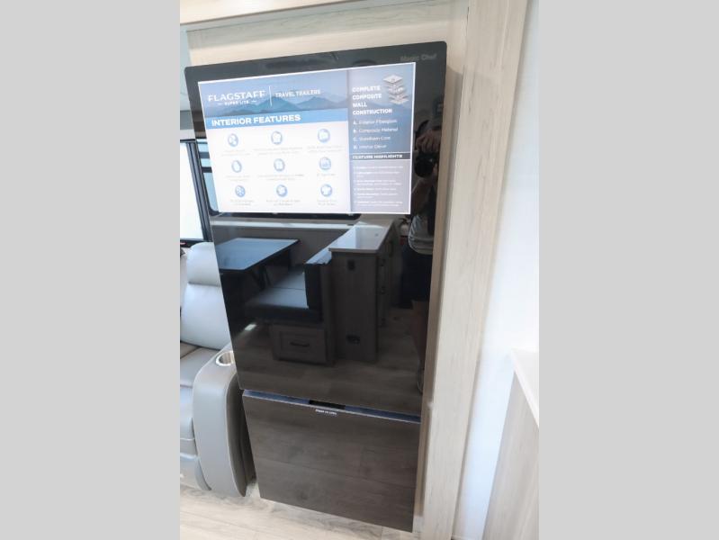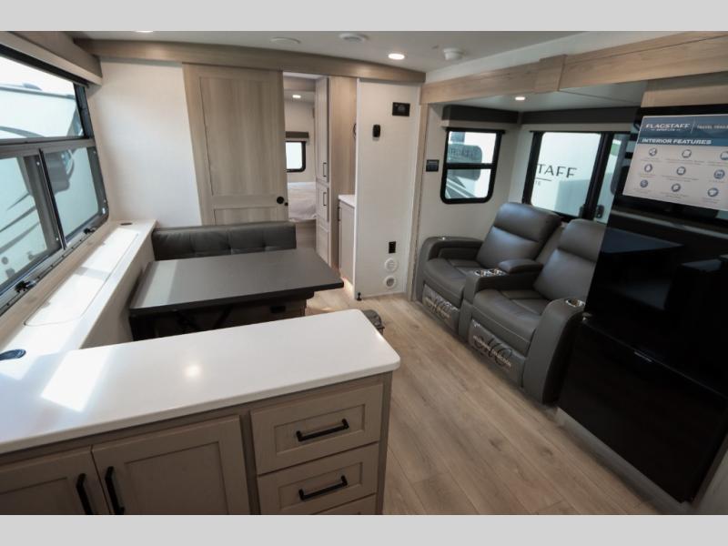 With any Flagstaff Super Lite travel trailer by Forest River the towing features include the TST tire pressure monitor system with a monitor providing safety on the road, Easy Lube axles and Nev-R adjust brakes, a power tongue jack for easy setup, and rear observation camera prep. Each is built with 6 sided aluminum framed side walls, end wall, front, floor and a roof, a plywood tongue and groove subfloor, electronically controlled heated holding tanks and an enclosed underbelly allowing you to travel during any season. The interior includes designer kitchen backsplash, solid surface kitchen countertops, Sedonwood cabinetry, and solid wood cabinet doors and drawers to make you feel right at home.
