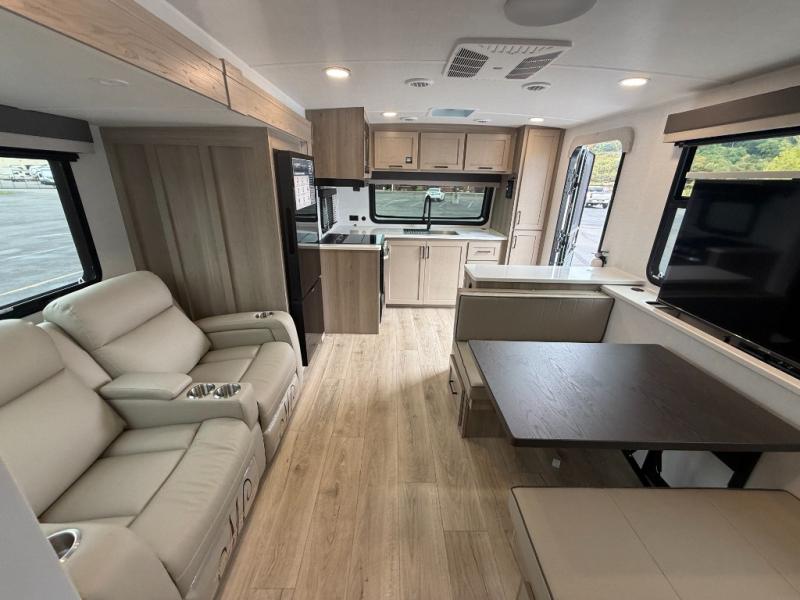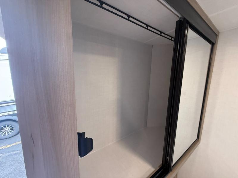 It will be so easy to enjoy time at the campground in this cozy travel trailer. The full kitchen includes a three burner gas oven, a microwave oven, and a 12V refrigerator to cook and store food, and the pantry will let you stock up on snacks. Your crew can get comfortable on the theater seat or play a game at the 39" dream dinette, and there is a smart TV with a lift here to make it a movie night. The walk-thru bath will let you freshen up each day, and the queen bed slide out in the rear bedroom is sure to bring comfort. You will also find one of the dual entry doors here for convenience plus a wardrobe for clothes storage and an optional TV if you want to add a television. The exterior is just as accommodating with its pass-thru storage, 2" receiver hitch, and 21' power awning!