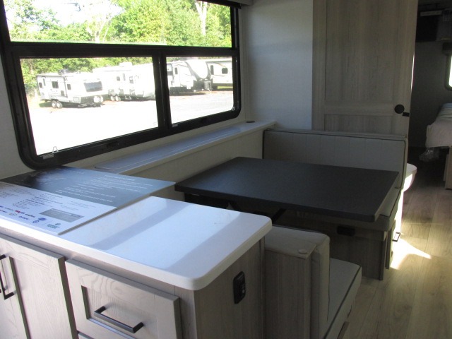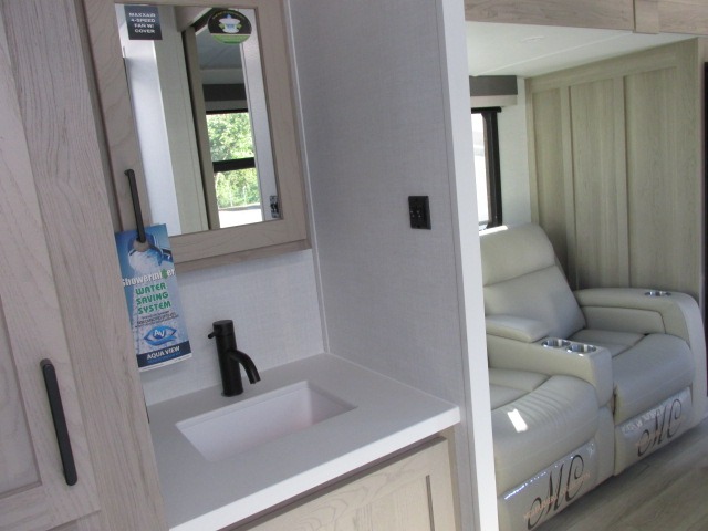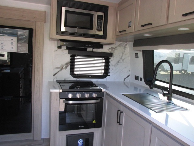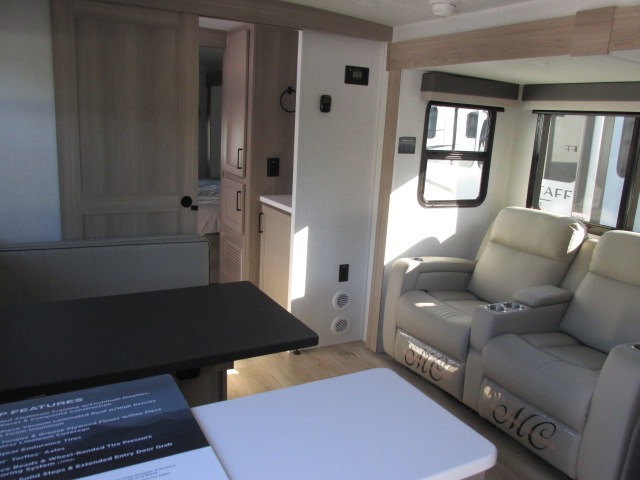 It will be so easy to enjoy time at the campground in this cozy travel trailer. The full kitchen includes a three burner gas oven, a microwave oven, and a 12V refrigerator to cook and store food, and the pantry will let you stock up on snacks. Your crew can get comfortable on the theater seat or play a game at the 39" dream dinette, and there is a smart TV with a lift here to make it a movie night. The walk-thru bath will let you freshen up each day, and the queen bed slide out in the rear bedroom is sure to bring comfort. You will also find one of the dual entry doors here for convenience plus a wardrobe for clothes storage and an optional TV if you want to add a television. The exterior is just as accommodating with its pass-thru storage, 2" receiver hitch, and 21' power awning!