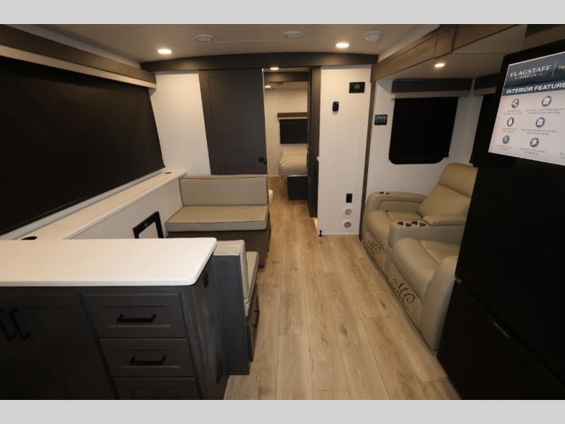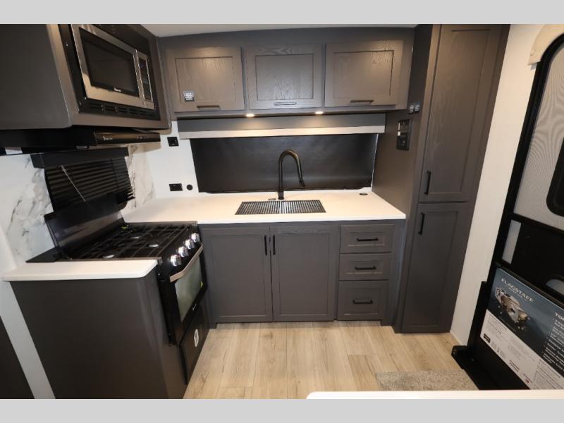 With any Flagstaff Super Lite travel trailer by Forest River, you can enjoy quality features with lightweight towing! The Climate Protection Package includes radiant foil in the front cap, underbelly, and slides, plus there are 12V thermostat-controlled heated tanks for added protection. The complete composite wall construction and 6-sided full-aluminum frame is ultra durable, and the RoadTech tire pressure monitoring adds safety. Each model also includes the Coast to Coast Package that comes with slam latch baggage doors, a high gloss fiberglass cap, Goodyear Endurance tires, plus a 200W solar panel with an optional additional 200W panel for more off grid capabilities. Inside, you'll love the roller shades, solid surface kitchen countertops, a shower miser system, and many more comforts!