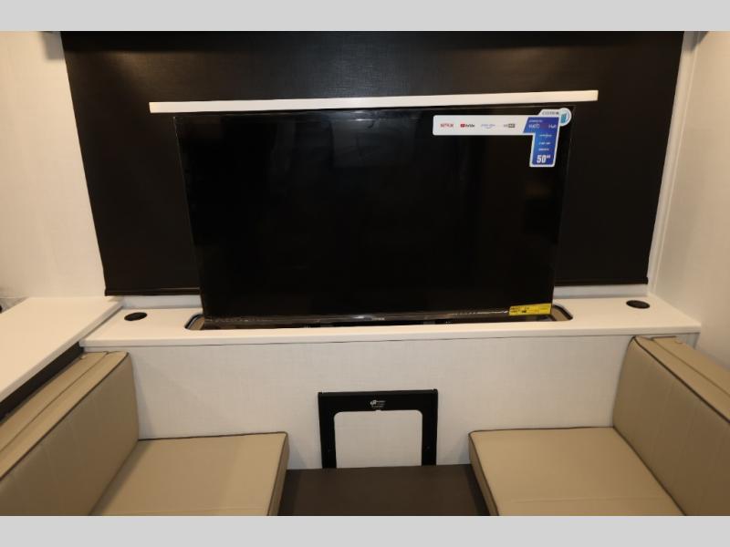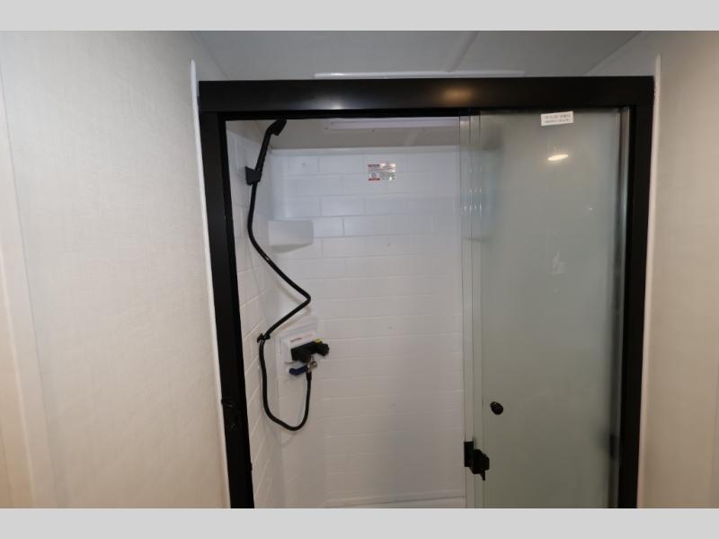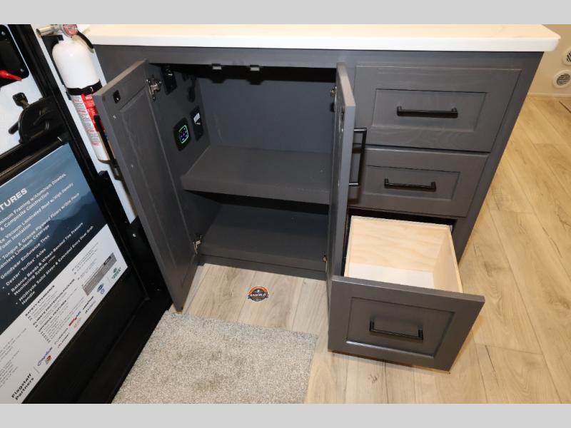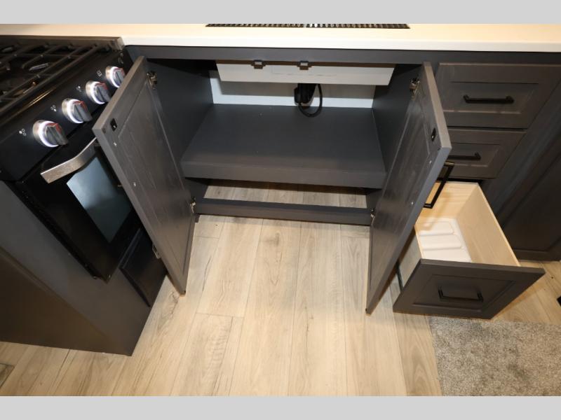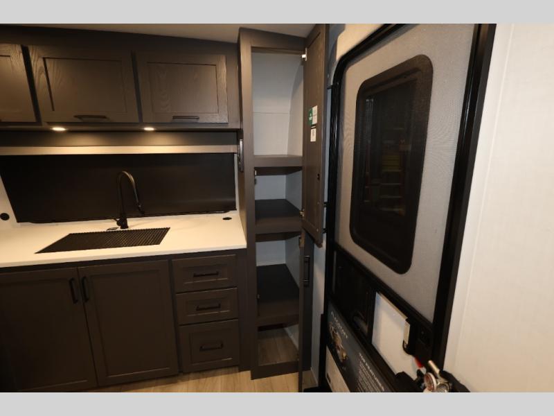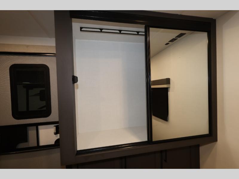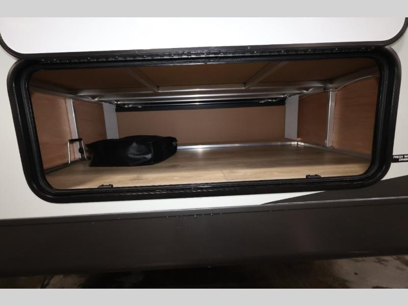 It will be so easy to enjoy time at the campground in this cozy travel trailer. The full kitchen includes a three burner gas oven, a microwave oven, and a 12V refrigerator to cook and store food, and the pantry will let you stock up on snacks. Your crew can get comfortable on the theater seat or play a game at the 39" dream dinette, and there is a smart TV with a lift here to make it a movie night. The walk-thru bath will let you freshen up each day, and the queen bed slide out in the rear bedroom is sure to bring comfort. You will also find one of the dual entry doors here for convenience plus a wardrobe for clothes storage and an optional TV if you want to add a television. The exterior is just as accommodating with its pass-thru storage, 2" receiver hitch, and 21' power awning!