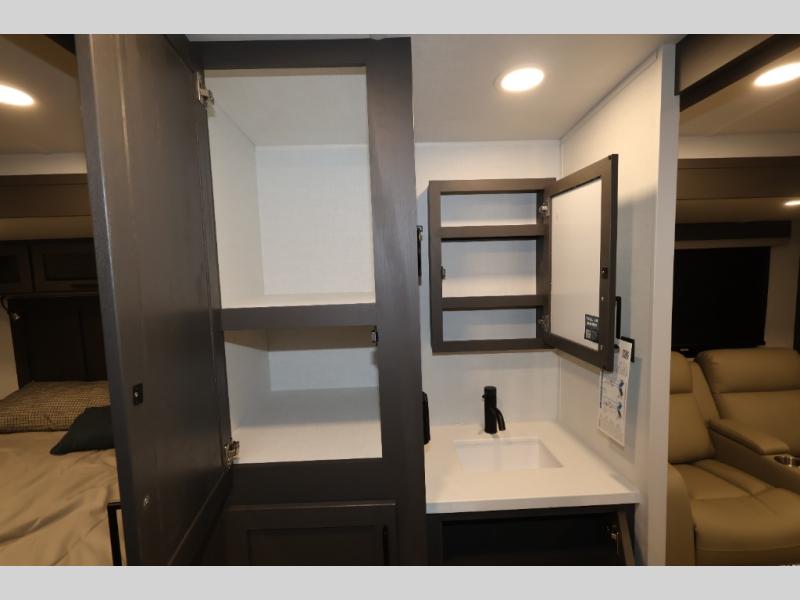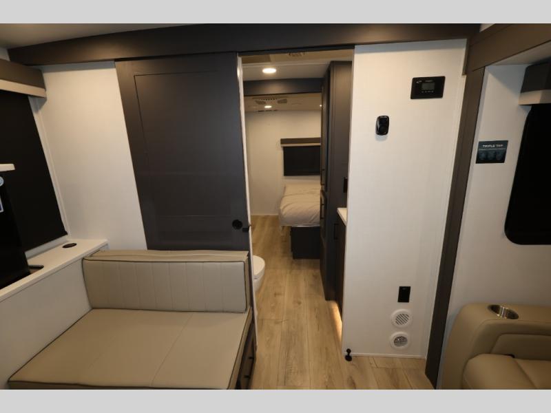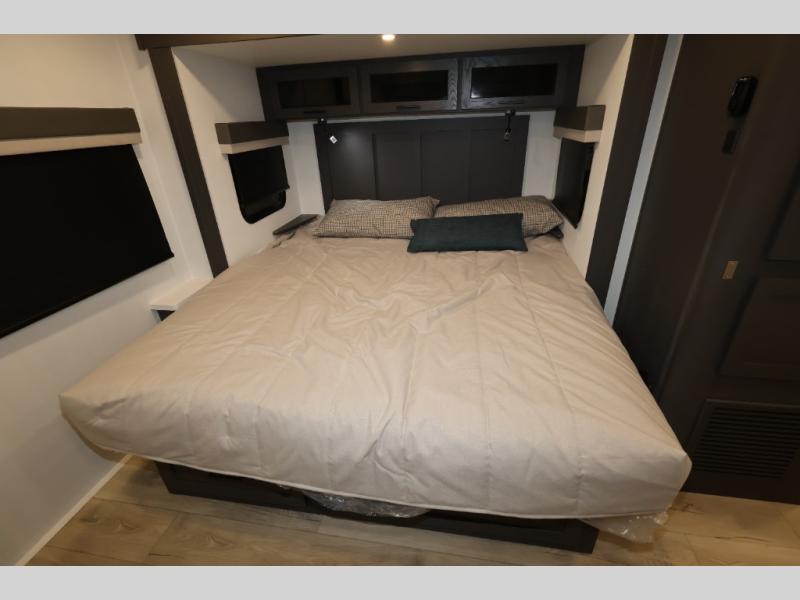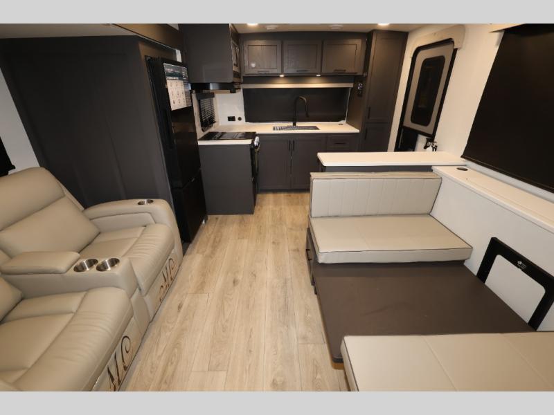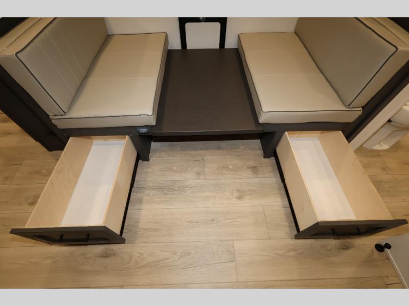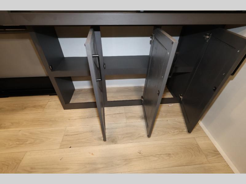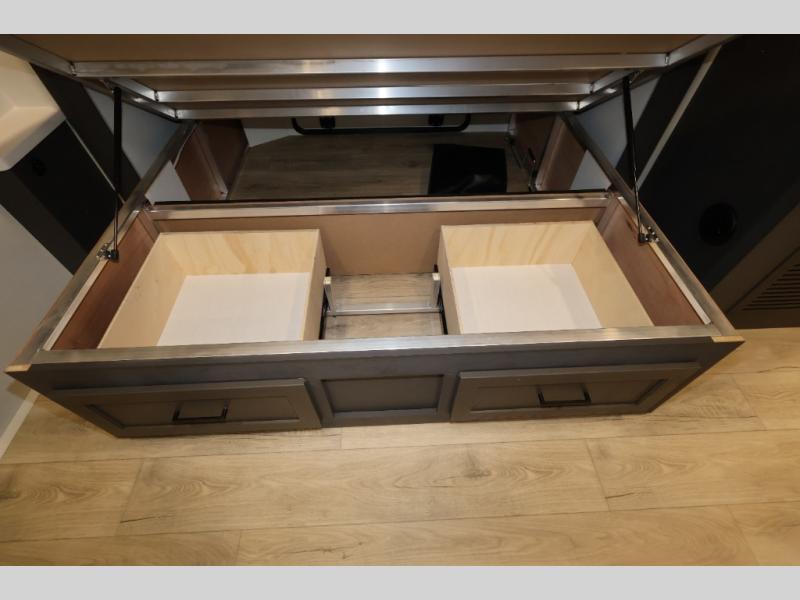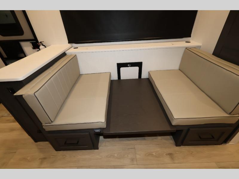 It will be so easy to enjoy time at the campground in this cozy travel trailer. The full kitchen includes a three burner gas oven, a microwave oven, and a 12V refrigerator to cook and store food, and the pantry will let you stock up on snacks. Your crew can get comfortable on the theater seat or play a game at the 39" dream dinette, and there is a smart TV with a lift here to make it a movie night. The walk-thru bath will let you freshen up each day, and the queen bed slide out in the rear bedroom is sure to bring comfort. You will also find one of the dual entry doors here for convenience plus a wardrobe for clothes storage and an optional TV if you want to add a television. The exterior is just as accommodating with its pass-thru storage, 2" receiver hitch, and 21' power awning!