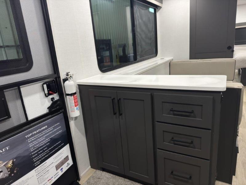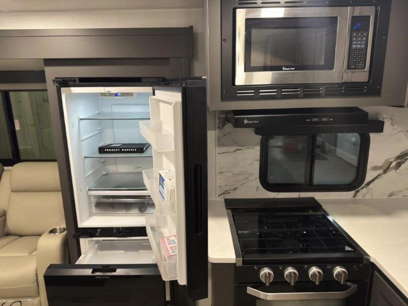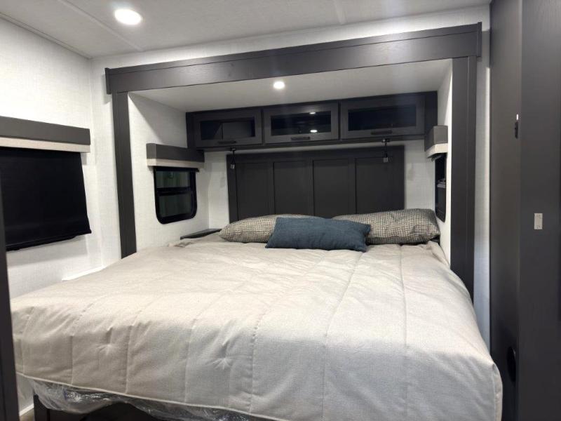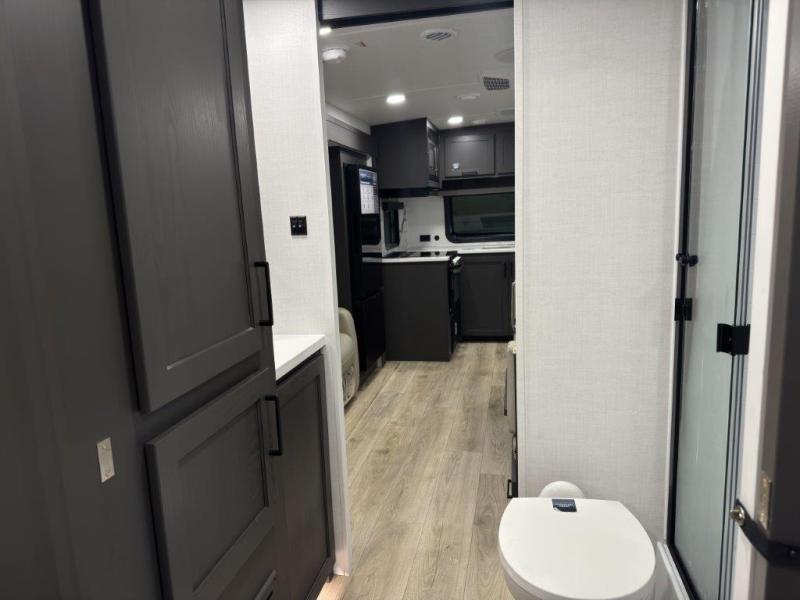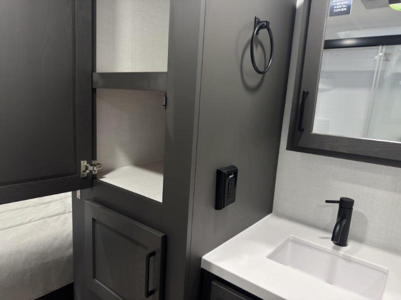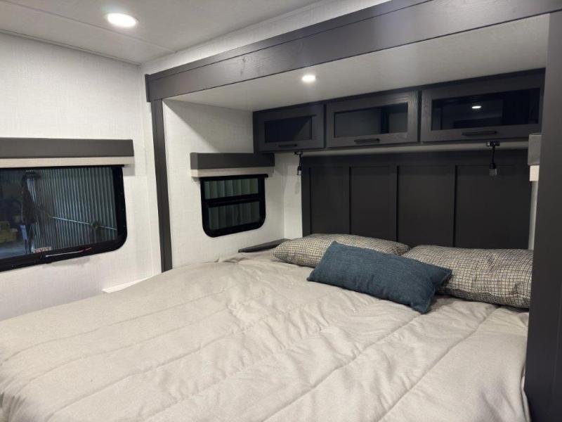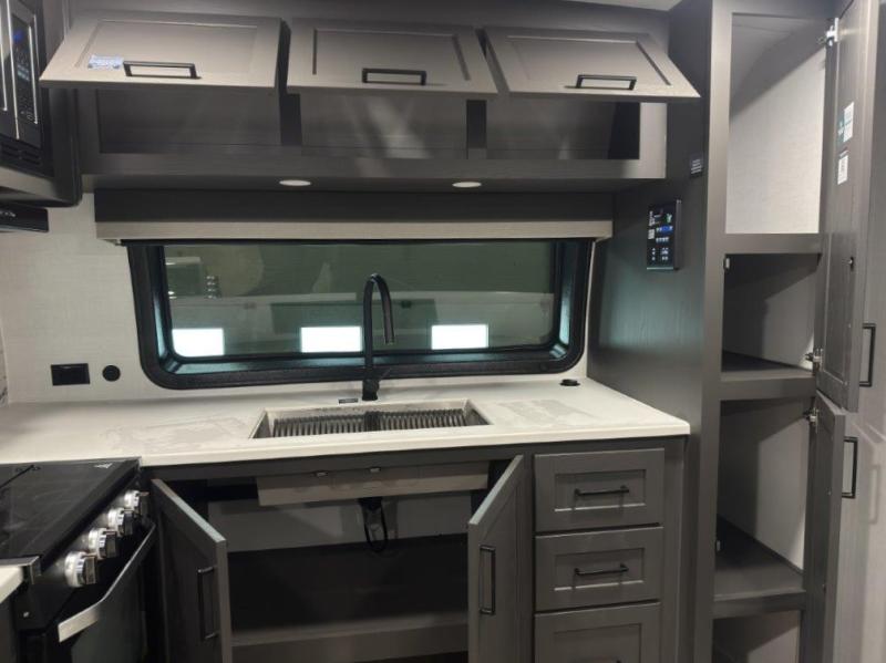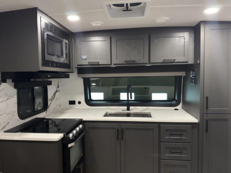 It will be so easy to enjoy time at the campground in this cozy travel trailer. The full kitchen includes a three burner gas oven, a microwave oven, and a 12V refrigerator to cook and store food, and the pantry will let you stock up on snacks. Your crew can get comfortable on the theater seat or play a game at the 39" dream dinette, and there is a smart TV with a lift here to make it a movie night. The walk-thru bath will let you freshen up each day, and the queen bed slide out in the rear bedroom is sure to bring comfort. You will also find one of the dual entry doors here for convenience plus a wardrobe for clothes storage and an optional TV if you want to add a television. The exterior is just as accommodating with its pass-thru storage, 2" receiver hitch, and 21' power awning!