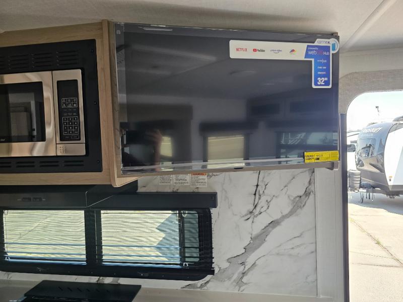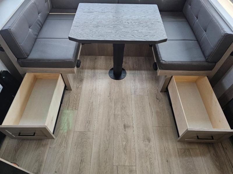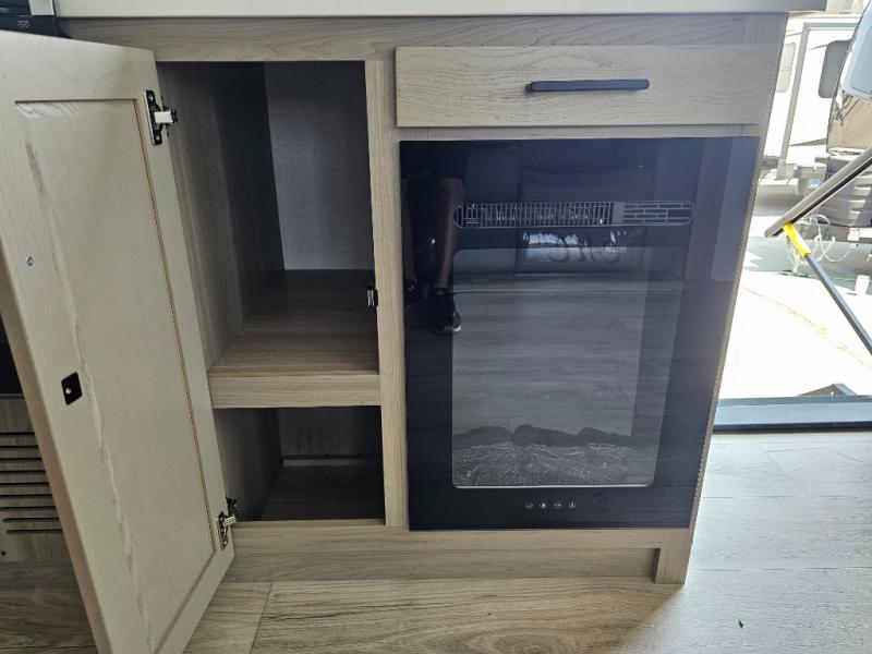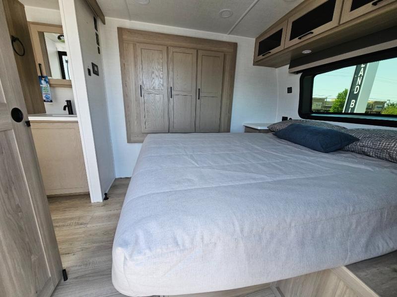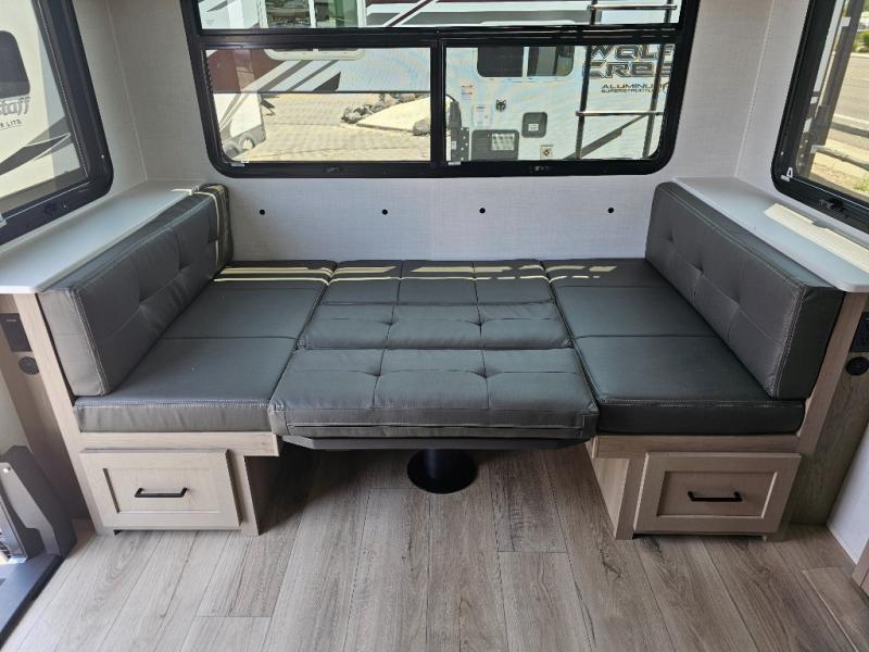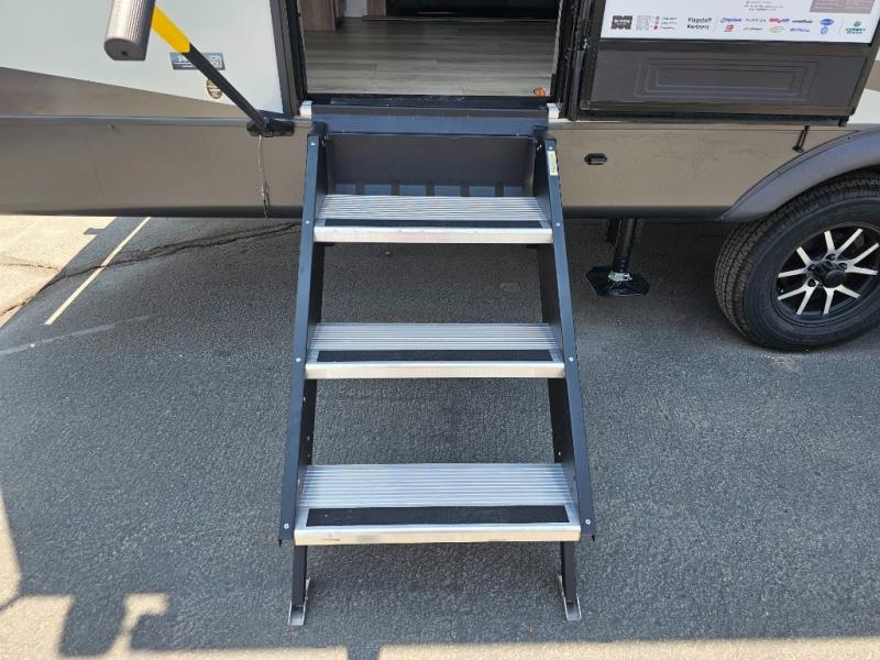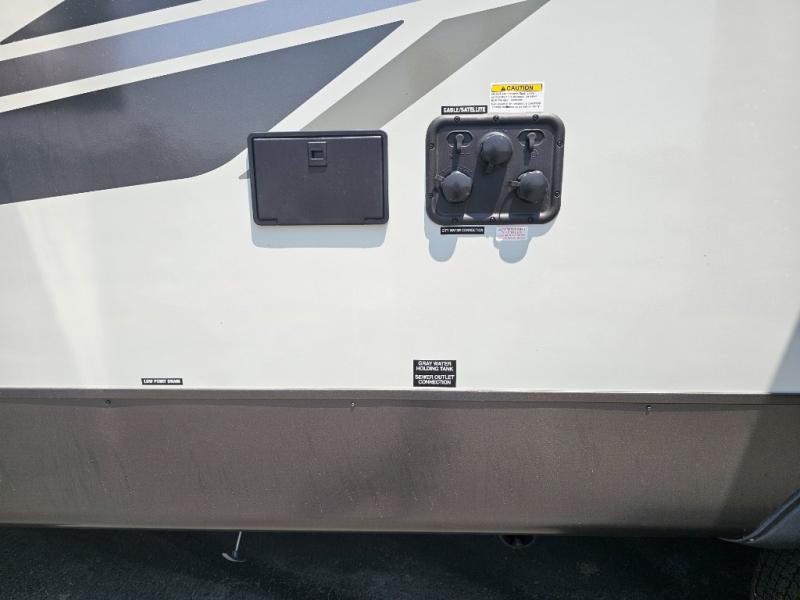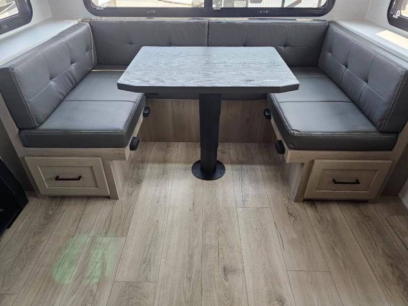 It will be so easy to enjoy time at the campground in this cozy travel trailer. The full kitchen includes a three burner gas oven, a microwave oven, and a 12V refrigerator to cook and store food, and the pantry will let you stock up on snacks. Your crew can get comfortable on the theater seat or around the rear U-shaped dinette, and there is a smart TV here to make it a movie night. The walk-thru bath will let you freshen up each day, and the queen bed in the front bedroom is sure to bring comfort. You will also find one of the dual entry doors here for convenience plus a wardrobe slide out for more storage and floor space. The exterior is just as accommodating with its pass-thru storage, 2" receiver hitch, and 21' power awning!