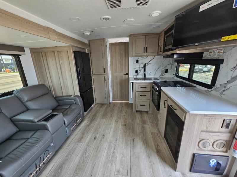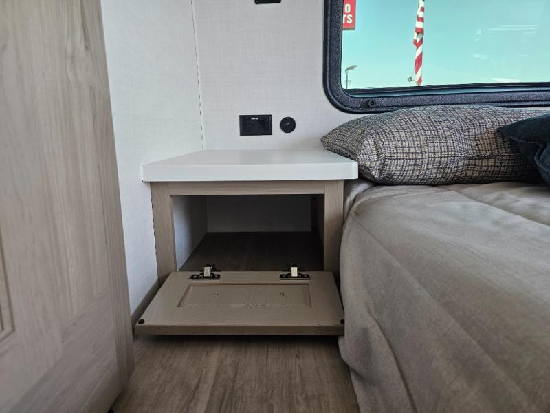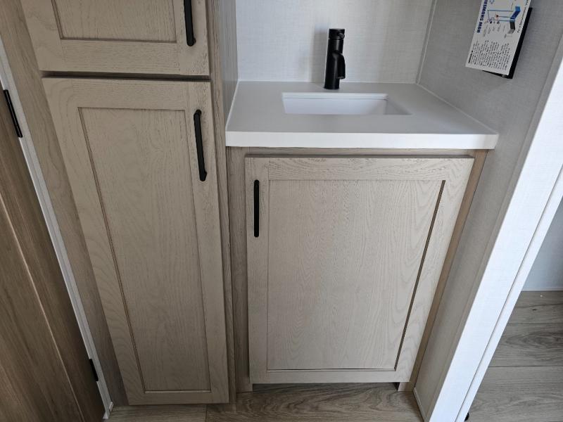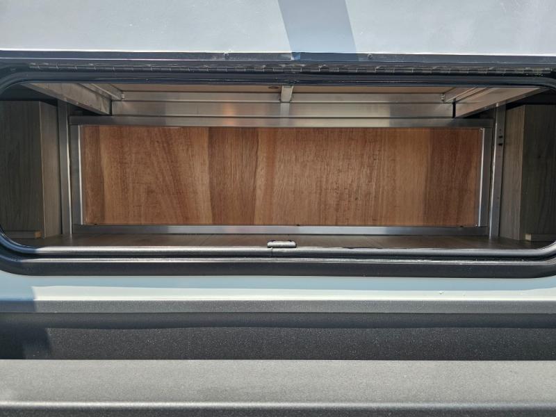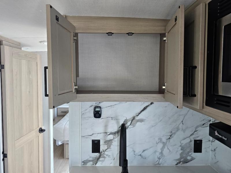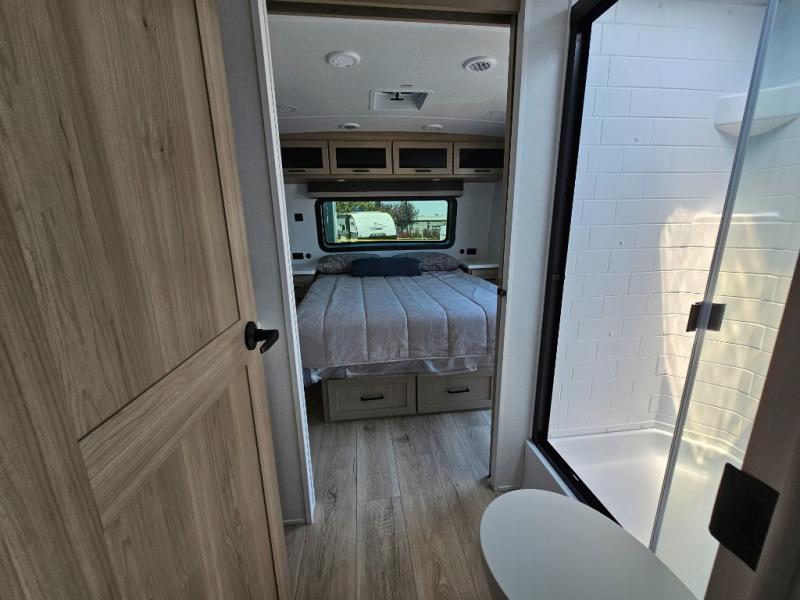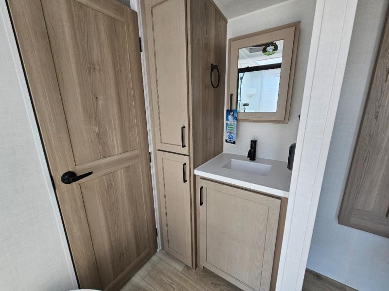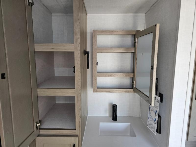 It will be so easy to enjoy time at the campground in this cozy travel trailer. The full kitchen includes a three burner gas oven, a microwave oven, and a 12V refrigerator to cook and store food, and the pantry will let you stock up on snacks. Your crew can get comfortable on the theater seat or around the rear U-shaped dinette, and there is a smart TV here to make it a movie night. The walk-thru bath will let you freshen up each day, and the queen bed in the front bedroom is sure to bring comfort. You will also find one of the dual entry doors here for convenience plus a wardrobe slide out for more storage and floor space. The exterior is just as accommodating with its pass-thru storage, 2" receiver hitch, and 21' power awning!
