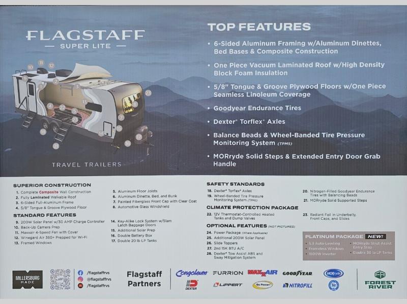 With any Flagstaff Super Lite travel trailer by Forest River, you can enjoy quality features with lightweight towing! The Climate Protection Package includes radiant foil in the front cap, underbelly, and slides, plus there are 12V thermostat-controlled heated tanks for added protection. The complete composite wall construction and 6-sided full-aluminum frame is ultra durable, and the RoadTech tire pressure monitoring adds safety. Each model also includes the Coast to Coast Package that comes with slam latch baggage doors, a high gloss fiberglass cap, Goodyear Endurance tires, plus a 200W solar panel with an optional additional 200W panel for more off grid capabilities. Inside, you'll love the roller shades, solid surface kitchen countertops, a shower miser system, and many more comforts!