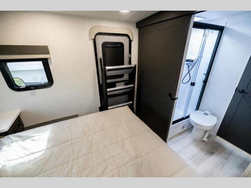 It will be so easy to enjoy time at the campground in this cozy travel trailer. The full kitchen includes a three burner gas oven, a microwave oven, and a 12V refrigerator to cook and store food, and the pantry will let you stock up on snacks. Your crew can get comfortable on the theater seat or around the rear U-shaped dinette, and there is a 12V smart entertainment TV here to make it a movie night. The walk-thru bath will let you freshen up each day, and the queen bed in the front bedroom is sure to bring comfort. You will also find one of the dual entry doors here for convenience plus a wardrobe slide out for more storage and floor space. The exterior is just as accommodating with its pass-thru storage, exterior griddle, and 21' awning!