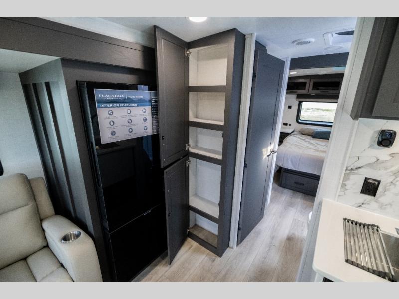With any Flagstaff Super Lite travel trailer by Forest River the towing features include the TST tire pressure monitor system with a monitor providing safety on the road, Easy Lube axles and Nev-R adjust brakes, a power tongue jack for easy setup, and rear observation camera prep. Each is built with 6 sided aluminum framed side walls, end wall, front, floor and a roof, a plywood tongue and groove subfloor, electronically controlled heated holding tanks and an enclosed underbelly allowing you to travel during any season. The interior includes designer kitchen backsplash, solid surface kitchen countertops, Sedonwood cabinetry, and solid wood cabinet doors and drawers to make you feel right at home.