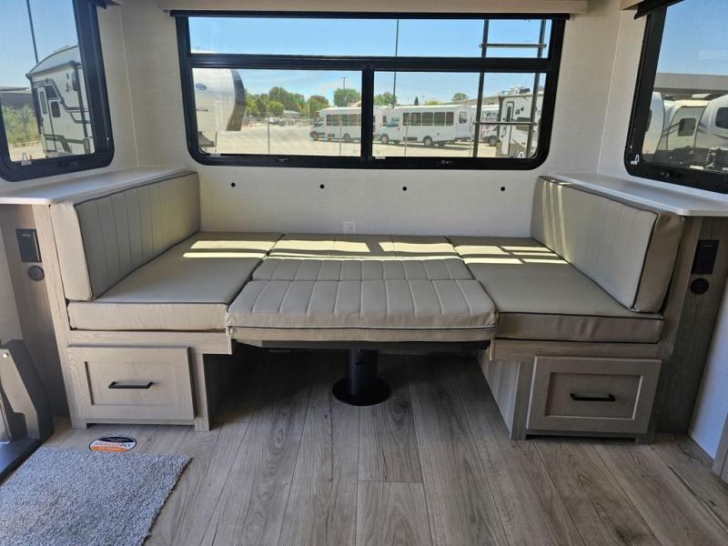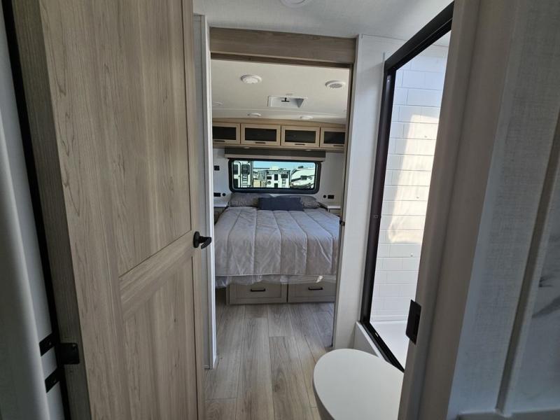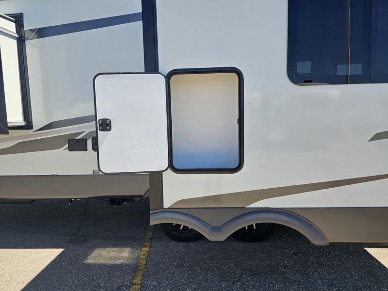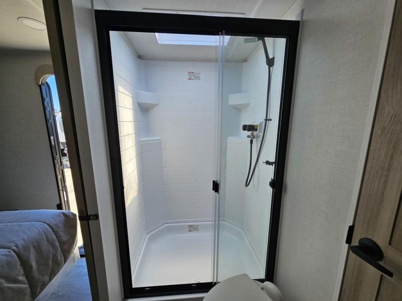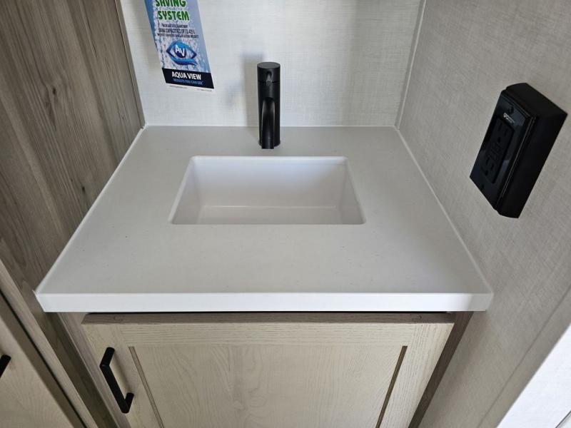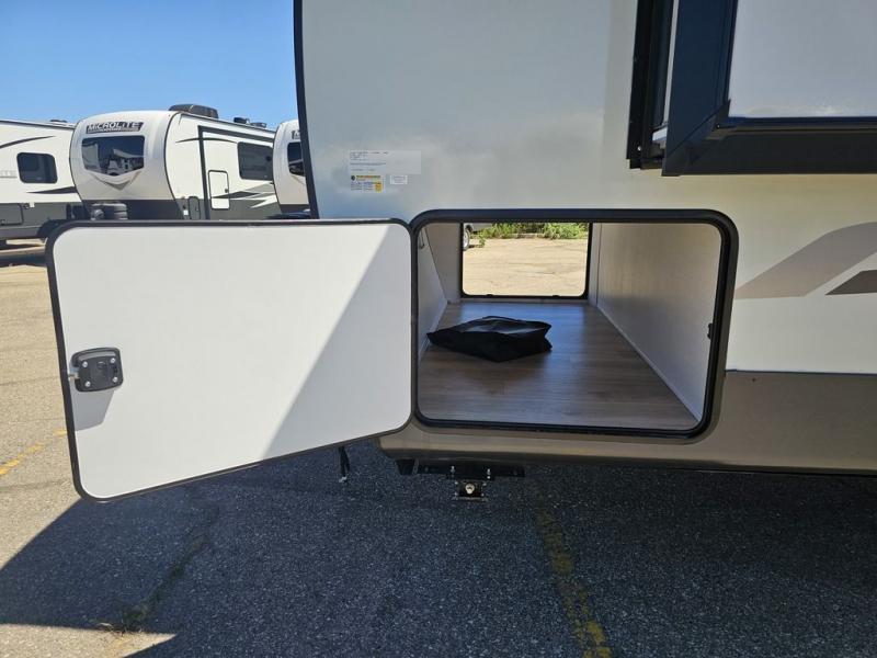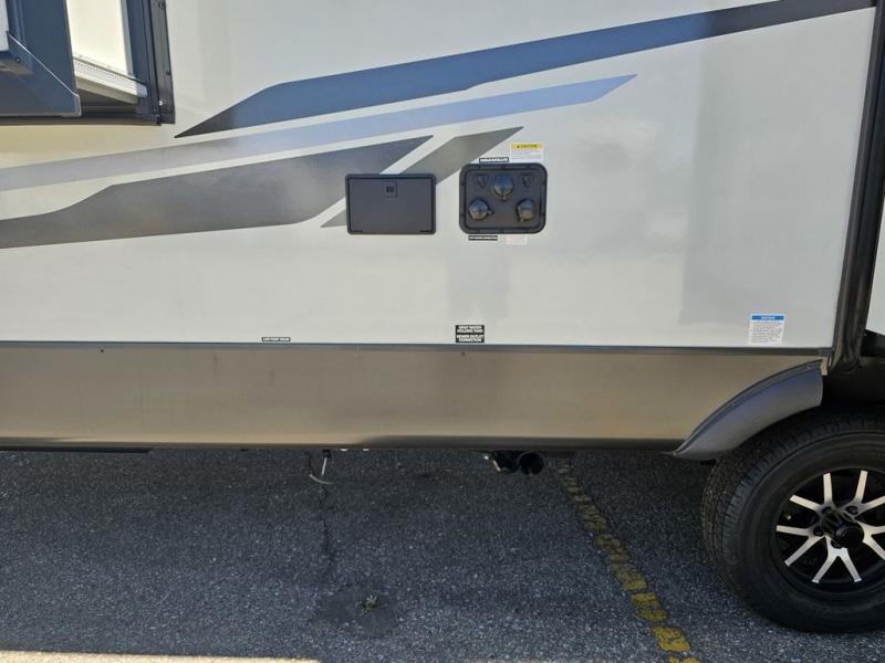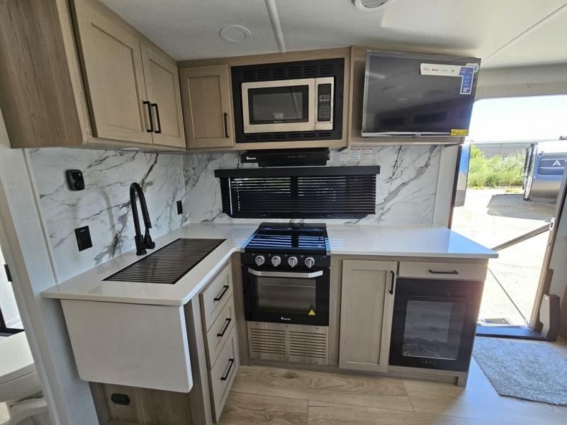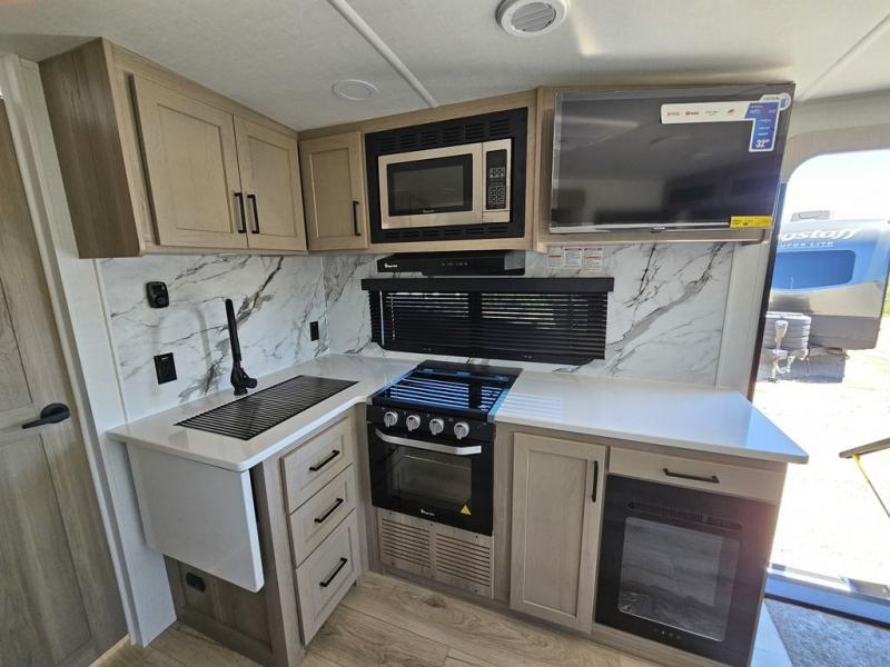 It will be so easy to enjoy time at the campground in this cozy travel trailer. The full kitchen includes a three burner gas oven, a microwave oven, and a 12V refrigerator to cook and store food, and the pantry will let you stock up on snacks. Your crew can get comfortable on the theater seat or around the rear U-shaped dinette, and there is a smart TV here to make it a movie night. The walk-thru bath will let you freshen up each day, and the queen bed in the front bedroom is sure to bring comfort. You will also find one of the dual entry doors here for convenience plus a wardrobe slide out for more storage and floor space. The exterior is just as accommodating with its pass-thru storage, 2" receiver hitch, and 21' power awning!