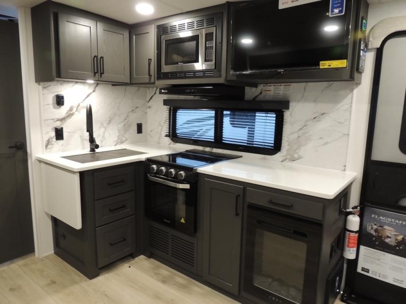 With any Flagstaff Super Lite travel trailer by Forest River, you can enjoy quality features with lightweight towing! The Climate Protection Package includes radiant foil in the front cap, underbelly, and slides, plus there are 12V thermostat-controlled heated tanks for added protection. The complete composite wall construction and 6-sided full-aluminum frame is ultra durable, and the RoadTech tire pressure monitoring adds safety. Each model also includes the Coast to Coast Package that comes with slam latch baggage doors, a high gloss fiberglass cap, Goodyear Endurance tires, plus a 200W solar panel with an optional additional 200W panel for more off grid capabilities. Inside, you'll love the roller shades, solid surface kitchen countertops, a shower miser system, and many more comforts!