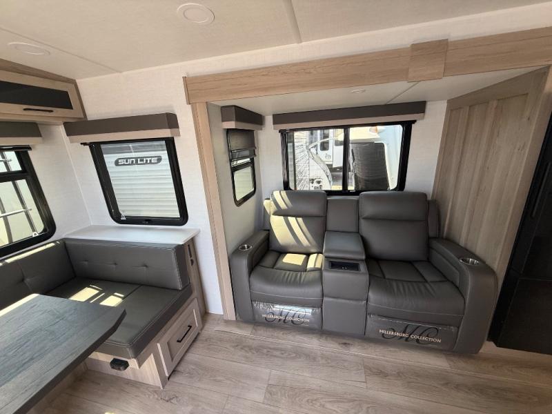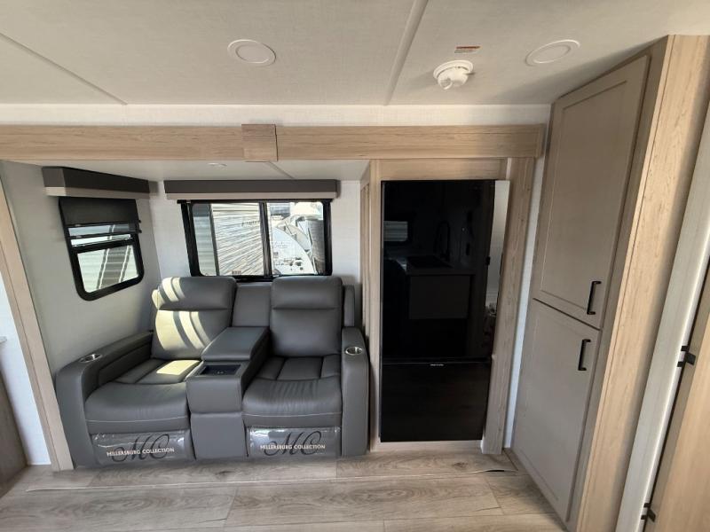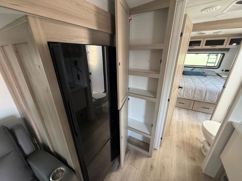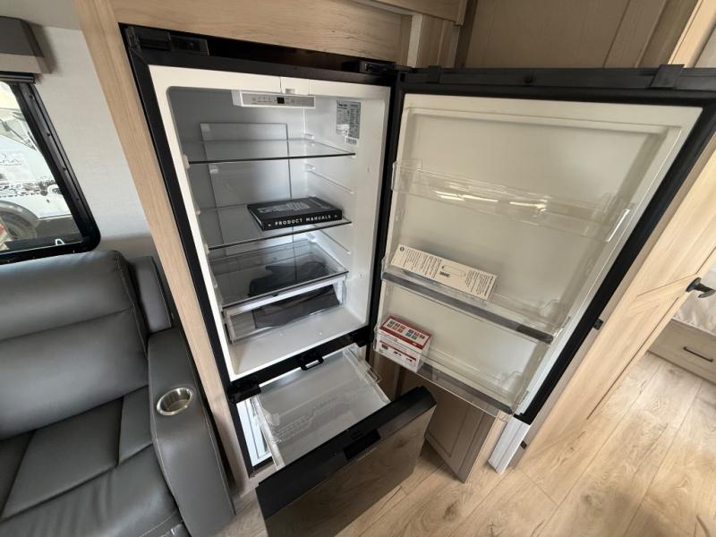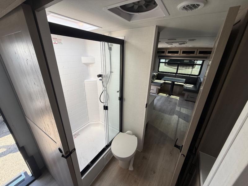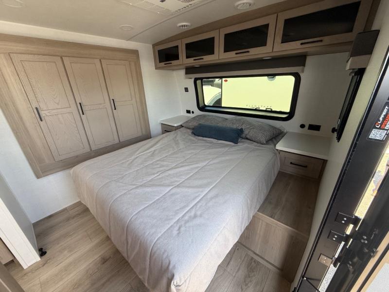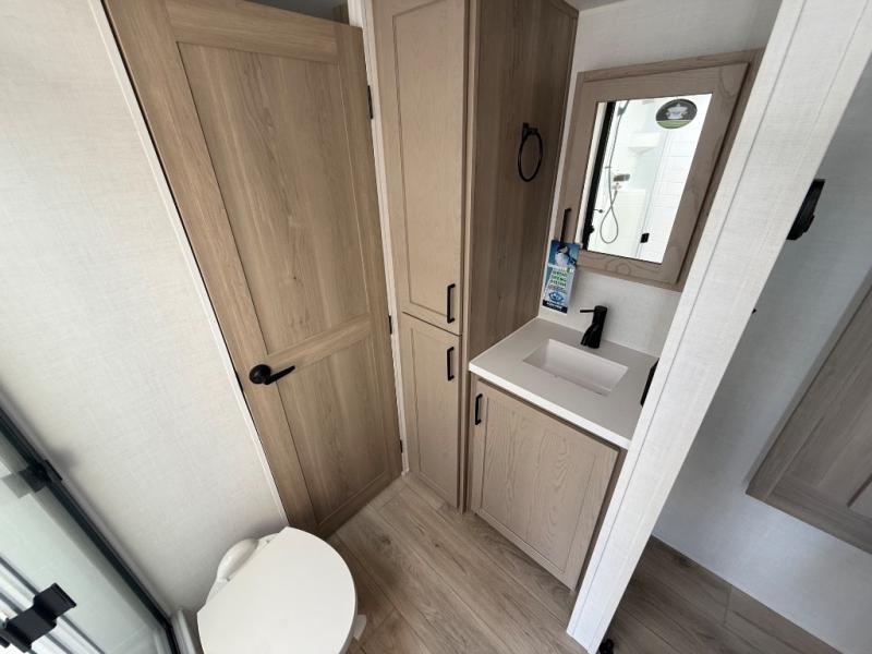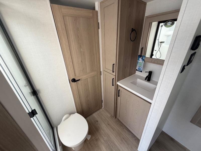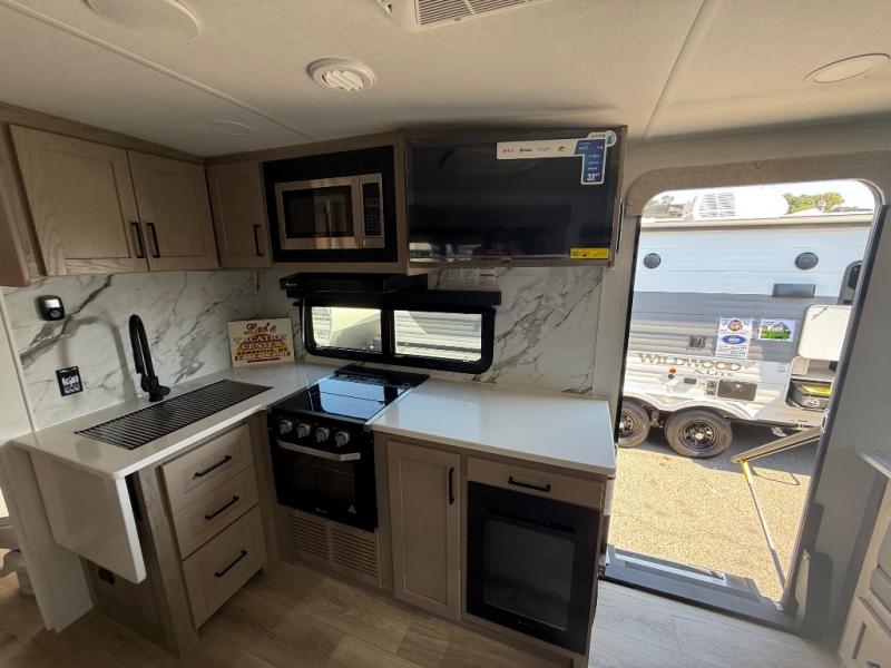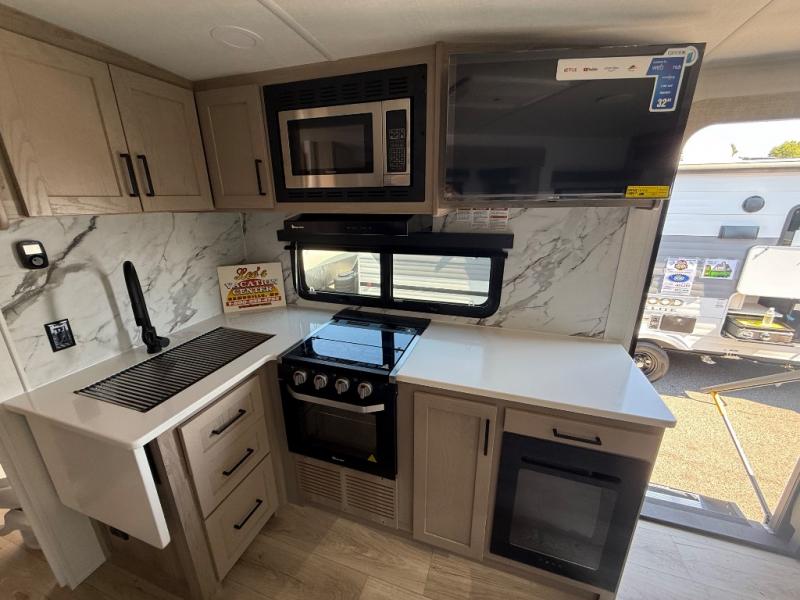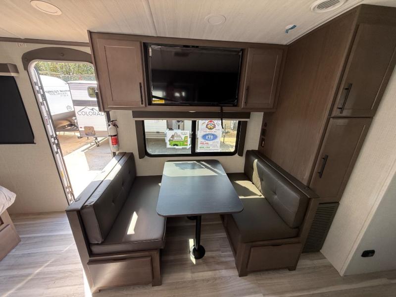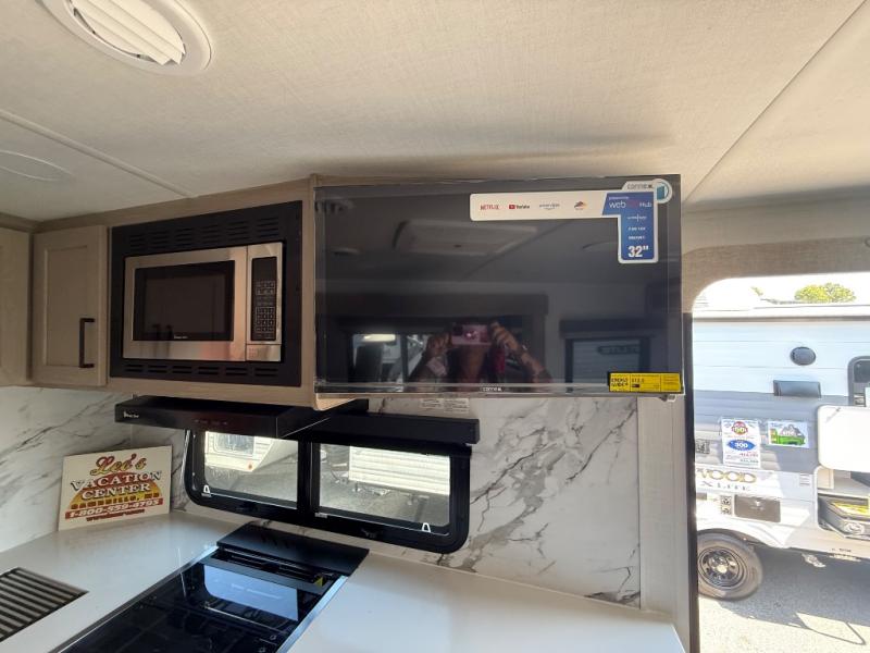 It will be so easy to enjoy time at the campground in this cozy travel trailer. The full kitchen includes a three burner gas oven, a microwave oven, and a 12V refrigerator to cook and store food, and the pantry will let you stock up on snacks. Your crew can get comfortable on the theater seat or around the rear U-shaped dinette, and there is a smart TV here to make it a movie night. The walk-thru bath will let you freshen up each day, and the queen bed in the front bedroom is sure to bring comfort. You will also find one of the dual entry doors here for convenience plus a wardrobe slide out for more storage and floor space. The exterior is just as accommodating with its pass-thru storage, 2" receiver hitch, and 21' power awning!