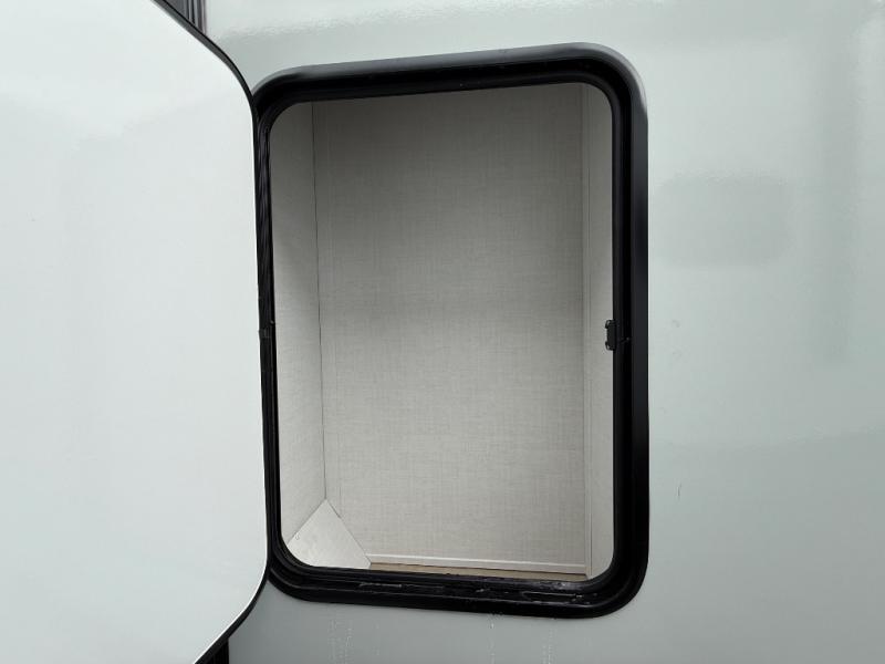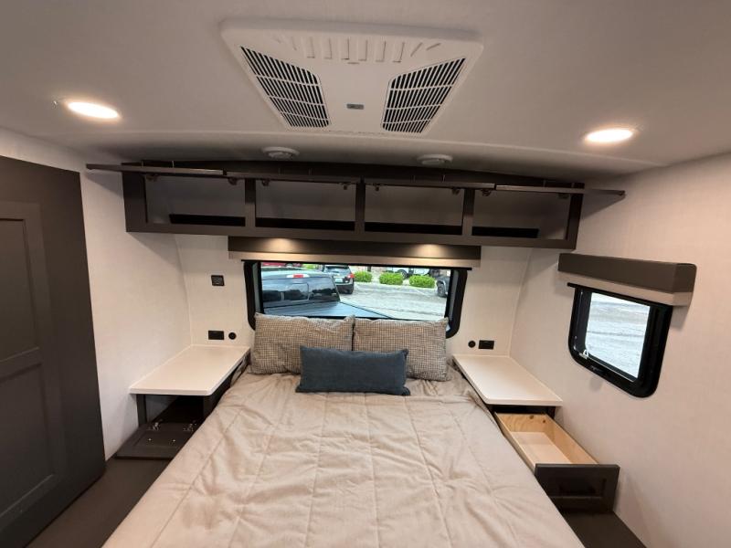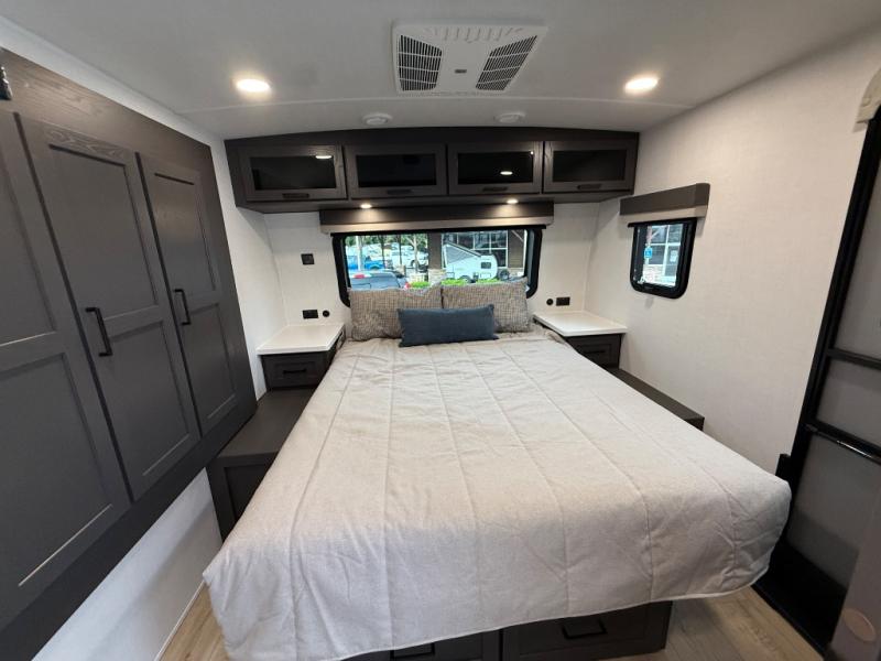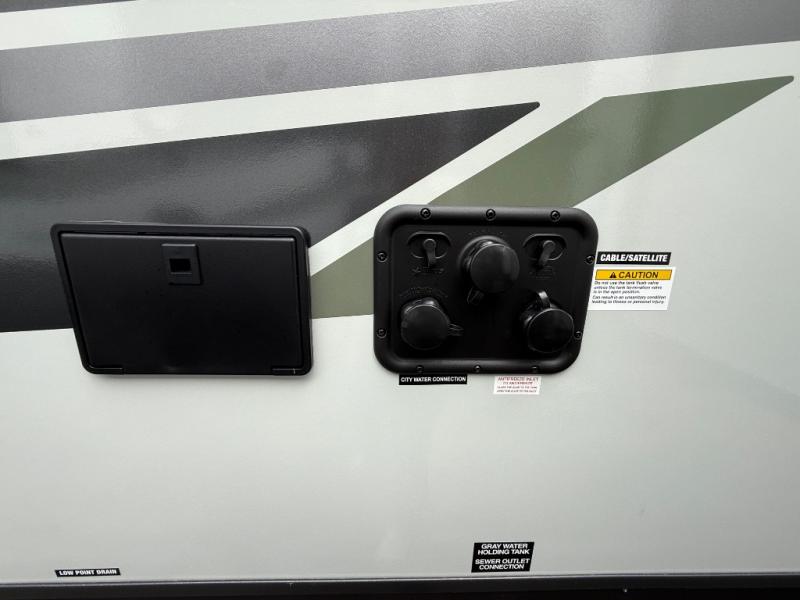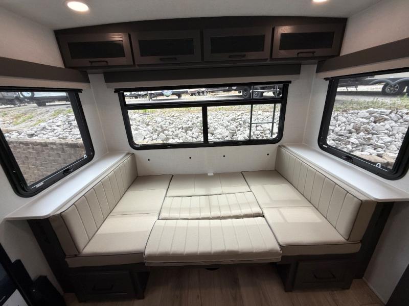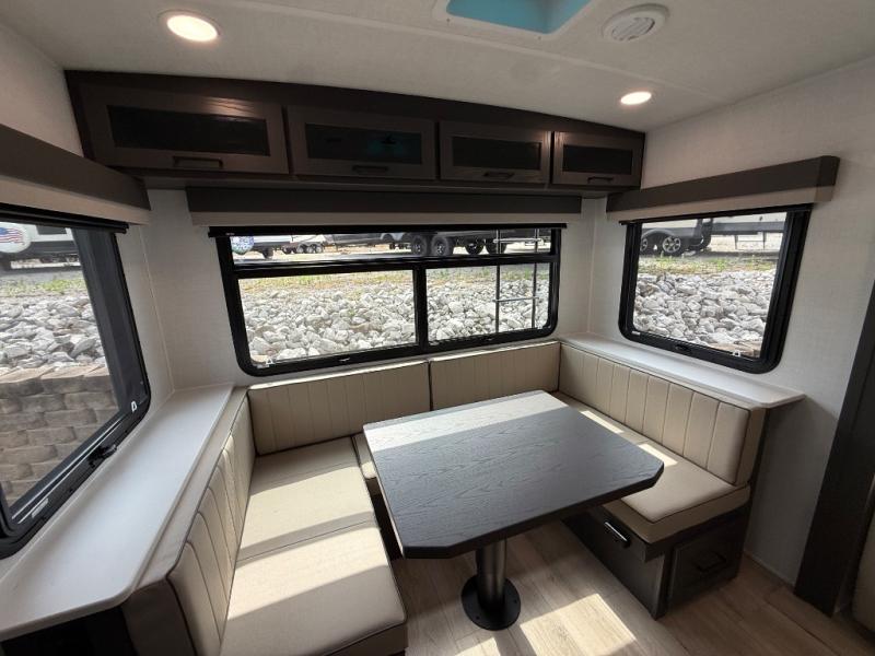 It will be so easy to enjoy time at the campground in this cozy travel trailer. The full kitchen includes a three burner gas oven, a microwave oven, and a 12V refrigerator to cook and store food, and the pantry will let you stock up on snacks. Your crew can get comfortable on the theater seat or around the rear U-shaped dinette, and there is a smart TV here to make it a movie night. The walk-thru bath will let you freshen up each day, and the queen bed in the front bedroom is sure to bring comfort. You will also find one of the dual entry doors here for convenience plus a wardrobe slide out for more storage and floor space. The exterior is just as accommodating with its pass-thru storage, 2" receiver hitch, and 21' power awning!