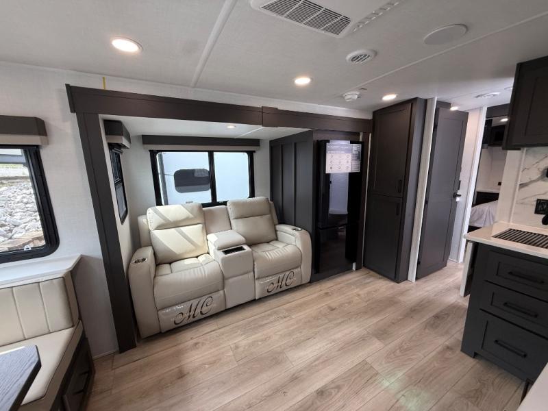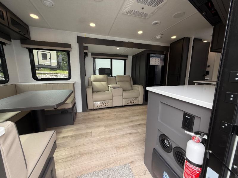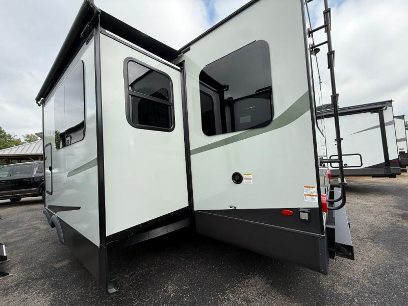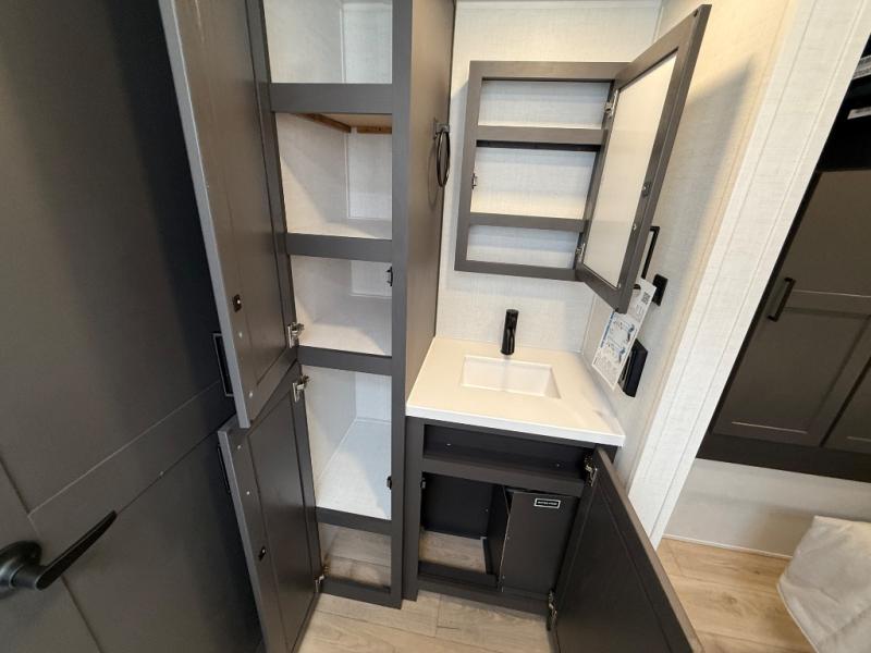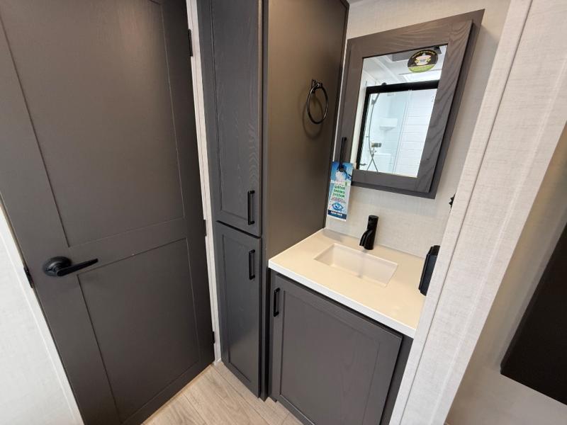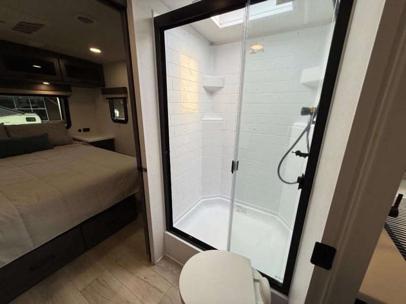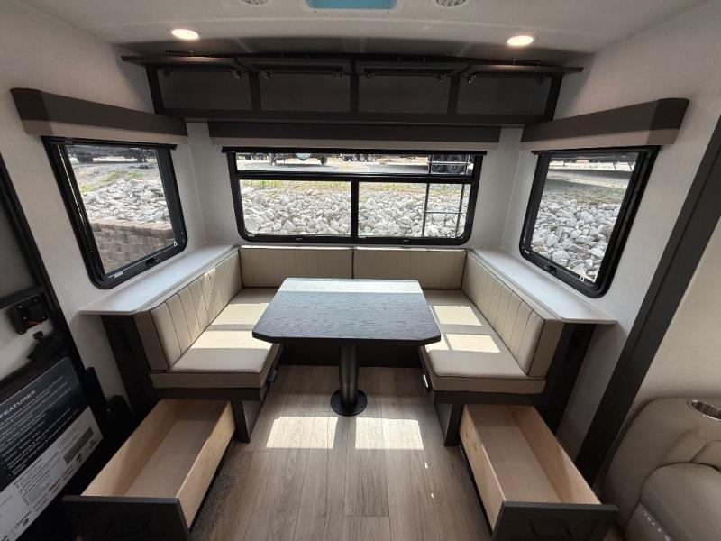 It will be so easy to enjoy time at the campground in this cozy travel trailer. The full kitchen includes a three burner gas oven, a microwave oven, and a 12V refrigerator to cook and store food, and the pantry will let you stock up on snacks. Your crew can get comfortable on the theater seat or around the rear U-shaped dinette, and there is a smart TV here to make it a movie night. The walk-thru bath will let you freshen up each day, and the queen bed in the front bedroom is sure to bring comfort. You will also find one of the dual entry doors here for convenience plus a wardrobe slide out for more storage and floor space. The exterior is just as accommodating with its pass-thru storage, 2" receiver hitch, and 21' power awning!