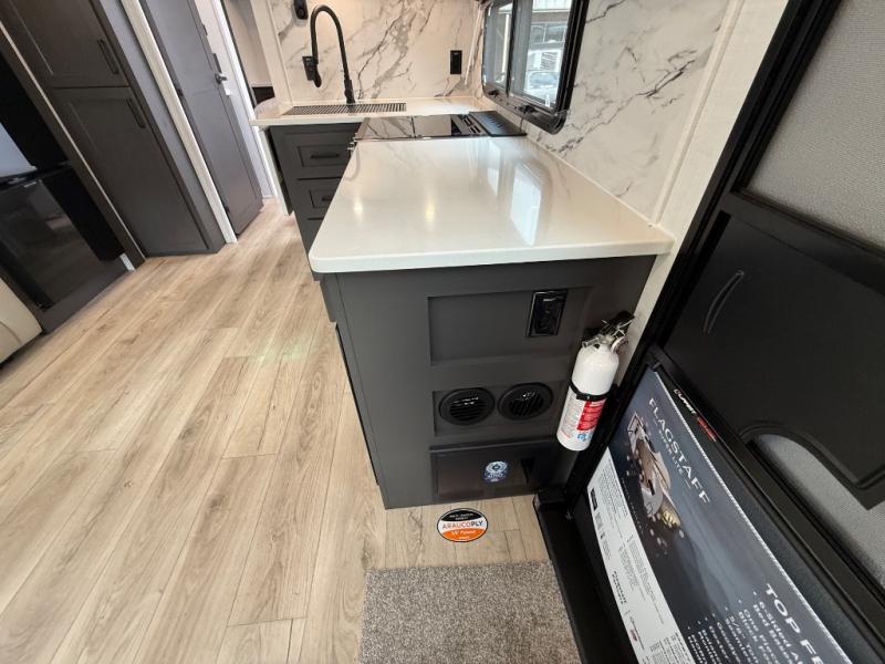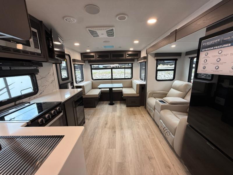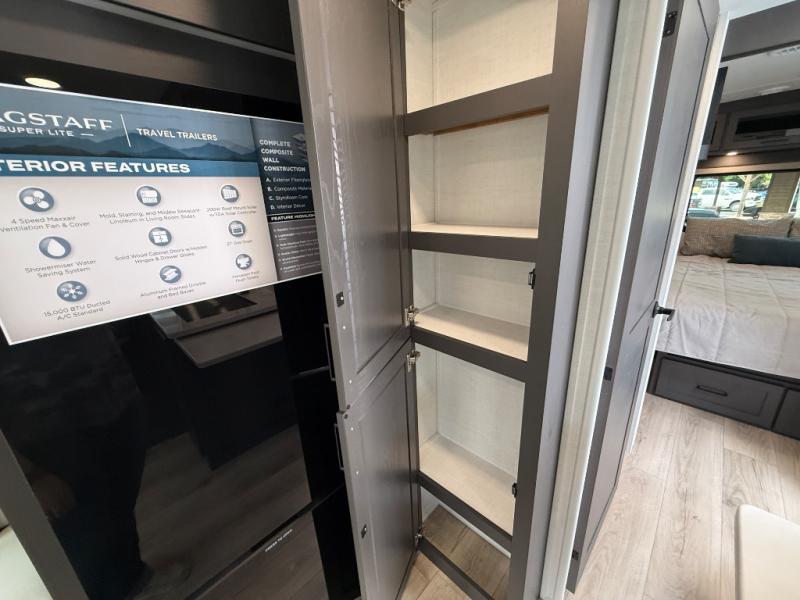 With any Flagstaff Super Lite travel trailer by Forest River, you can enjoy quality features with lightweight towing! The Climate Protection Package includes radiant foil in the front cap, underbelly, and slides, plus there are 12V thermostat-controlled heated tanks for added protection. The complete composite wall construction and 6-sided full-aluminum frame is ultra durable, and the RoadTech tire pressure monitoring adds safety. Each model also includes the Coast to Coast Package that comes with slam latch baggage doors, a high gloss fiberglass cap, Goodyear Endurance tires, plus a 200W solar panel with an optional additional 200W panel for more off grid capabilities. Inside, you'll love the roller shades, solid surface kitchen countertops, a shower miser system, and many more comforts!