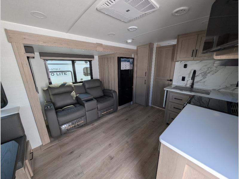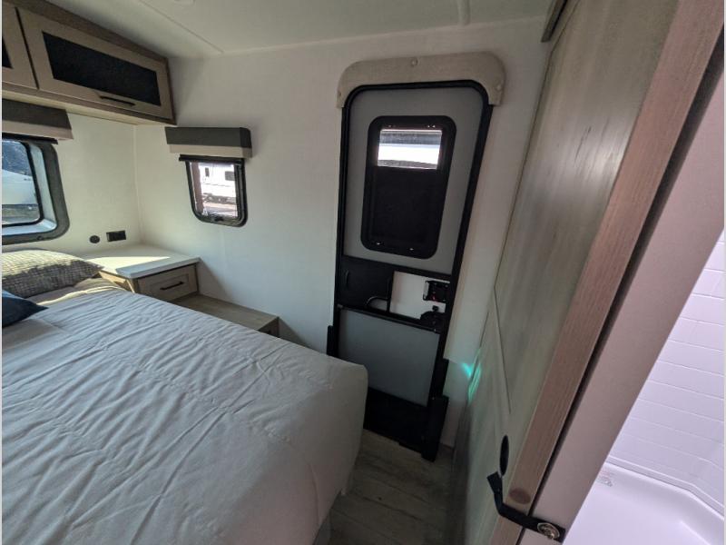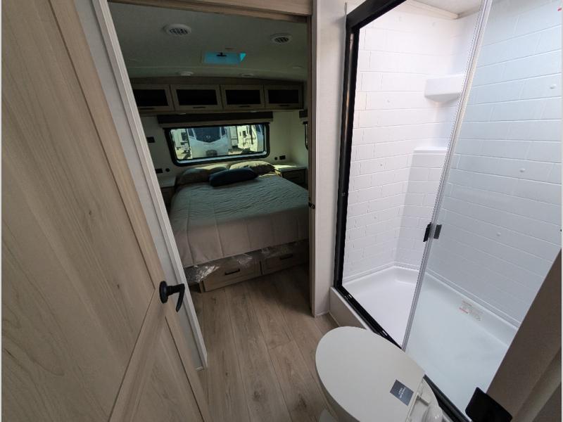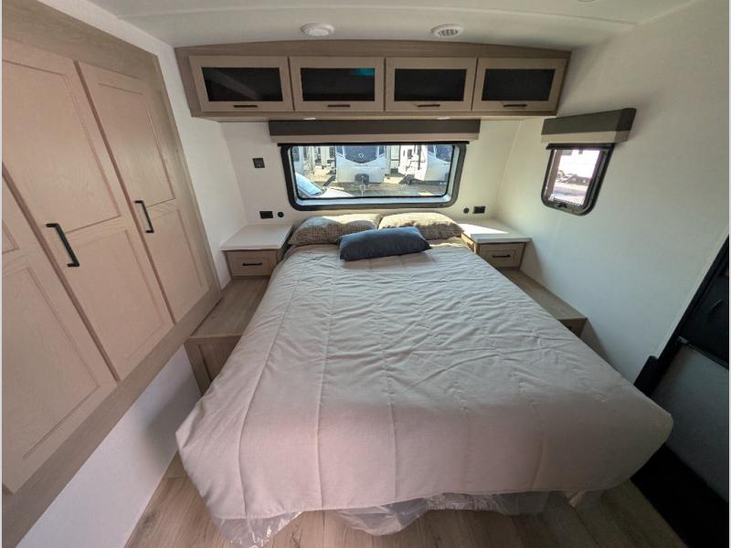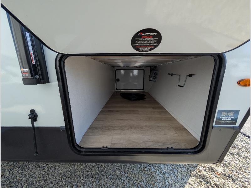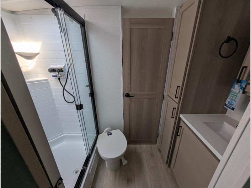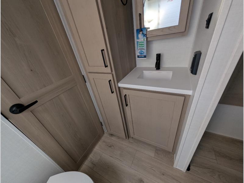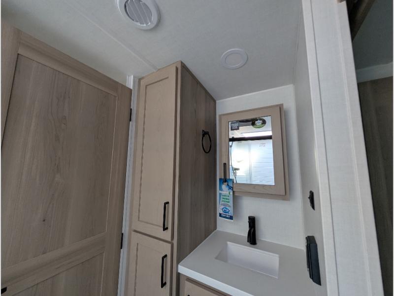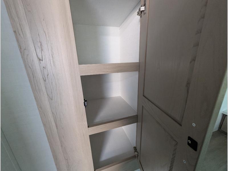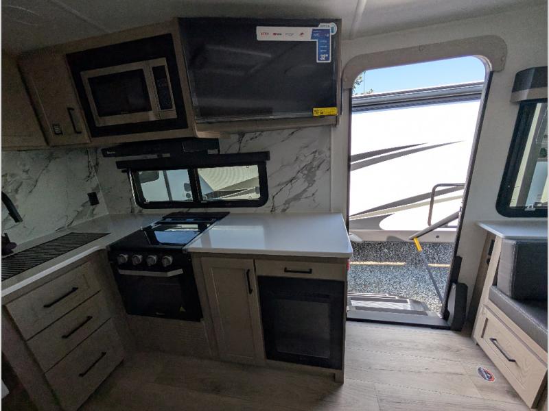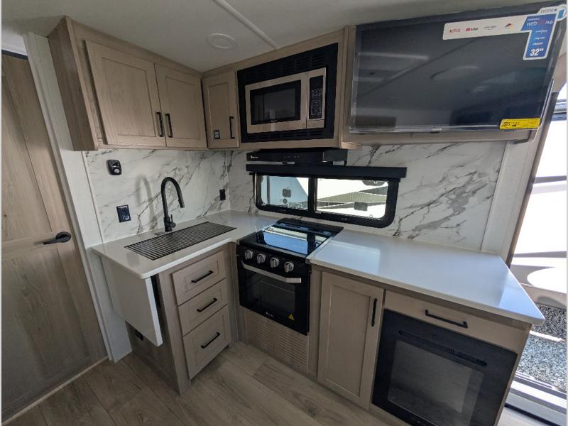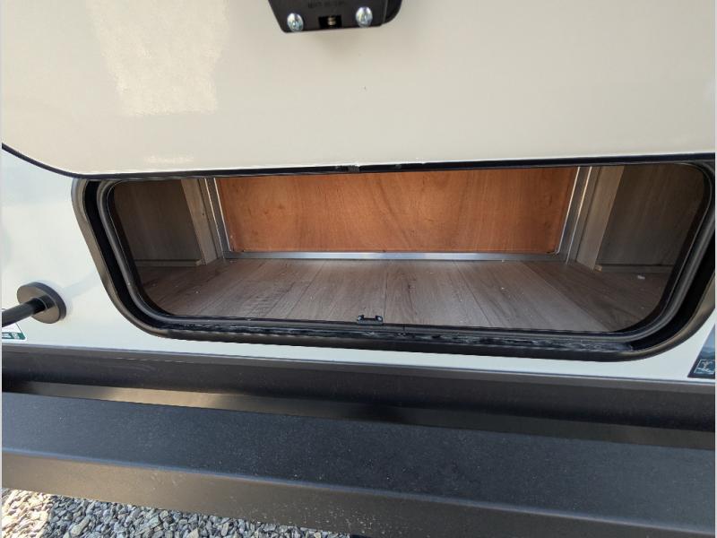 It will be so easy to enjoy time at the campground in this cozy travel trailer. The full kitchen includes a three burner gas oven, a microwave oven, and a 12V refrigerator to cook and store food, and the pantry will let you stock up on snacks. Your crew can get comfortable on the theater seat or around the rear U-shaped dinette, and there is a smart TV here to make it a movie night. The walk-thru bath will let you freshen up each day, and the queen bed in the front bedroom is sure to bring comfort. You will also find one of the dual entry doors here for convenience plus a wardrobe slide out for more storage and floor space. The exterior is just as accommodating with its pass-thru storage, 2" receiver hitch, and 21' power awning!