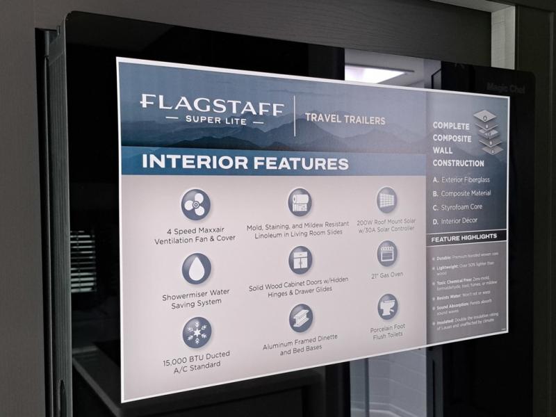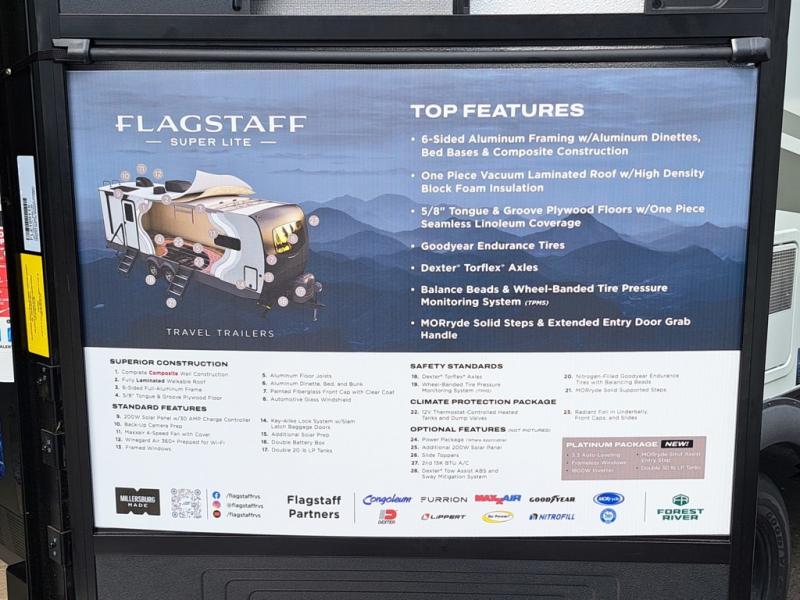 With any Flagstaff Super Lite travel trailer by Forest River, you can enjoy quality features with lightweight towing! The Climate Protection Package includes radiant foil in the front cap, underbelly, and slides, plus there are 12V thermostat-controlled heated tanks for added protection. The complete composite wall construction and 6-sided full-aluminum frame is ultra durable, and the RoadTech tire pressure monitoring adds safety. Each model also includes the Coast to Coast Package that comes with slam latch baggage doors, a high gloss fiberglass cap, Goodyear Endurance tires, plus a 200W solar panel with an optional additional 200W panel for more off grid capabilities. Inside, you'll love the roller shades, solid surface kitchen countertops, a shower miser system, and many more comforts!