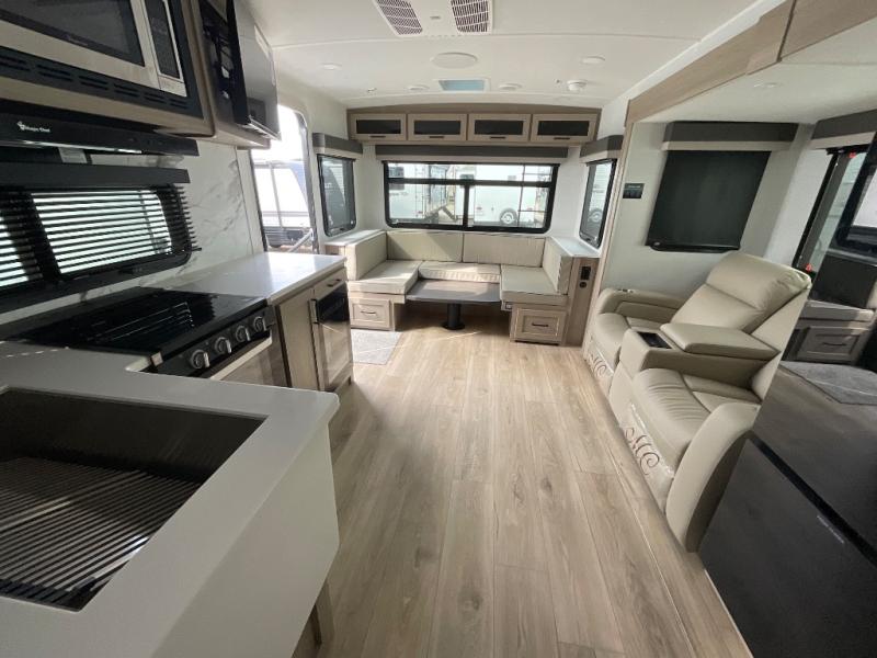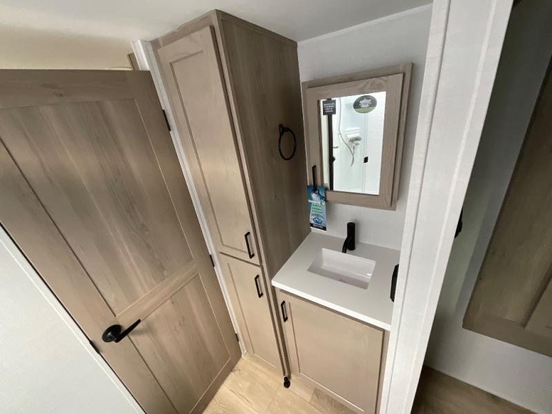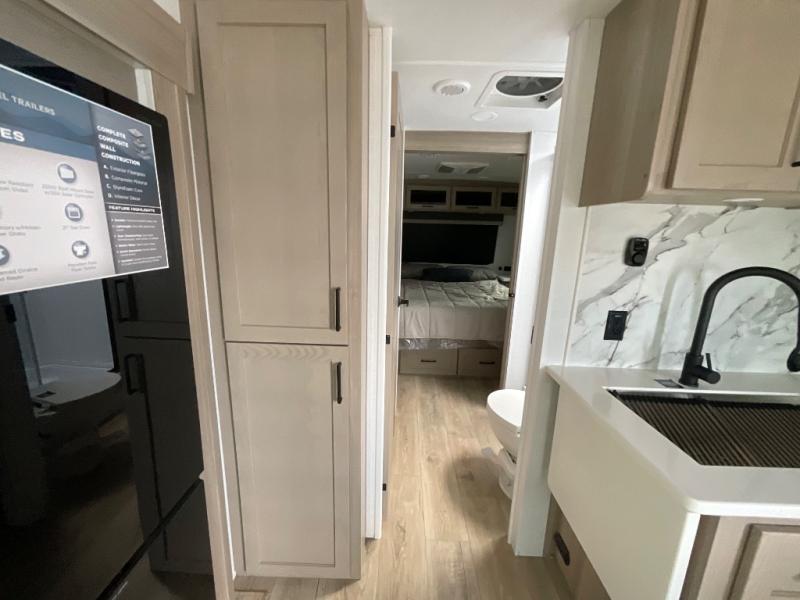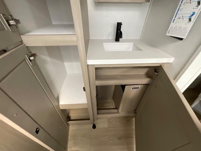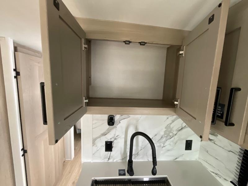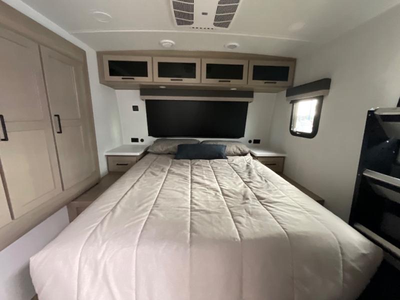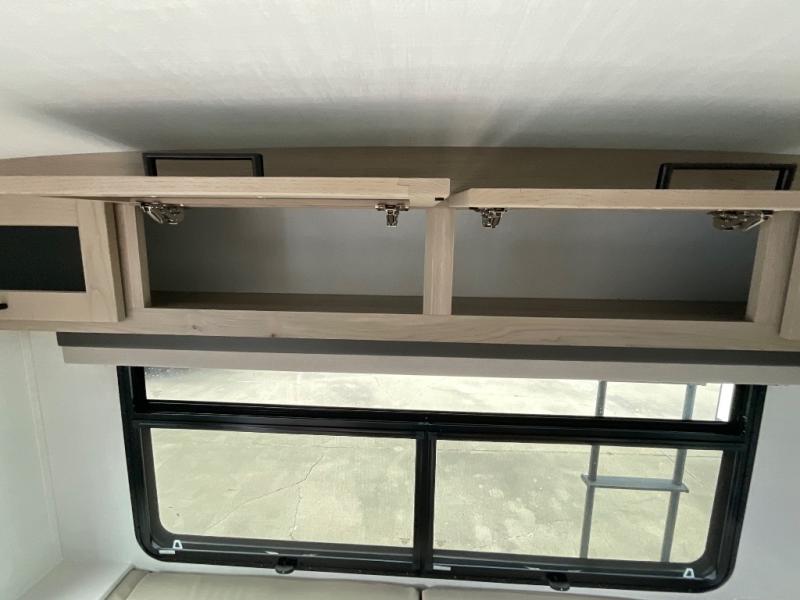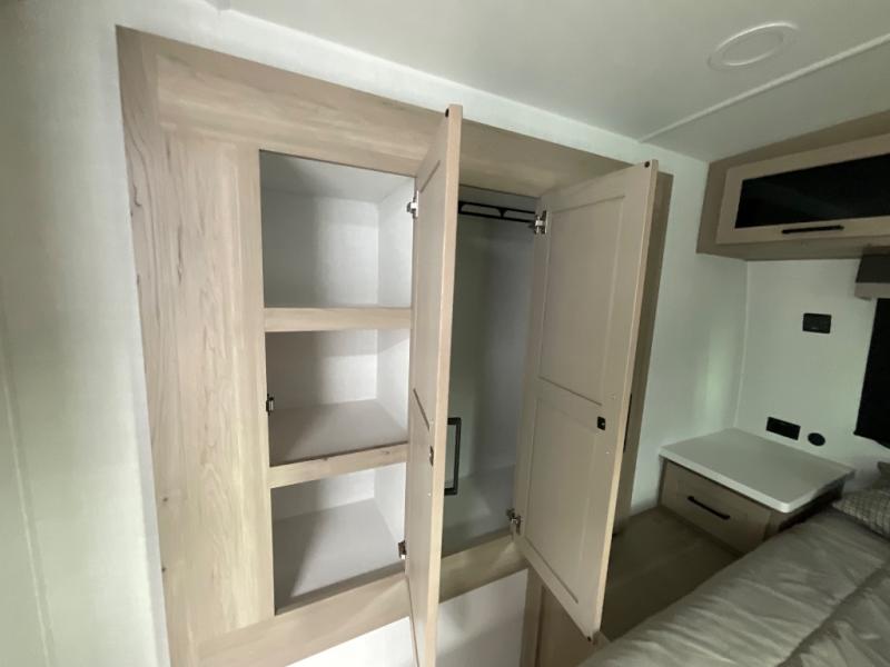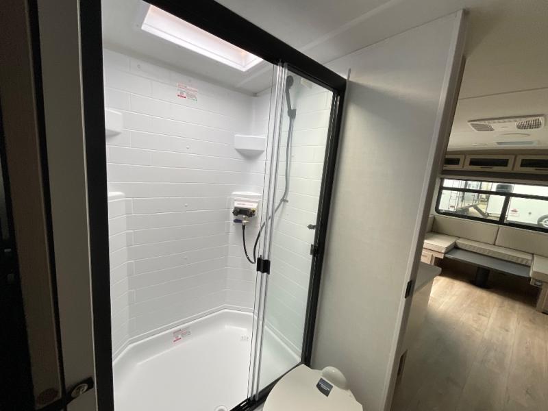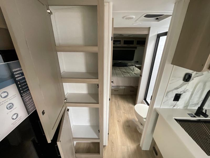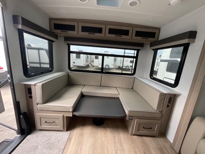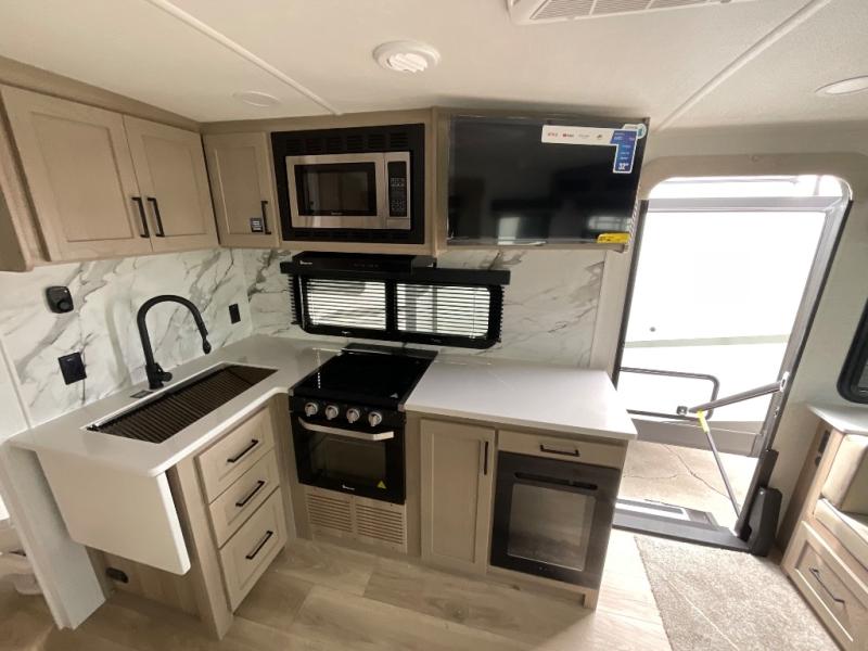 It will be so easy to enjoy time at the campground in this cozy travel trailer. The full kitchen includes a three burner gas oven, a microwave oven, and a 12V refrigerator to cook and store food, and the pantry will let you stock up on snacks. Your crew can get comfortable on the theater seat or around the rear U-shaped dinette, and there is a smart TV here to make it a movie night. The walk-thru bath will let you freshen up each day, and the queen bed in the front bedroom is sure to bring comfort. You will also find one of the dual entry doors here for convenience plus a wardrobe slide out for more storage and floor space. The exterior is just as accommodating with its pass-thru storage, 2" receiver hitch, and 21' power awning!