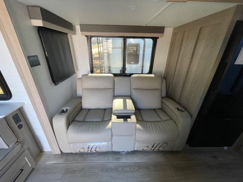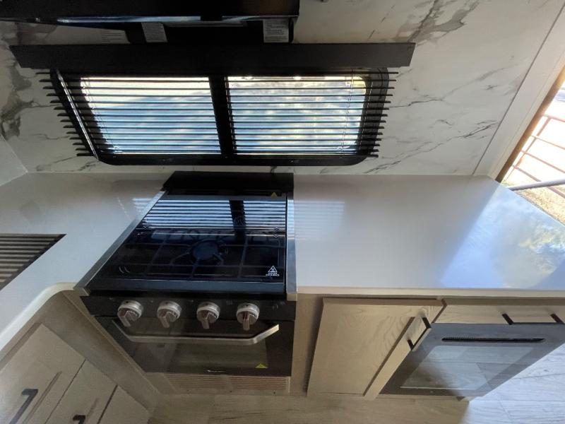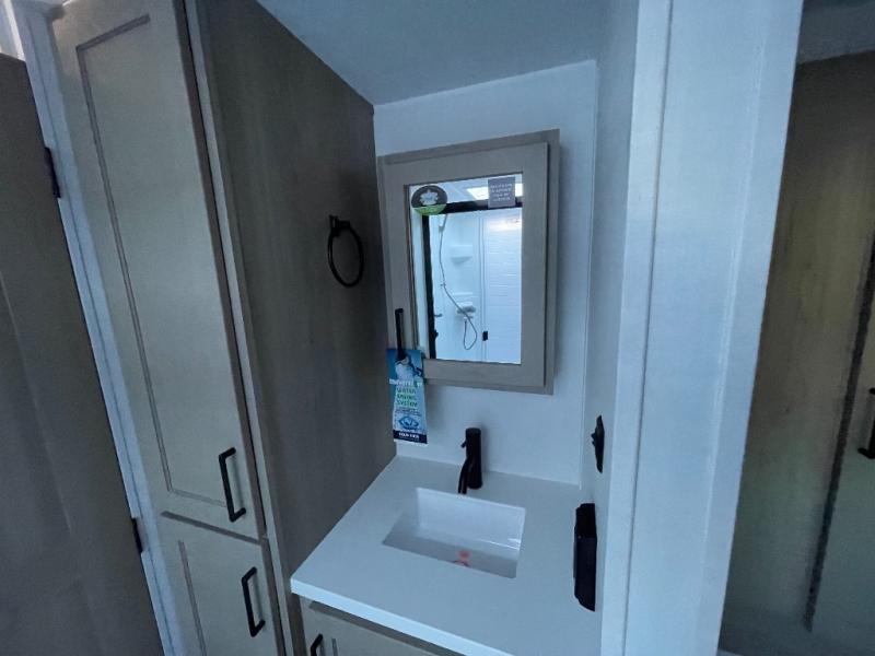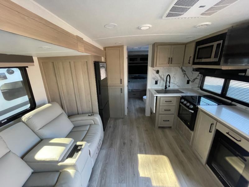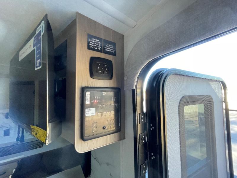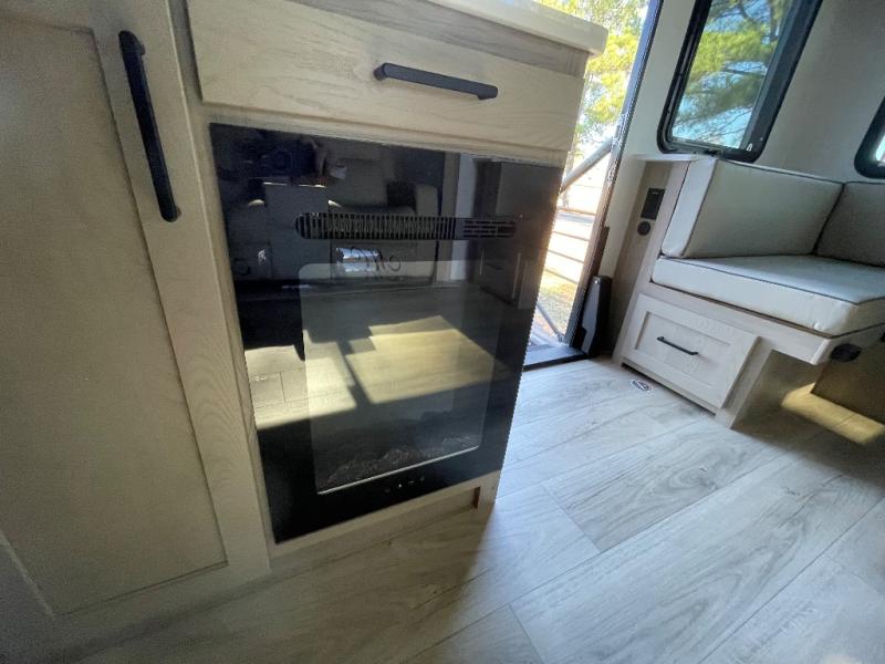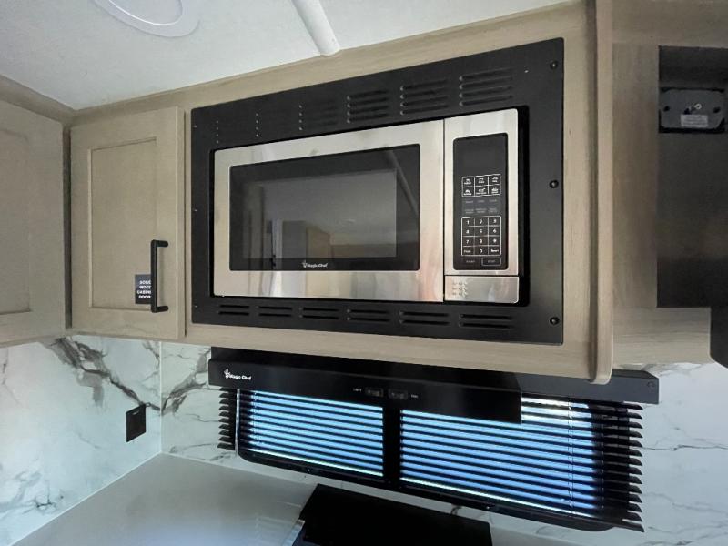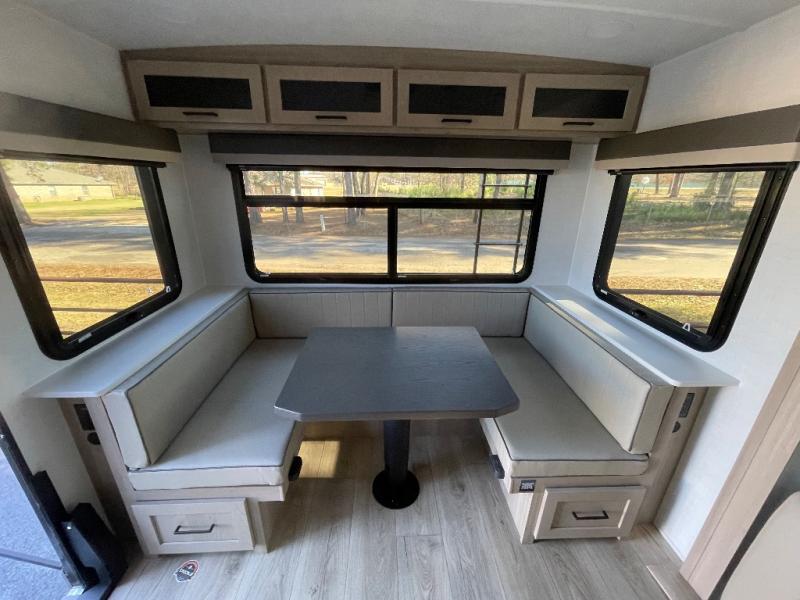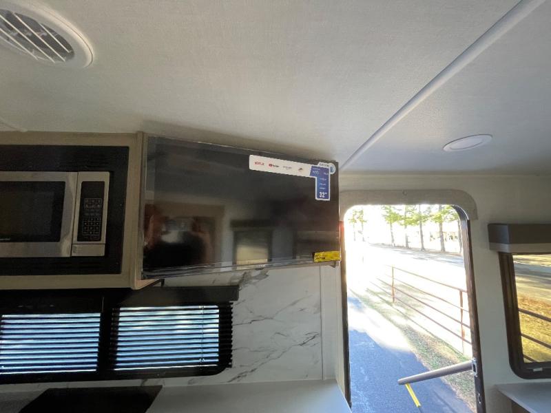 It will be so easy to enjoy time at the campground in this cozy travel trailer. The full kitchen includes a three burner gas oven, a microwave oven, and a 12V refrigerator to cook and store food, and the pantry will let you stock up on snacks. Your crew can get comfortable on the theater seat or around the rear U-shaped dinette, and there is a smart TV here to make it a movie night. The walk-thru bath will let you freshen up each day, and the queen bed in the front bedroom is sure to bring comfort. You will also find one of the dual entry doors here for convenience plus a wardrobe slide out for more storage and floor space. The exterior is just as accommodating with its pass-thru storage, 2" receiver hitch, and 21' power awning!