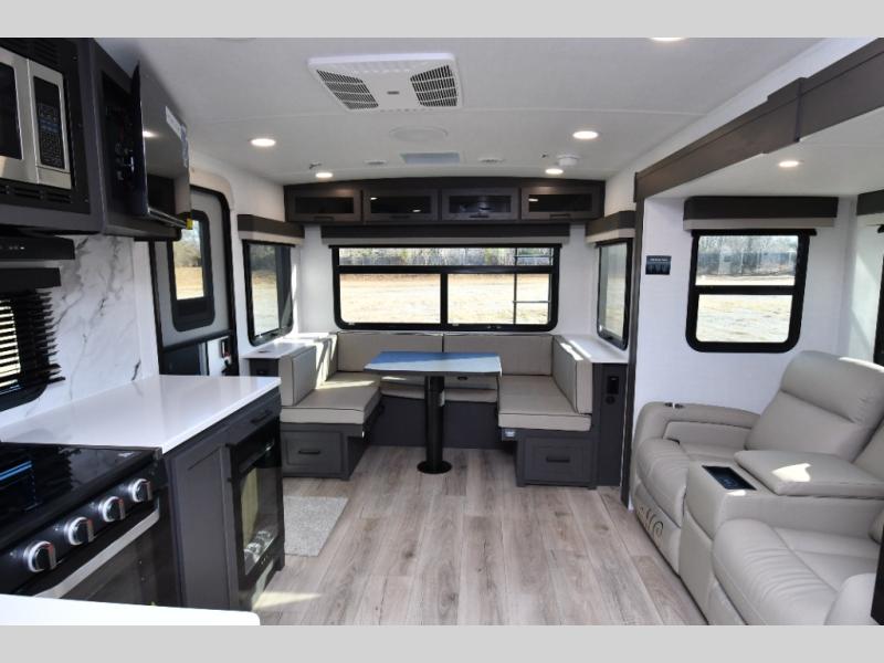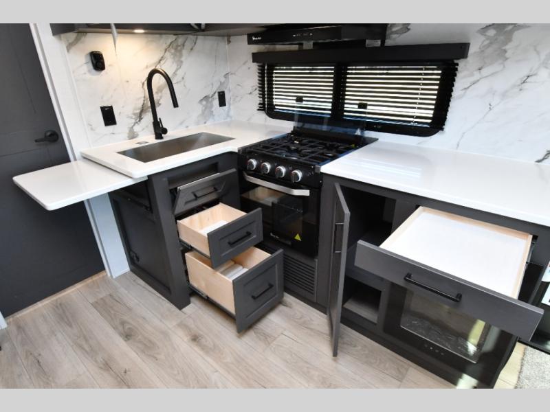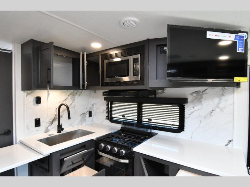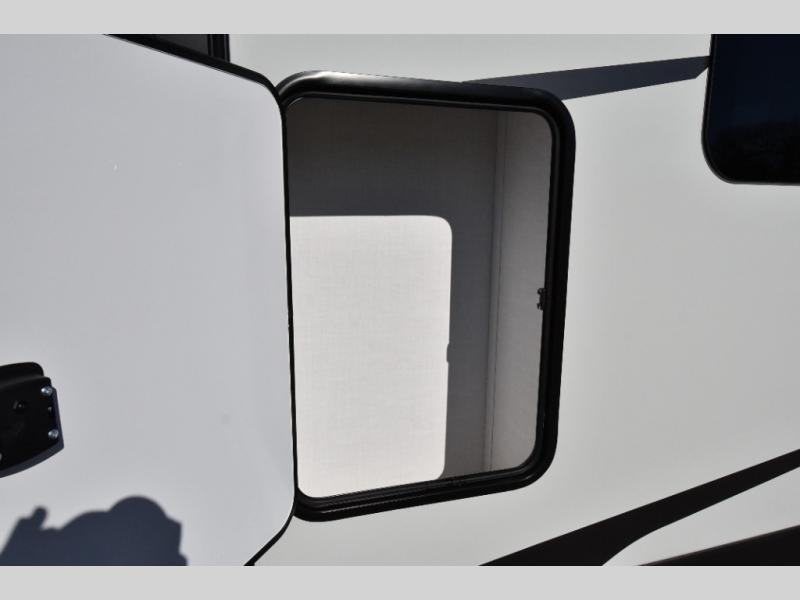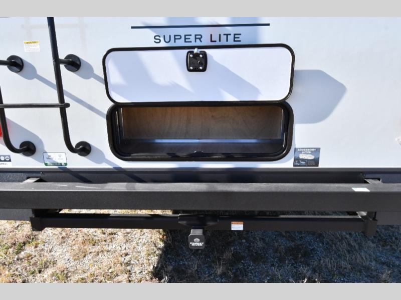 The kitchen is ready for real meals with a three-burner gas oven, microwave, 12V refrigerator, pantry storage, and solid surface countertops. Entertainment is covered with a smart TV, while the Coast to Coast Package and Platinum Package enhance durability and fit-and-finish throughout. Built for confident travel, this Super Lite features the Dexter Tow Assist ABS & Sway Mitigation System, front sliding storage tray, and composite construction. Added comfort comes from the 15K BTU second roof A/C, slide toppers, and climate protection features, while the 21' power awning creates a perfect outdoor living space.