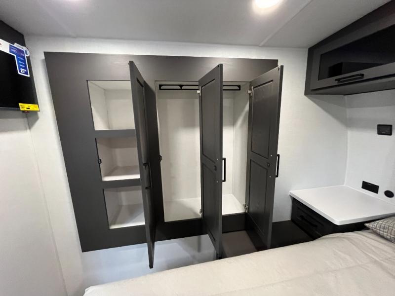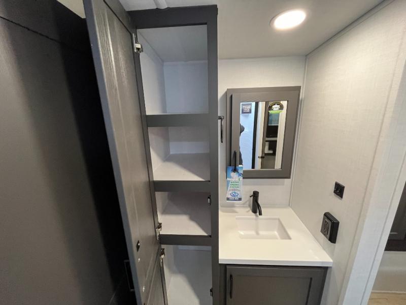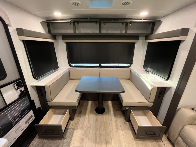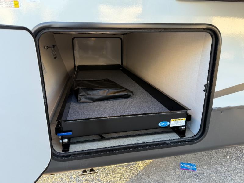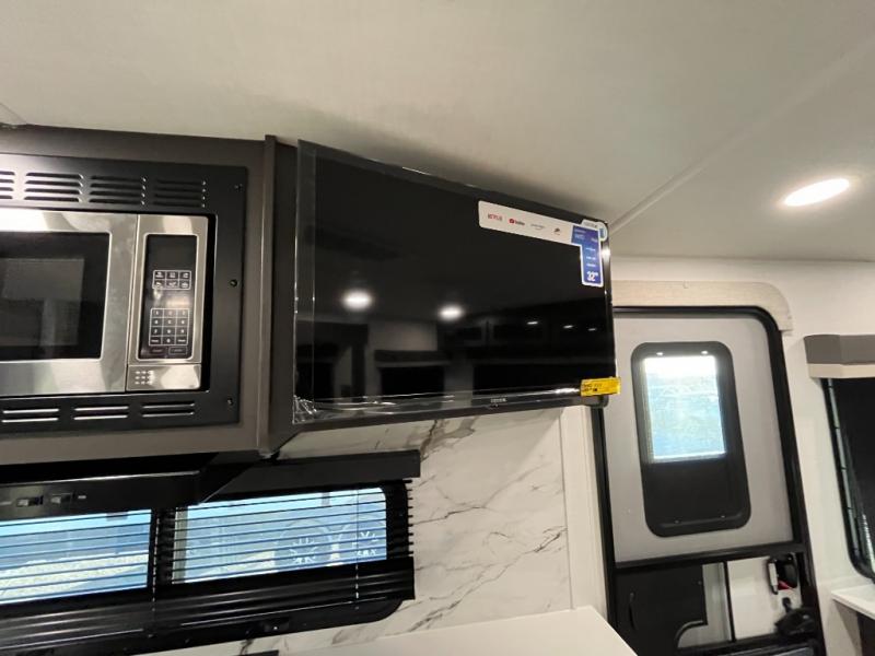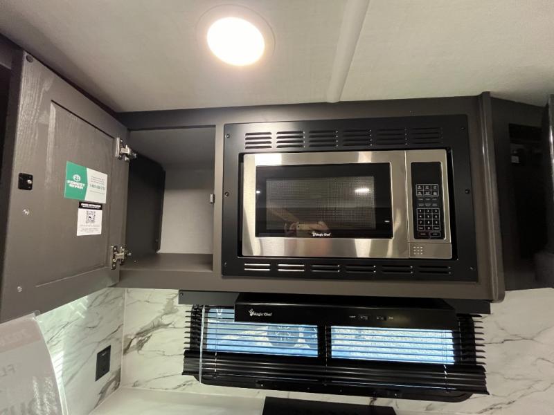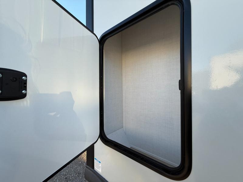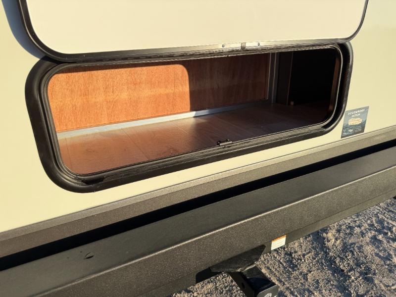It will be so easy to enjoy time at the campground in this cozy travel trailer. The full kitchen includes a three burner gas oven, a microwave oven, and a 12V refrigerator to cook and store food, and the pantry will let you stock up on snacks. Your crew can get comfortable on the theater seat or around the rear U-shaped dinette, and there is a smart TV here to make it a movie night. The walk-thru bath will let you freshen up each day, and the queen bed in the front bedroom is sure to bring comfort. You will also find one of the dual entry doors here for convenience plus a wardrobe slide out for more storage and floor space. The exterior is just as accommodating with its pass-thru storage, 2" receiver hitch, and 21' power awning!