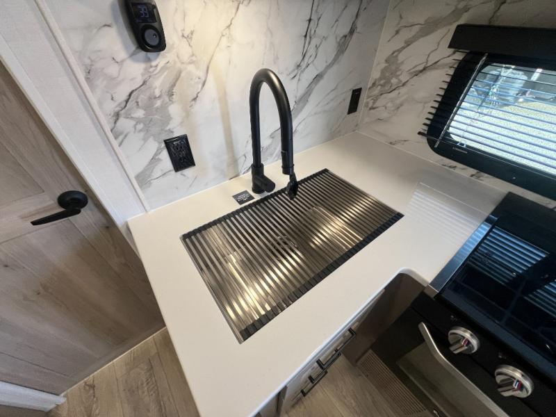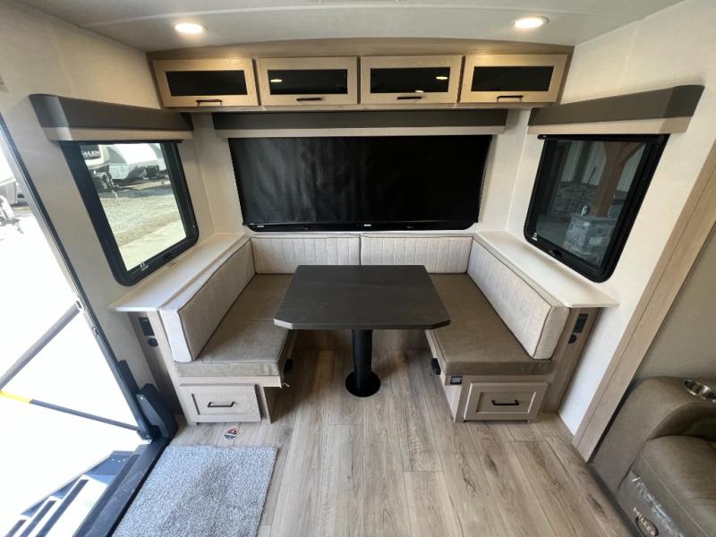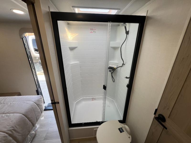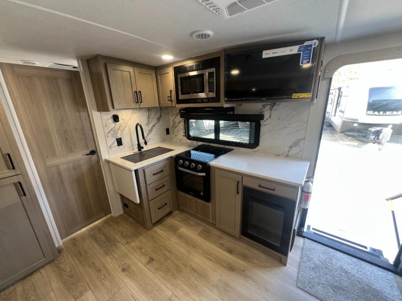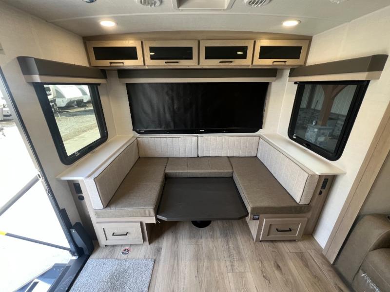 It will be so easy to enjoy time at the campground in this cozy travel trailer. The full kitchen includes a three burner gas oven, a microwave oven, and a 12V refrigerator to cook and store food, and the pantry will let you stock up on snacks. Your crew can get comfortable on the theater seat or around the rear U-shaped dinette, and there is a smart TV here to make it a movie night. The walk-thru bath will let you freshen up each day, and the queen bed in the front bedroom is sure to bring comfort. You will also find one of the dual entry doors here for convenience plus a wardrobe slide out for more storage and floor space. The exterior is just as accommodating with its pass-thru storage, 2" receiver hitch, and 21' power awning!